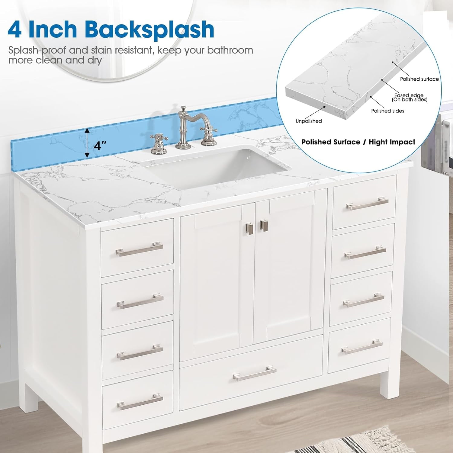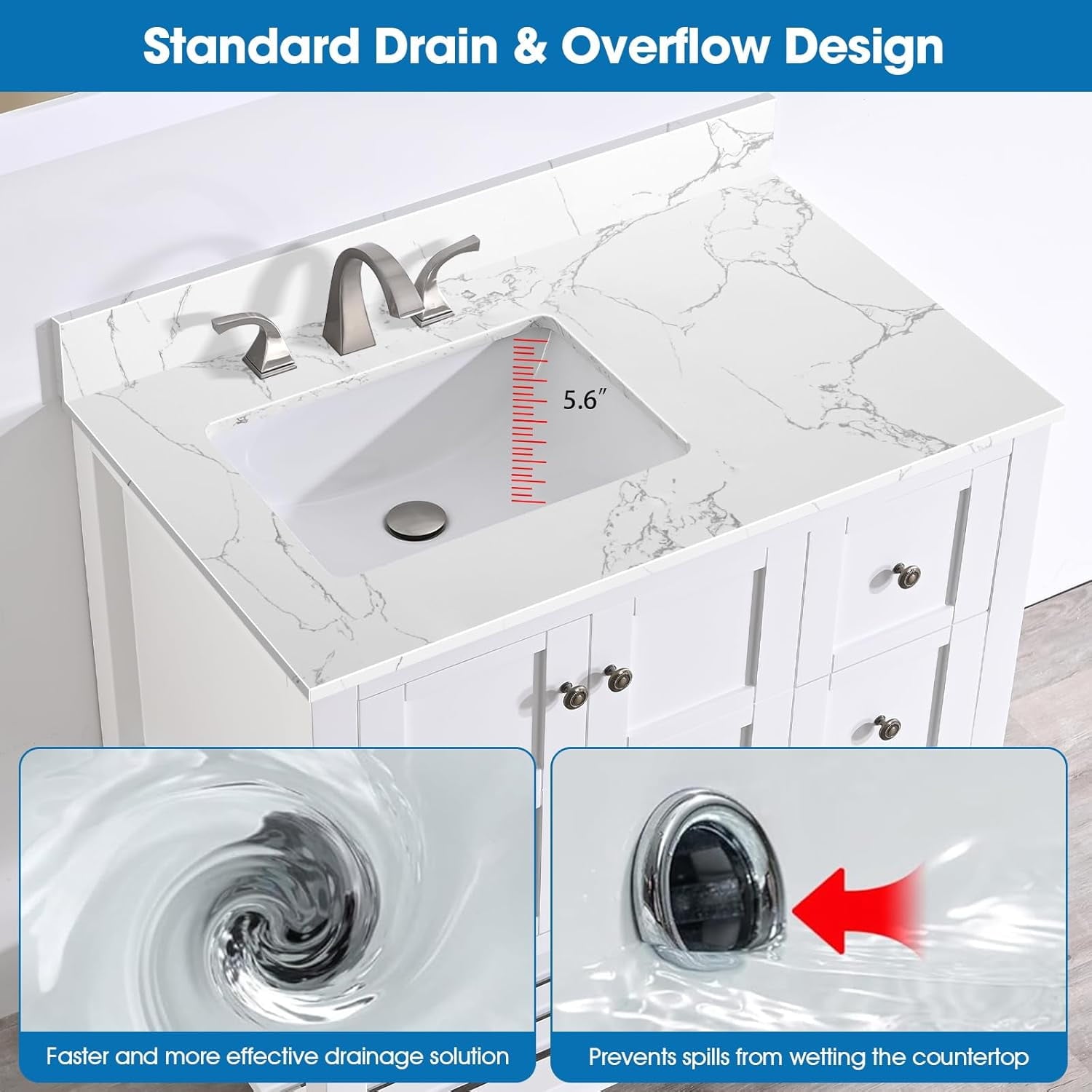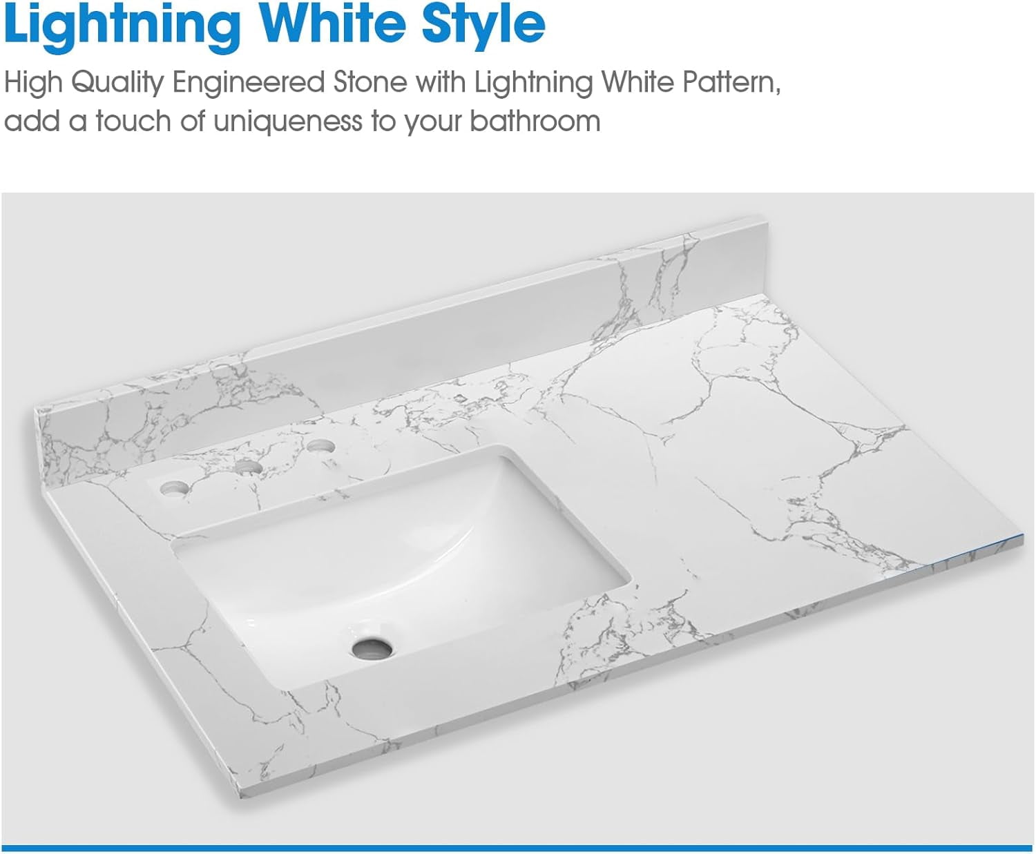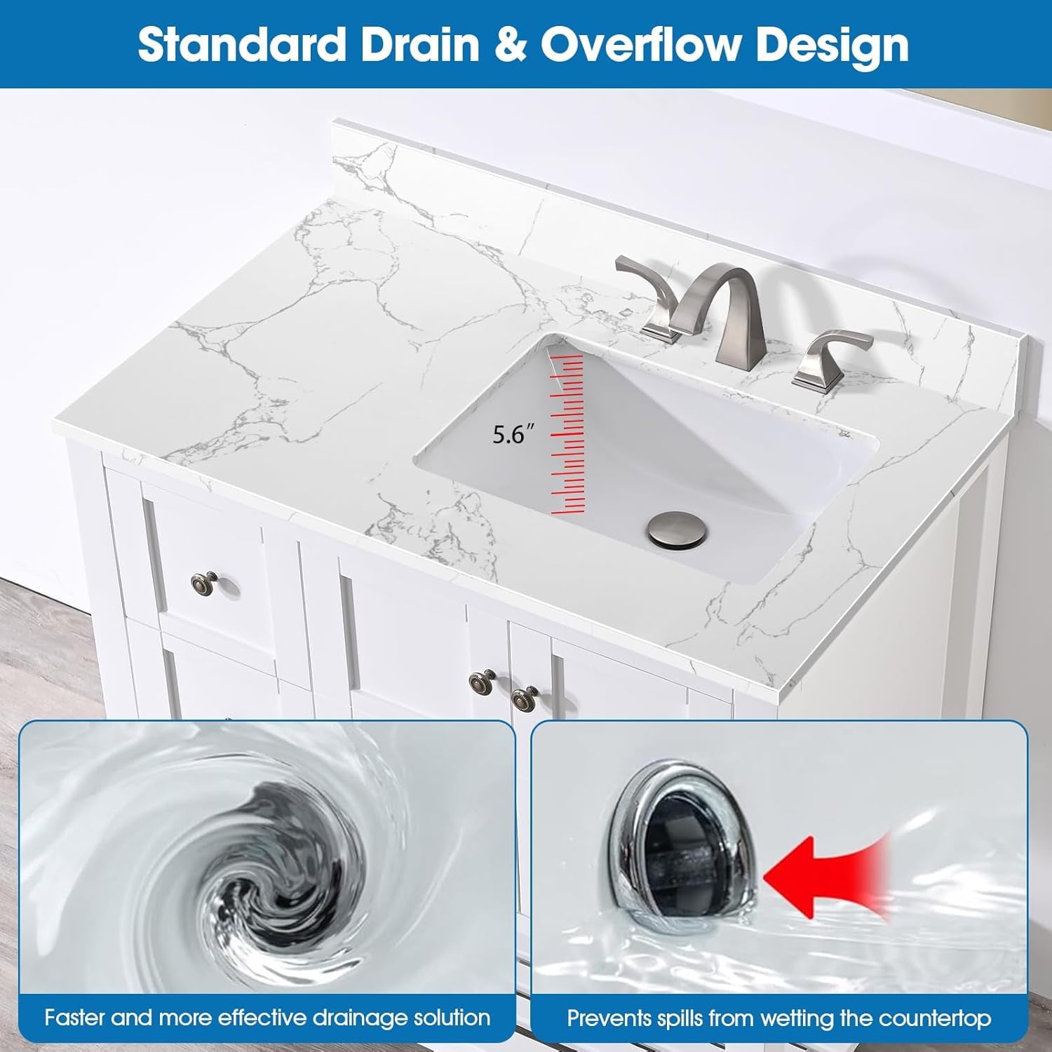- Universal Fit: Designed for standard 36″ W x 21″ D vanity cabinets, this 36″ x 22″ countertop features a 3/4″ thick surface and a 4″ backsplash for a seamless, built-in look.Luxurious & Durable: Made from high-quality engineered stone, this vanity top combines the elegance of marble with superior strength. Waterproof, scratch-resistant, and easy to maintain for long-lasting beauty.Spill Protection: The built-in 4″ backsplash and overflow sink hole help contain water splashes, keeping your bathroom cleaner and drier.Easy Installation: Pre-drilled for an 8″ widespread faucet and includes a pre-installed rectangular undermount ceramic sink (left-side placement) for a quick, hassle-free upgrade.Ready to Install: Includes the vanity top, ceramic sink, and 4″ backsplash. Ships in damage-resistant packaging for secure delivery.