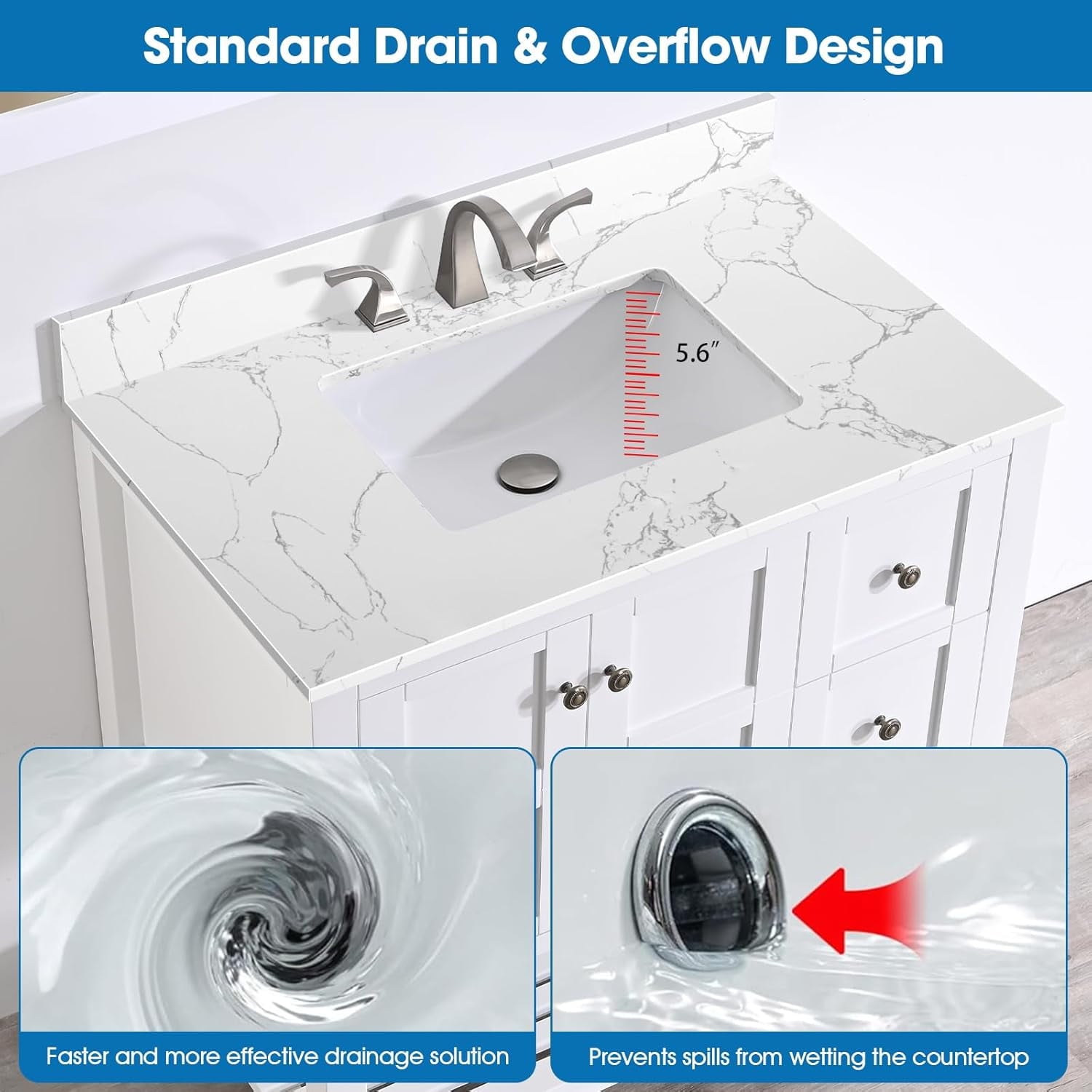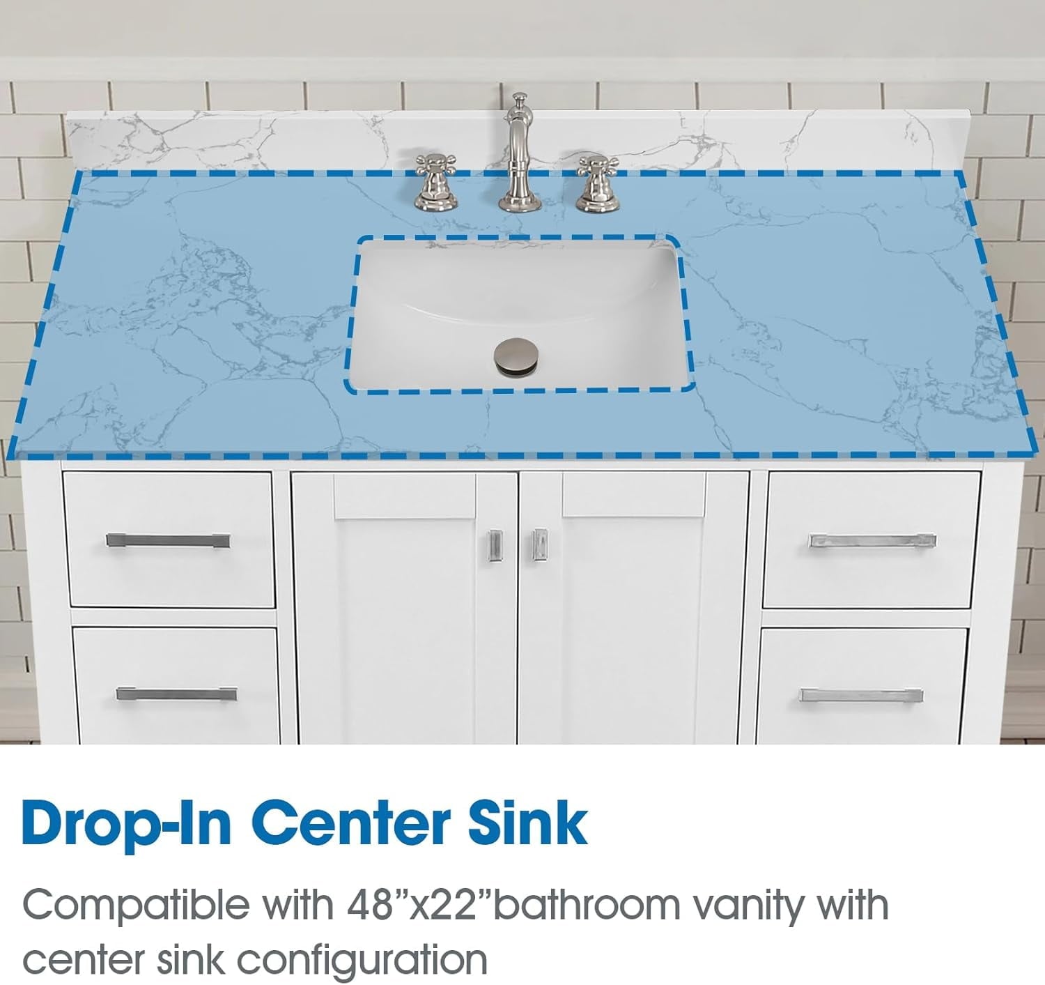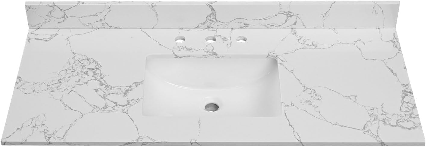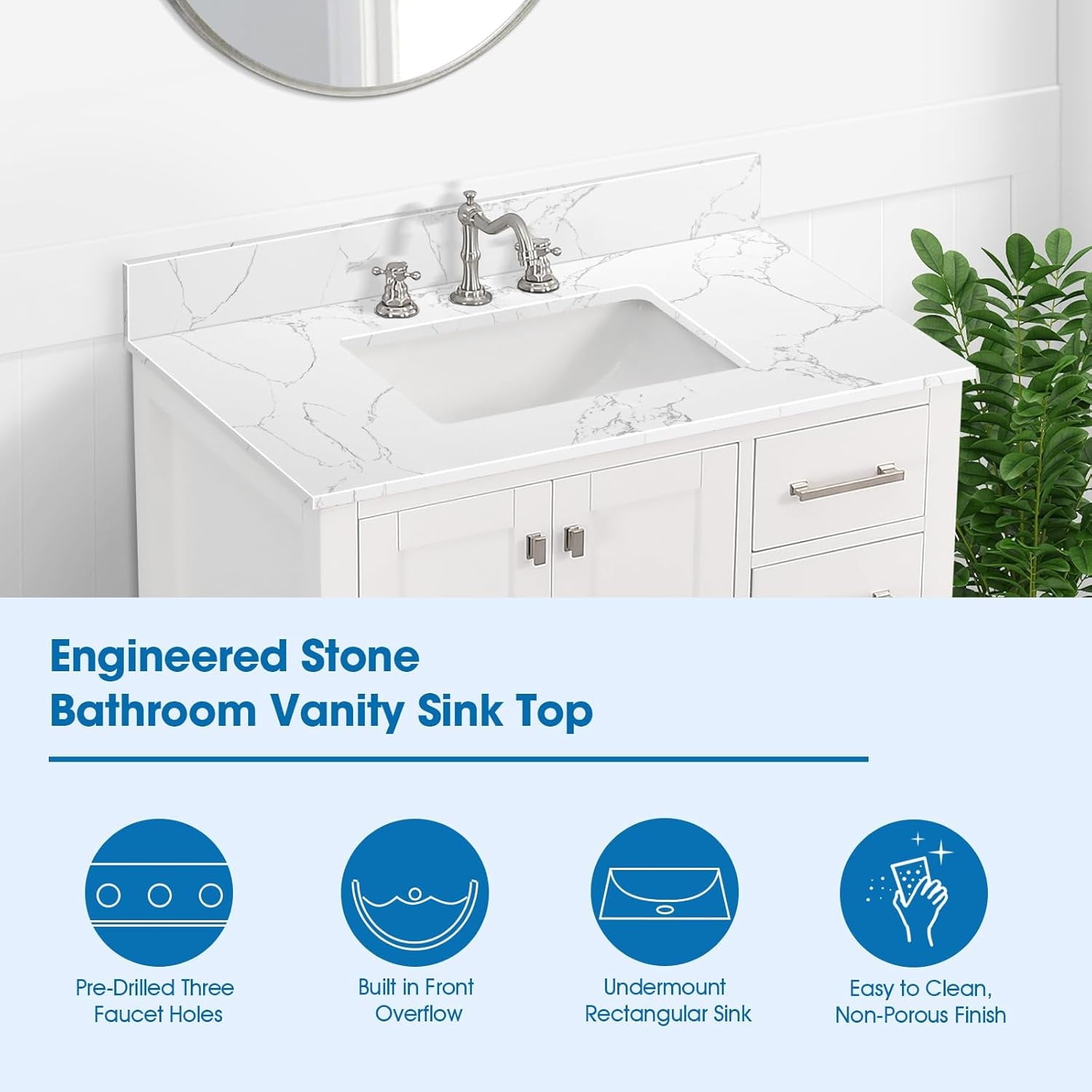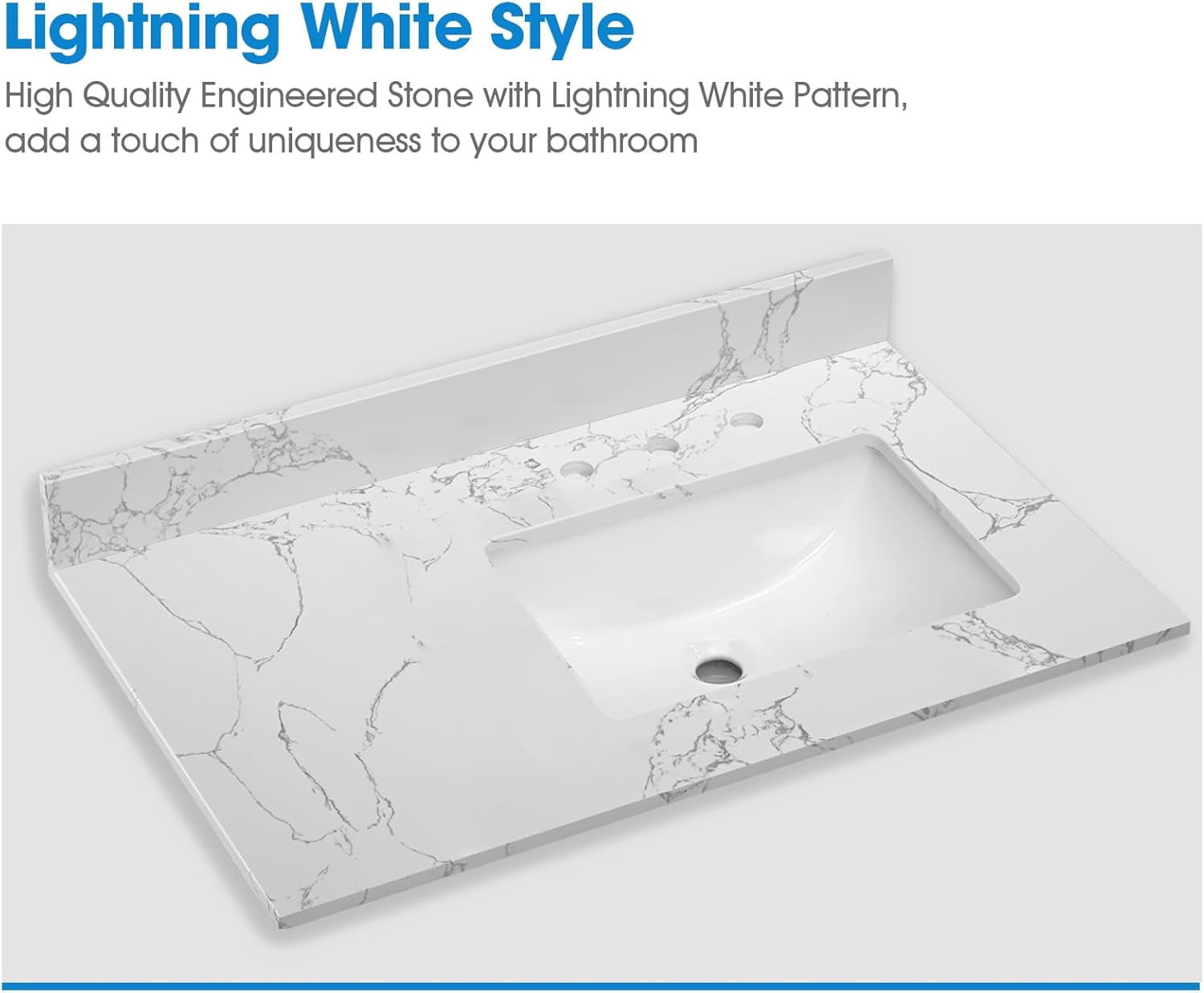 - Universal Fit: Designed for standard 36″ W x 21″ D vanity cabinets, this 36″ x 22″ countertop features a 3/4″ thick surface and a 4″ backsplash for a seamless, built-in look.Luxurious & Durable: Made from high-quality engineered stone, this vanity top combines the elegance of marble with superior strength. Waterproof, scratch-resistant, and easy to maintain for long-lasting beauty.Spill Protection: The built-in 4″ backsplash and overflow sink hole help contain water splashes, keeping your bathroom cleaner and drier.Easy Installation: Pre-drilled for an 8″ widespread faucet and includes a pre-installed rectangular undermount ceramic sink (left-side placement) for a quick, hassle-free upgrade.Ready to Install: Includes the vanity top, ceramic sink, and 4″ backsplash. Ships in damage-resistant packaging for secure delivery.