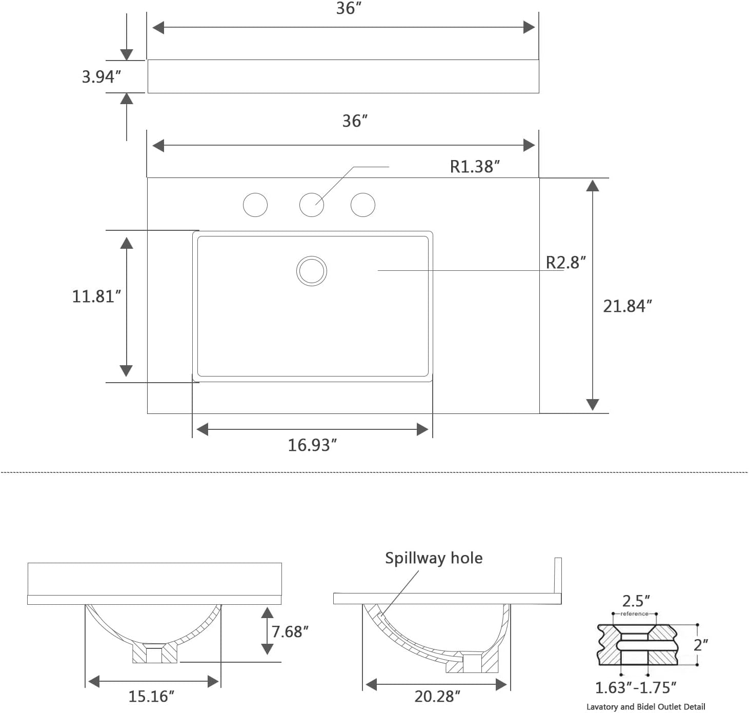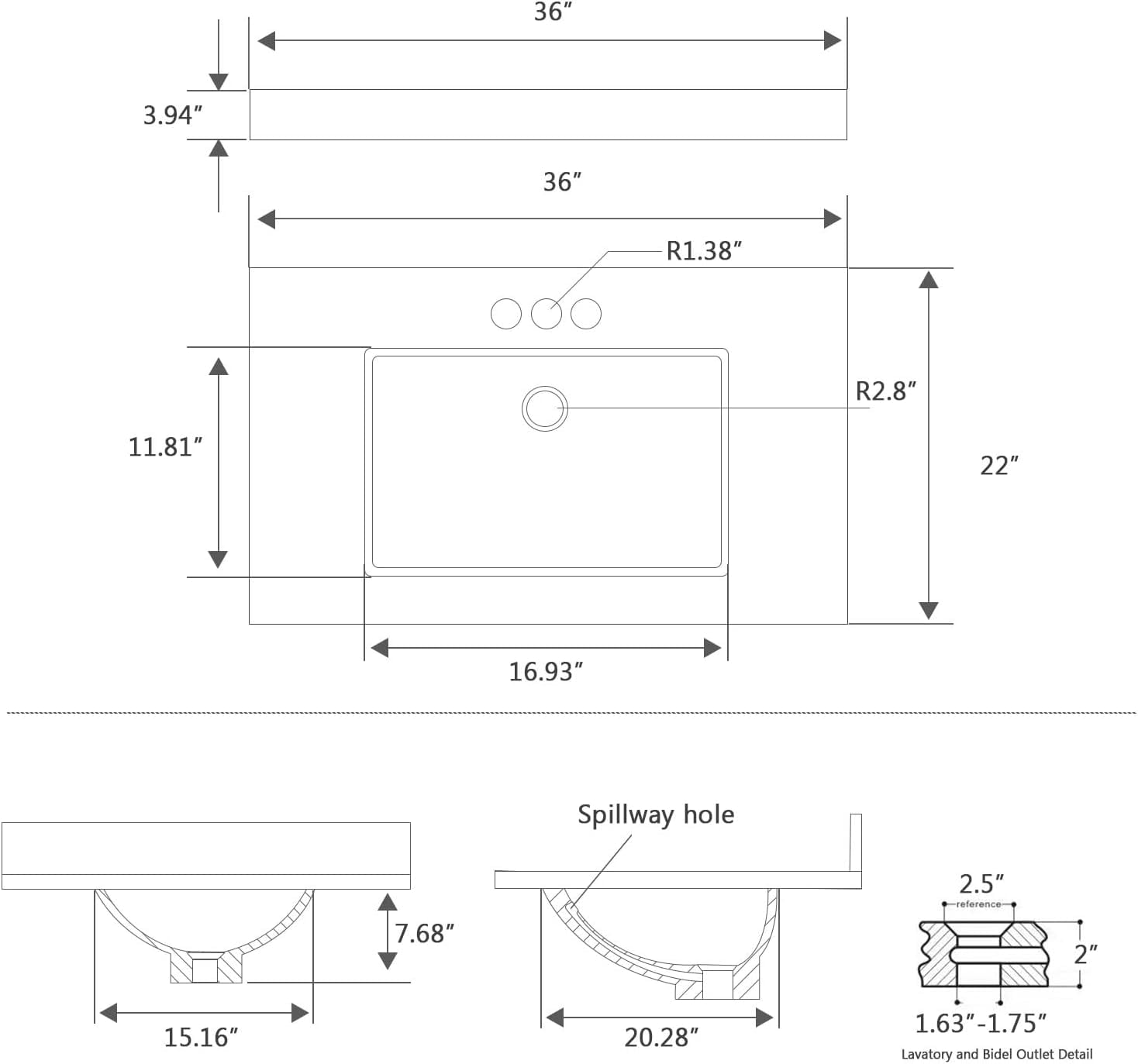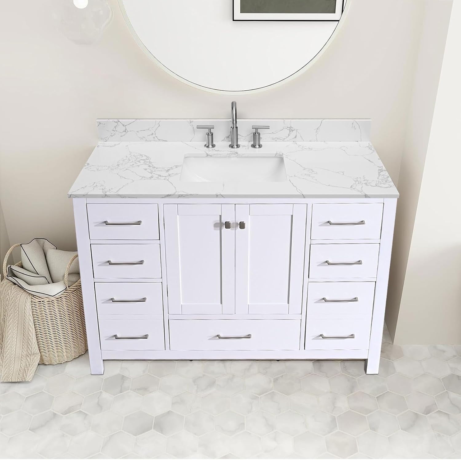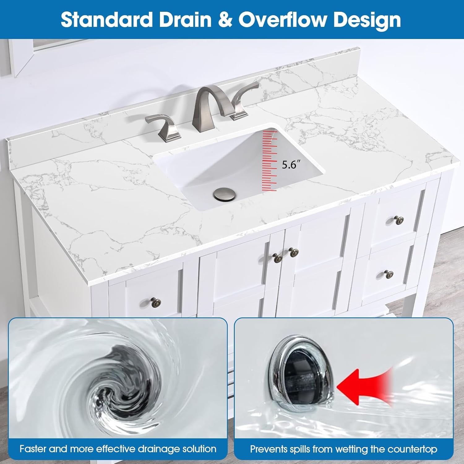 - Universal Fit: Designed for standard 36″ W x 21″ D vanity cabinets, this 36″ x 22″ countertop features a 3/4″ thick surface and a 4″ backsplash for a seamless, built-in look.Luxurious & Durable: Made from high-quality engineered stone, this vanity top combines the elegance of marble with superior strength. Waterproof, scratch-resistant, and easy to maintain for long-lasting beauty.Spill Protection: The built-in 4″ backsplash and overflow sink hole help contain water splashes, keeping your bathroom cleaner and drier.Easy Installation: Pre-drilled for an 8″ widespread faucet and includes a pre-installed rectangular undermount ceramic sink (left-side placement) for a quick, hassle-free upgrade.Ready to Install: Includes the vanity top, ceramic sink, and 4″ backsplash. Ships in damage-resistant packaging for secure delivery.