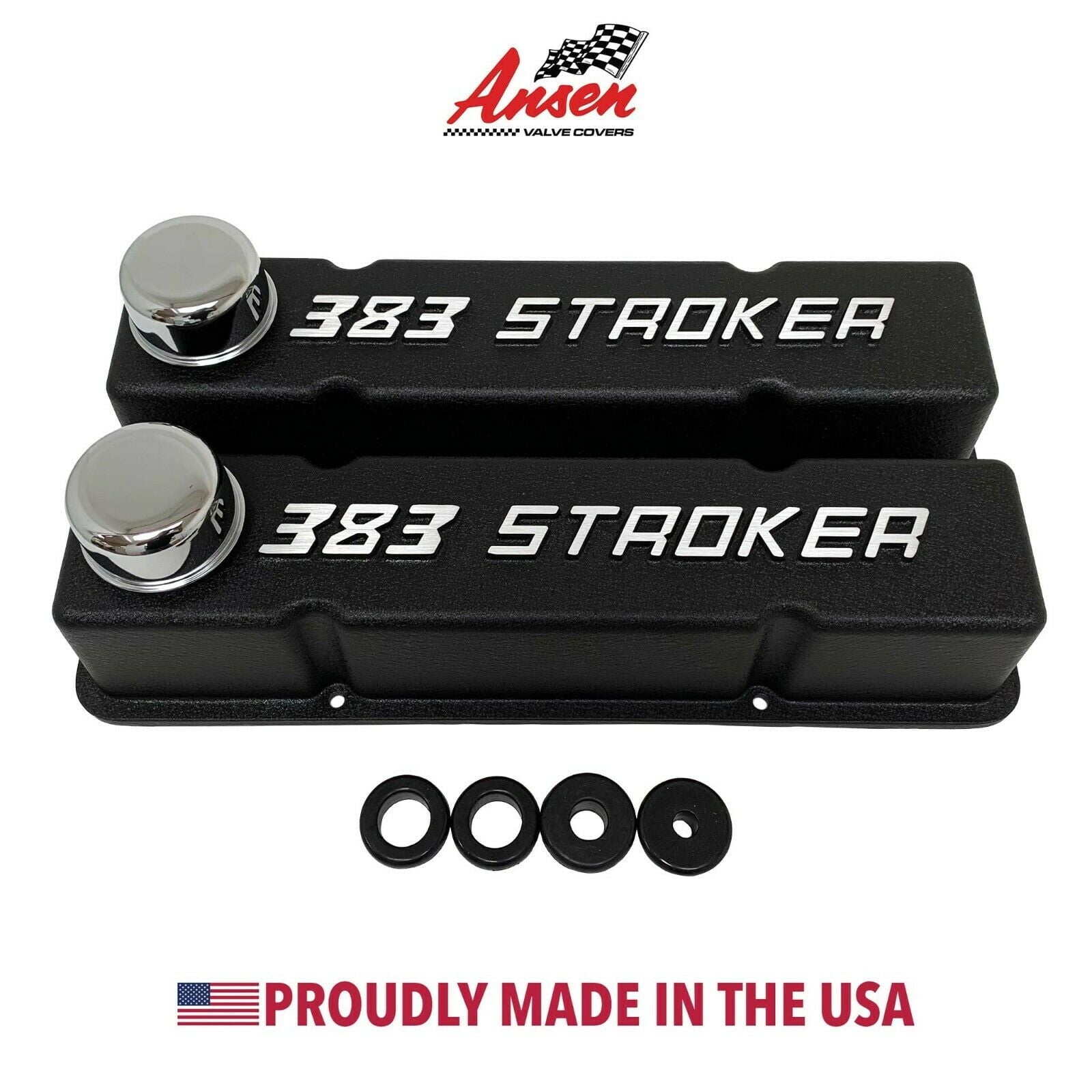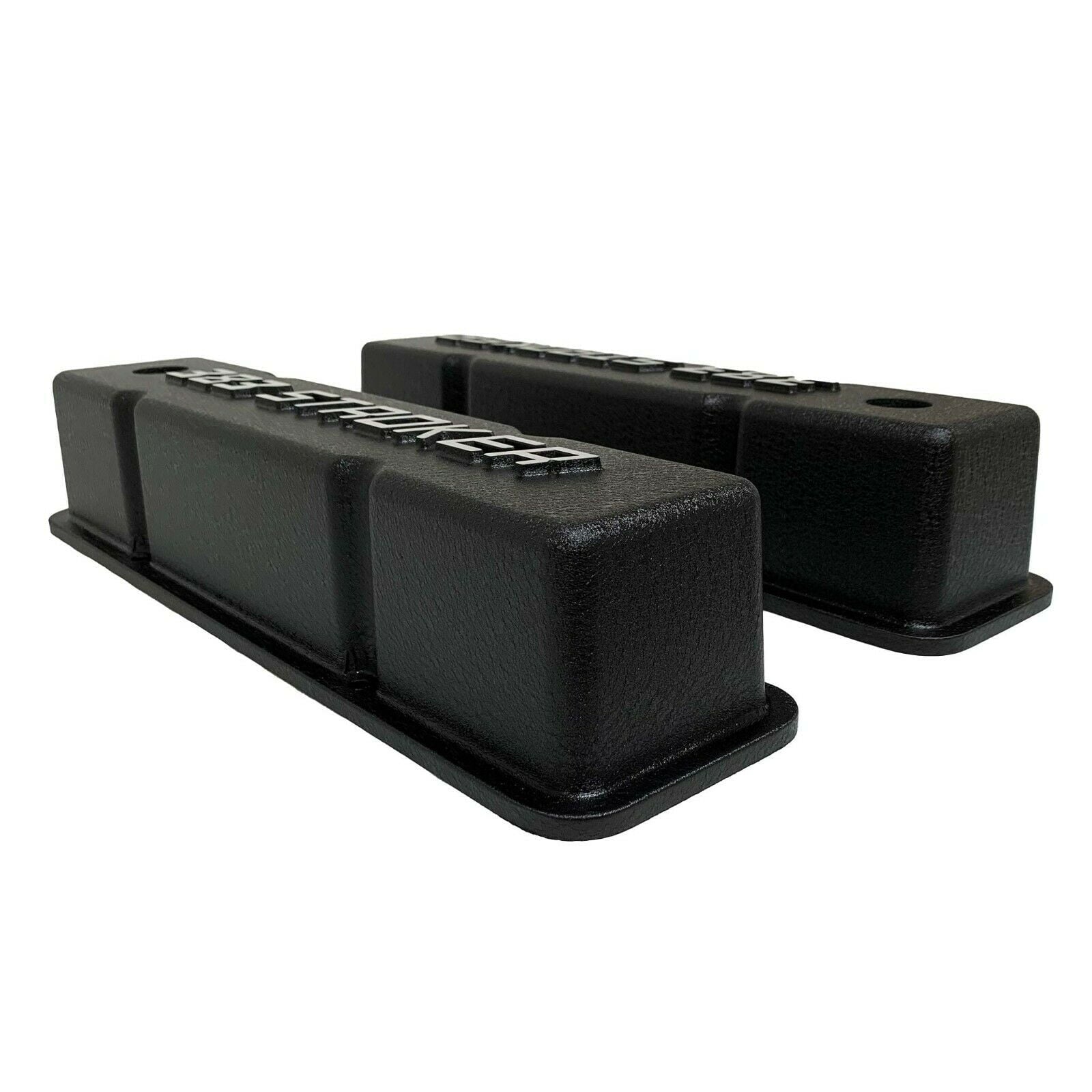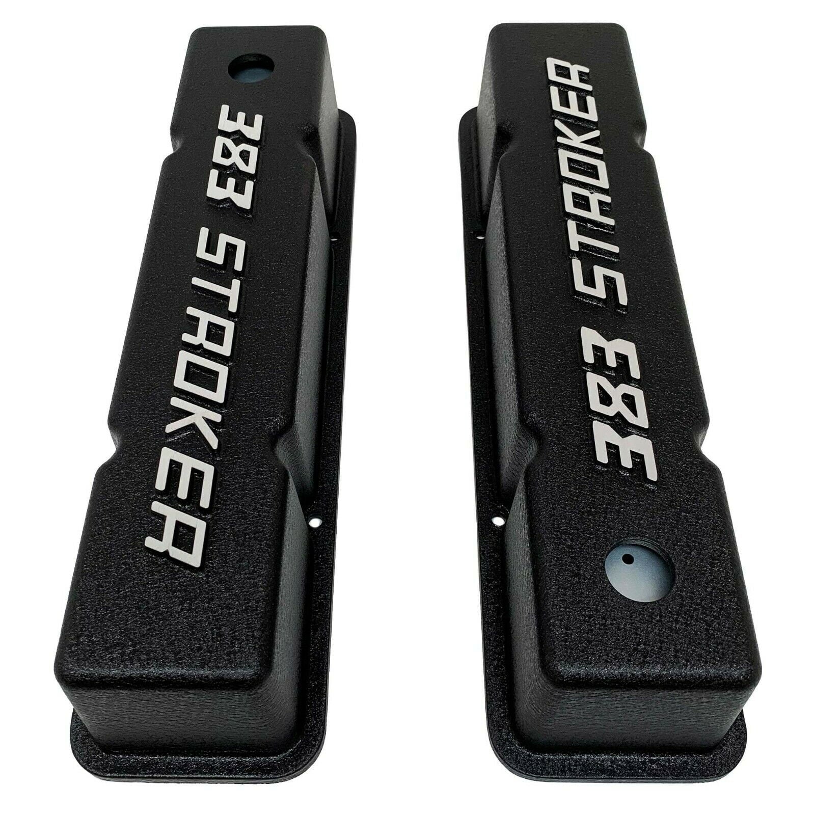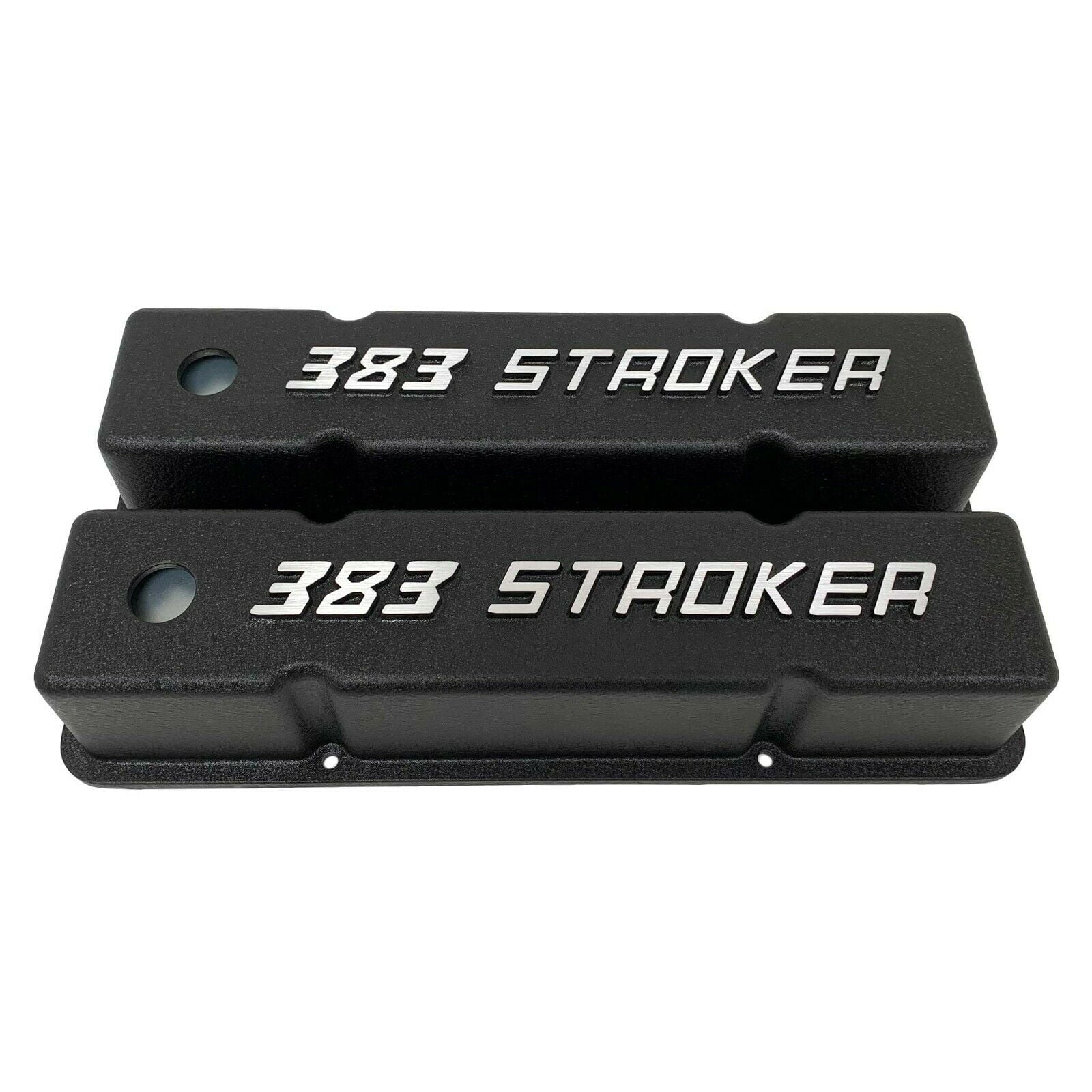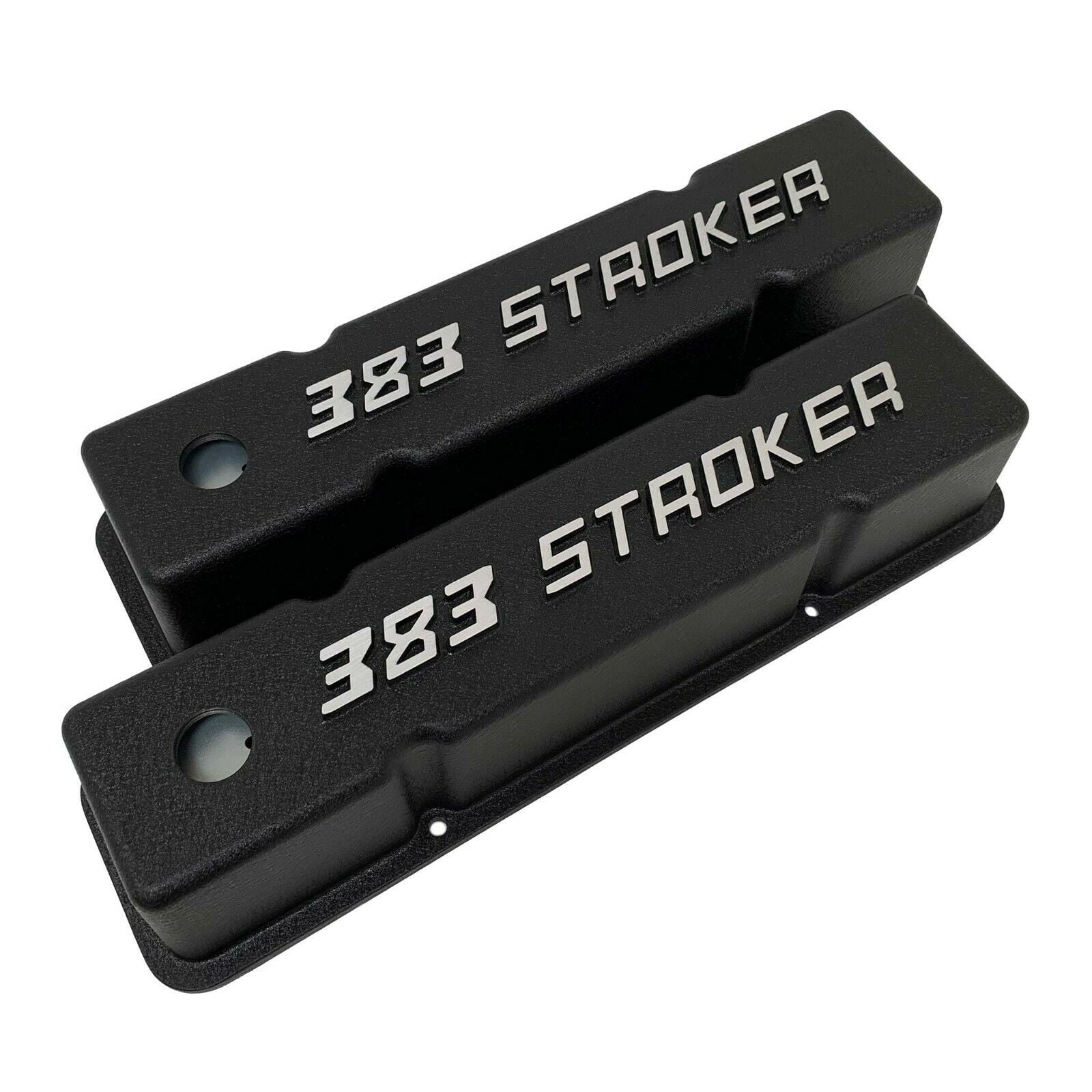 Our valve covers are proudly made in the USA and built from high-grade die-cast aluminum. These Small Block Chevy Tall valve covers feature a raised 383 STROKER logo, perimeter bolt mounts, and have a black powder coat finish.