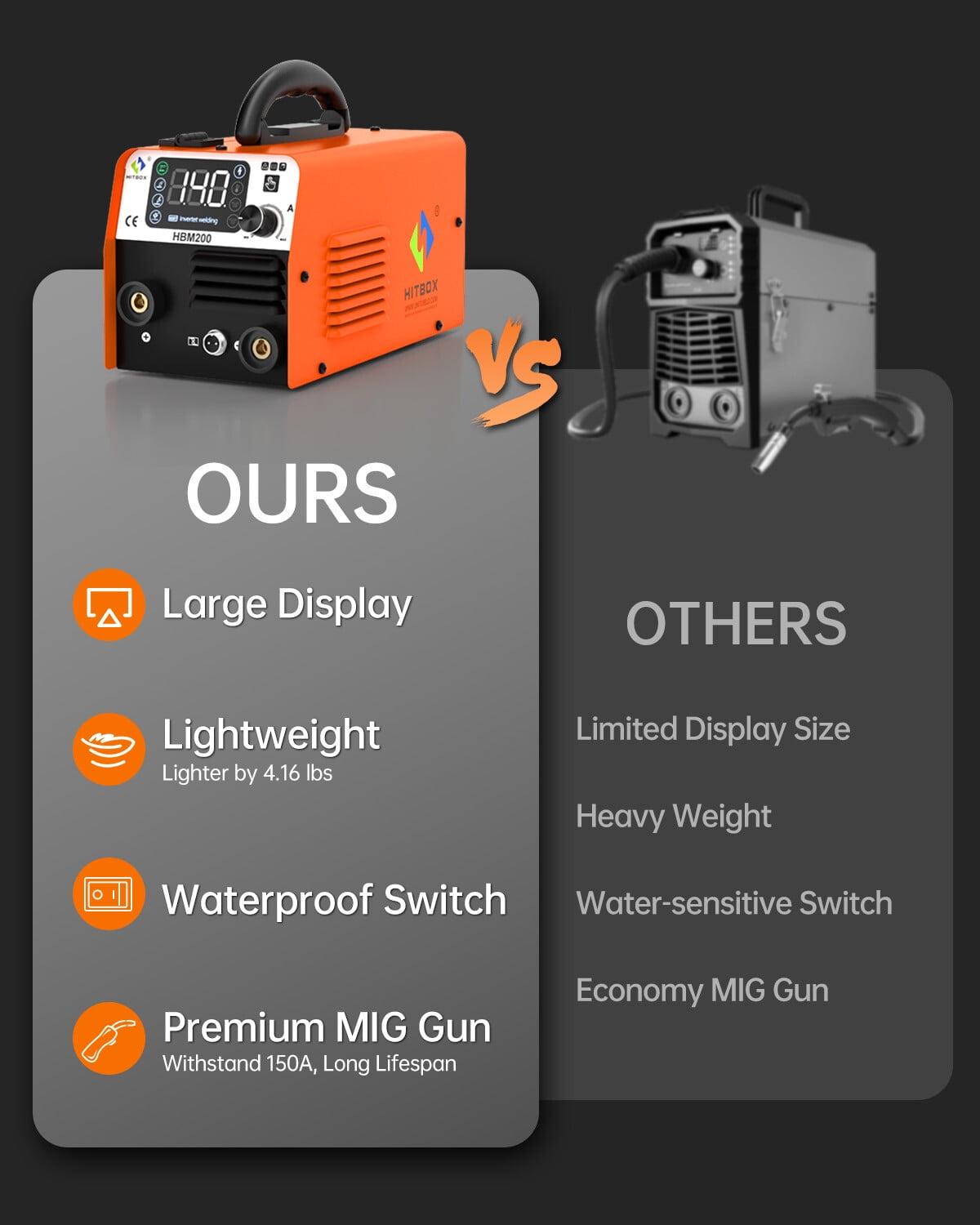 【3 IN 1 Gasless Welding Machine】: 1 machine for 3 purposes, HITBOX MIG gasless welding machine has 3 functions of MIG/ARC/TIG, HBM200 uses convenient flux-cored wire, and works without gas. one-key switching, simple and convenient, work efficiency is 30% higher than traditional ARC welders, one- time molding, no need to knock and grind, Great reduction in metal loss obviously enhances the welding efficiency and energy saving effect and making welding appearance is more beautiful.
