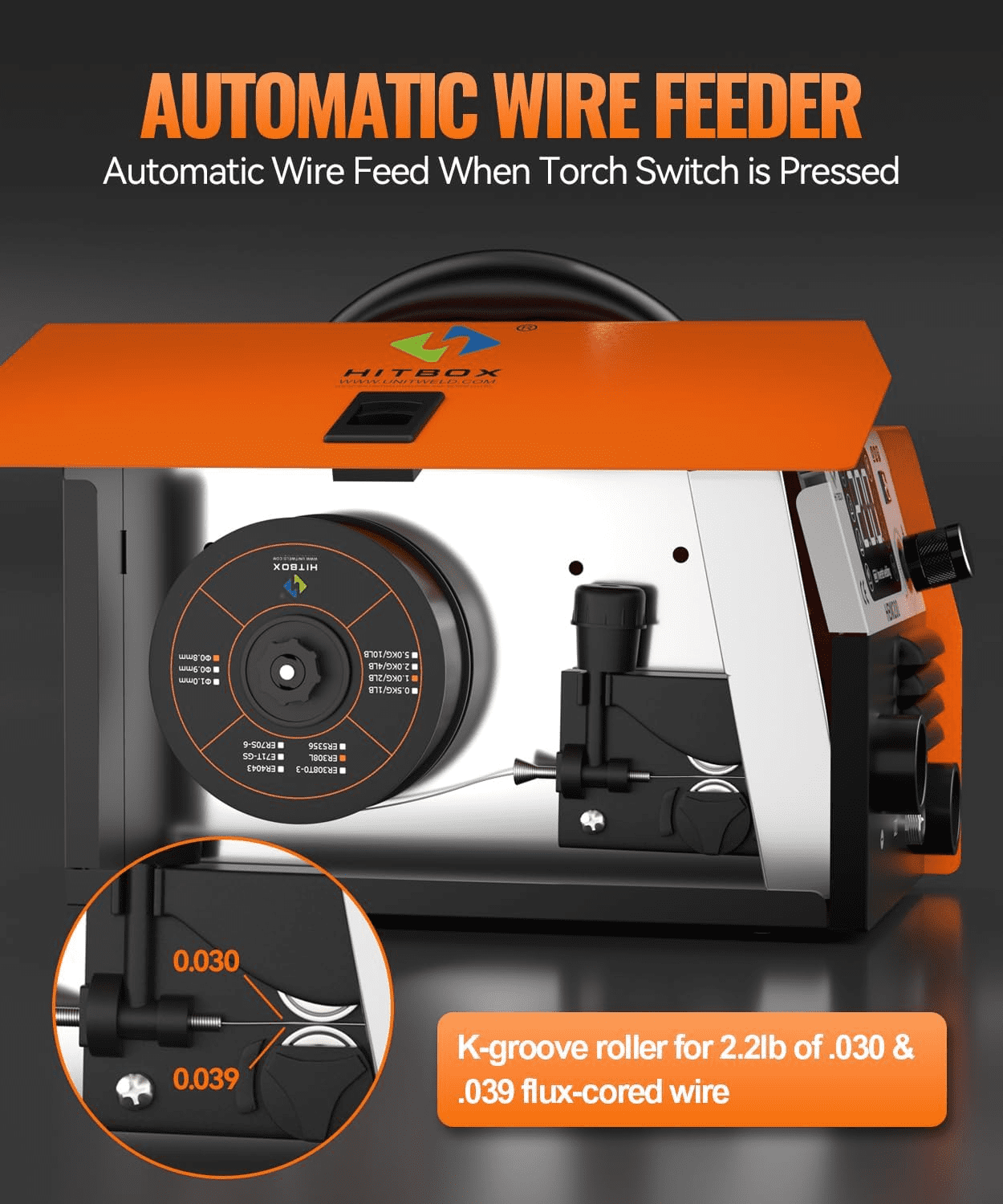 【Synergy & Compact】 HITBOX MIG welder comes with One-Knob intelligent control system. The welding machine automatically compensates and adjusts the welding current, allowing for a perfect weld. One-Knob controls the speed and current of the flux core welder. Lightweight and compact design is comfortable to hold and easy to carry around.