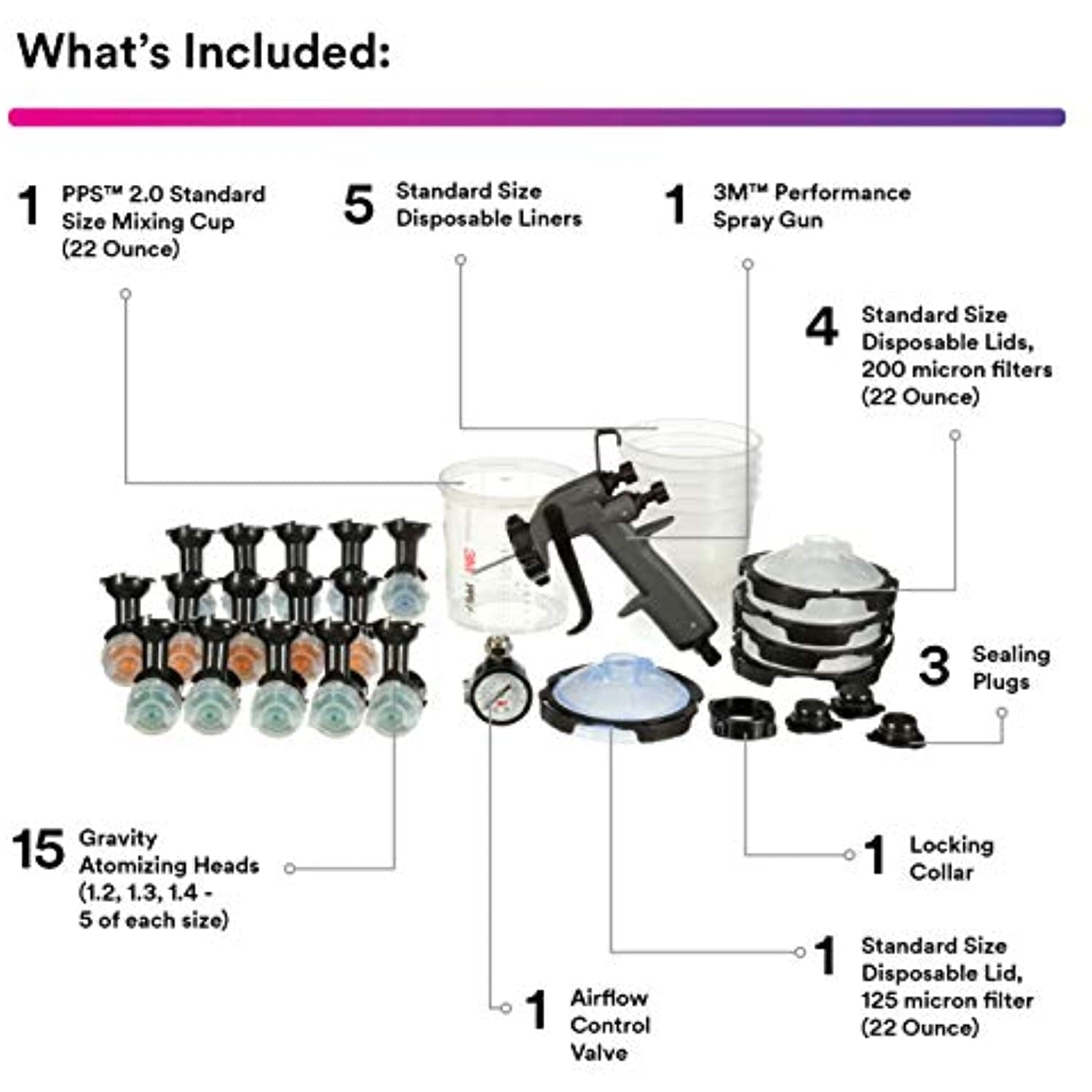 - KIT INCLUDES: 1 Spray Gun, 15 Gravity HVLP Atomizing Heads, 3M PPS Series 2.0 Spray Cup with 5 lids and liners