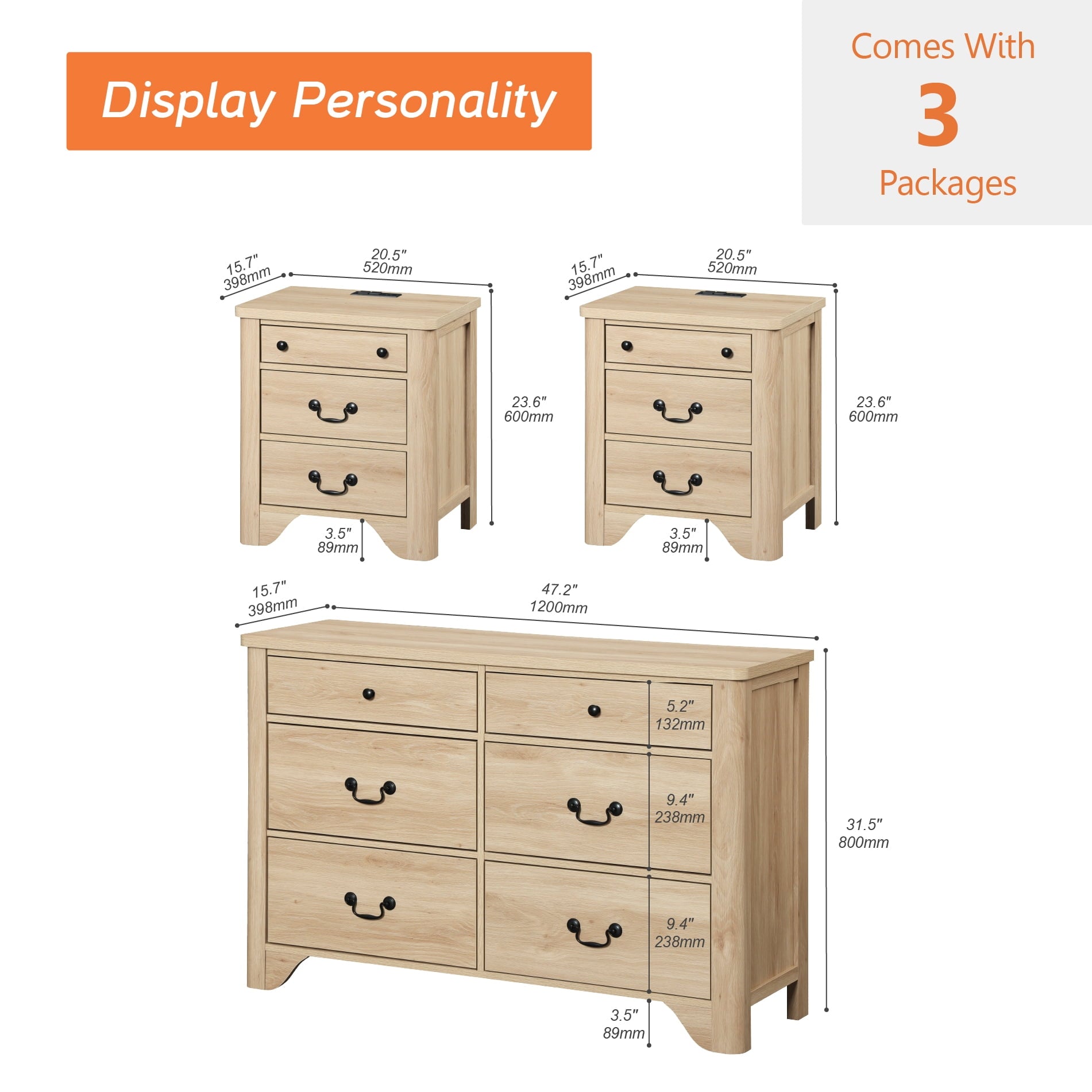 - Ample Storage: The 9-drawer dresser provides spacious storage for clothes, books, and more. The two 3-drawer nightstands not only keep your bedroom tidy but also feature built-in charging stations with 2 AC outlets and 2 USB ports, perfect for charging your phone, tablet, or other devices overnight.