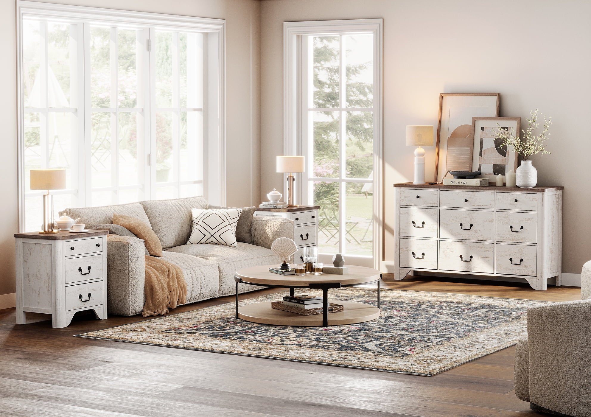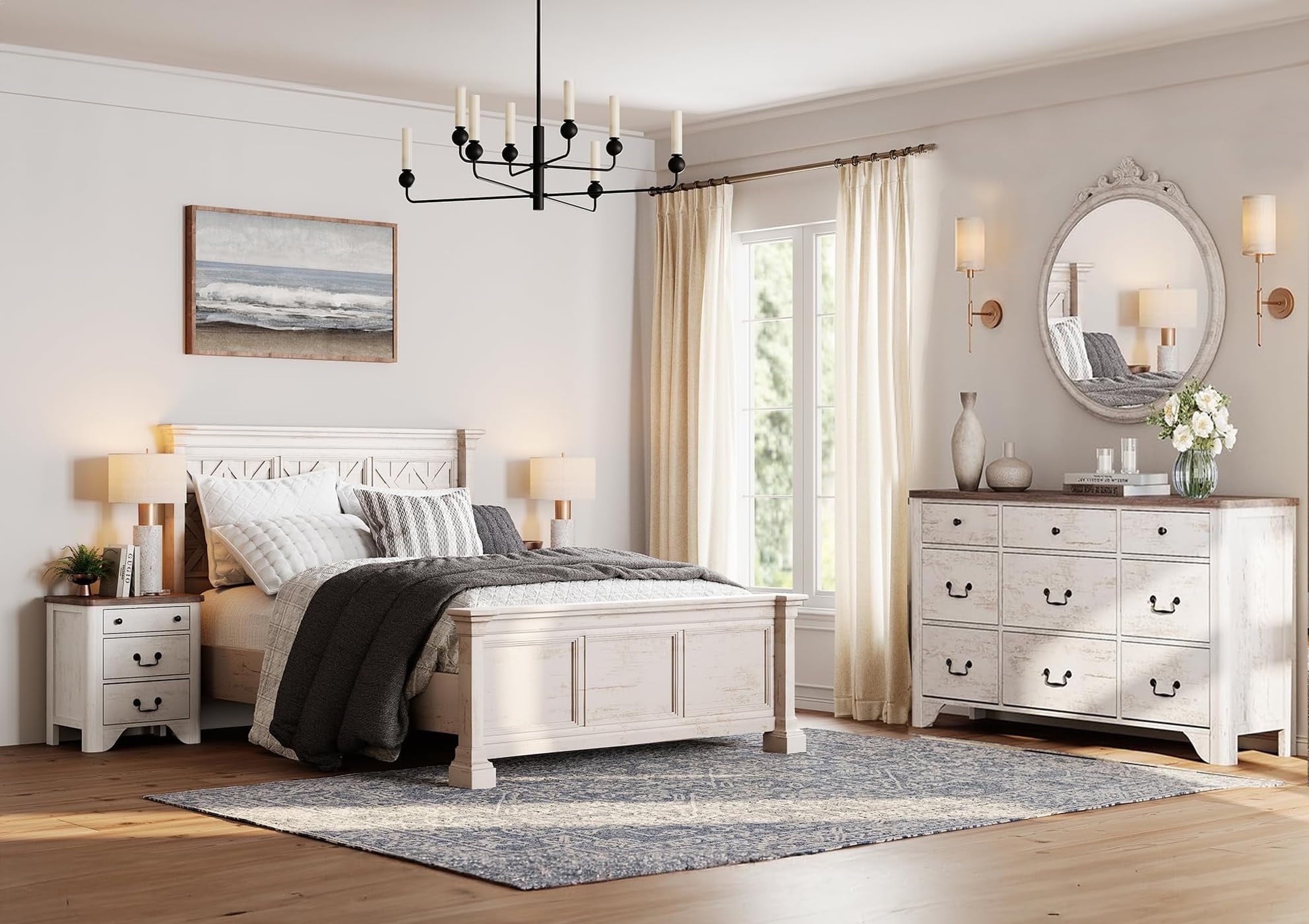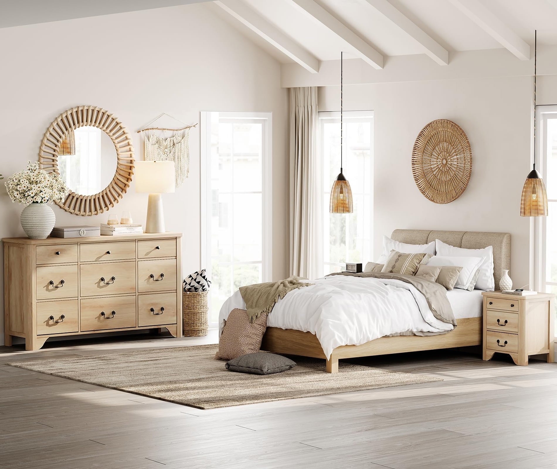 The 9-drawer dresser provides generous space for clothes, linens, and everyday items, while the two nightstands keep your bedside essentials organized and within reach. Smooth under-mounted drawer slides ensure easy use, and the clean, rounded design adds a cozy farmhouse touch to any space.