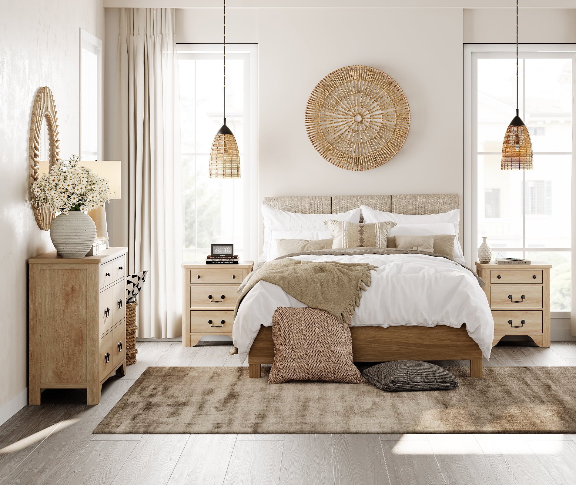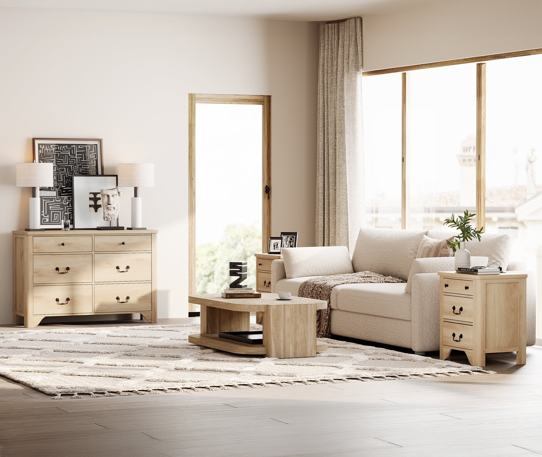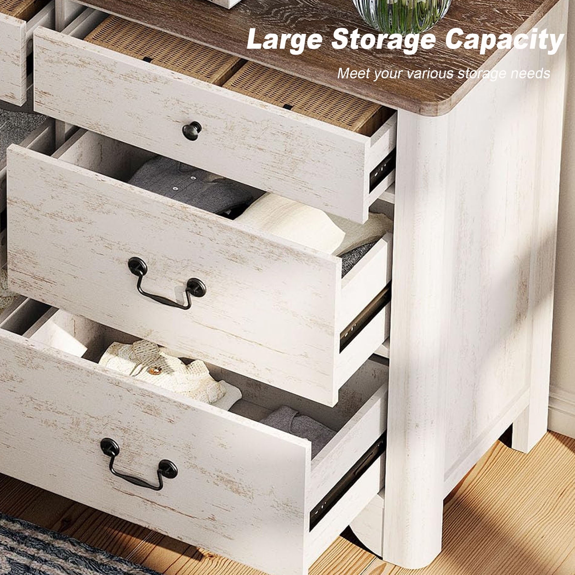 The 9-drawer dresser provides generous space for clothes, linens, and everyday items, while the two nightstands keep your bedside essentials organized and within reach. Smooth under-mounted drawer slides ensure easy use, and the clean, rounded design adds a cozy farmhouse touch to any space.