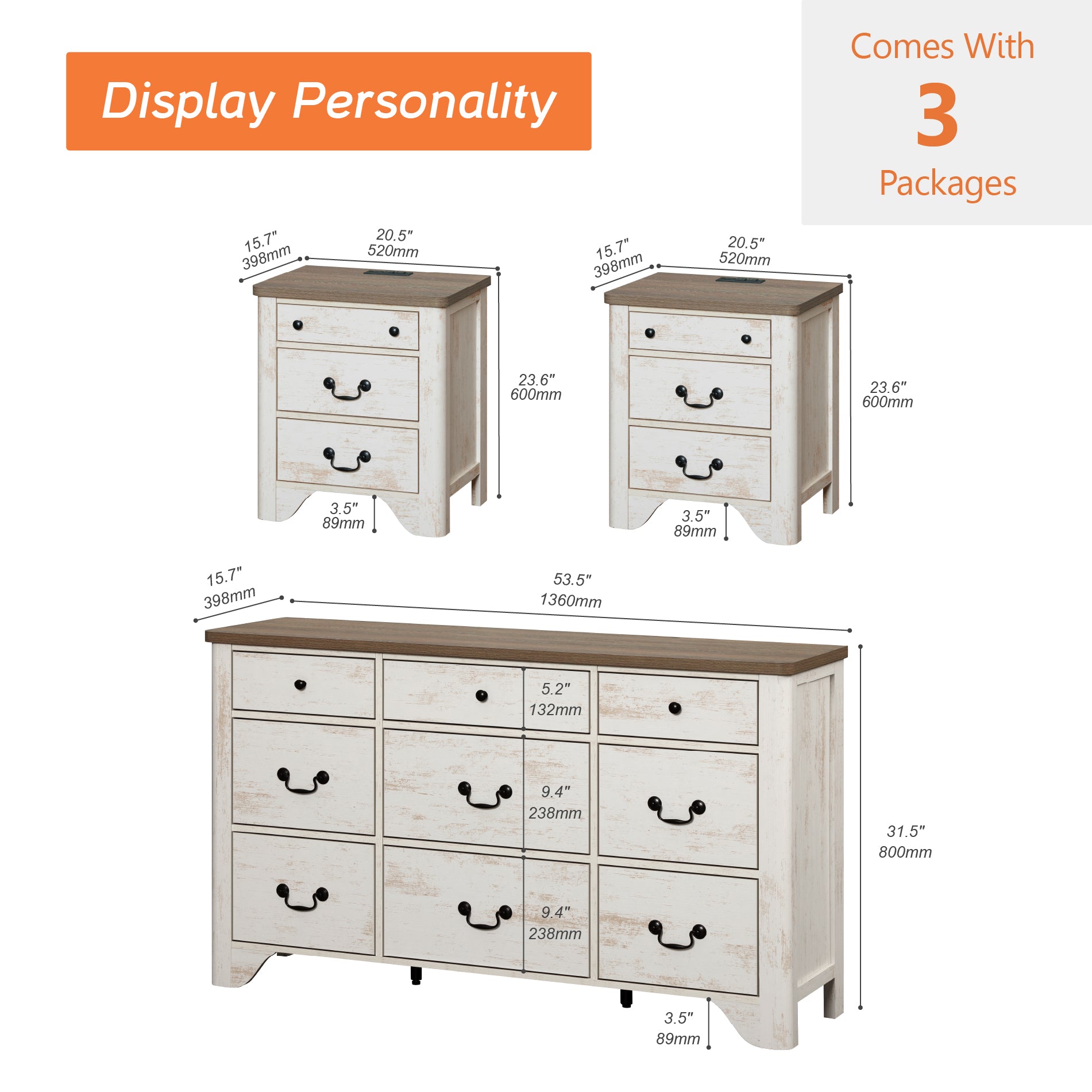 - Specification:Color: WhiteMaterial: Engineered WoodStyle: Farmhouse,French CountrysideProduct Dimensions:Dresser Size: 15.7″L x 53.5″W x 31.5 “HNightstand: 15.7″D x 20.5″W x 23.7″HWeight Capacity: 120lbsNumber of Drawers: 15Finish Type: PaintedDrawer Type: Under Mounted SlideRoom Type: Bedroom, Living Room, Kids Room, NurseryPackage Include:1 x 9 drawer dresser2 x 3 drawer nightstand1x Hardware Bag1 x User ManualFor quicker processing, your order may be shipped in multiple packages.