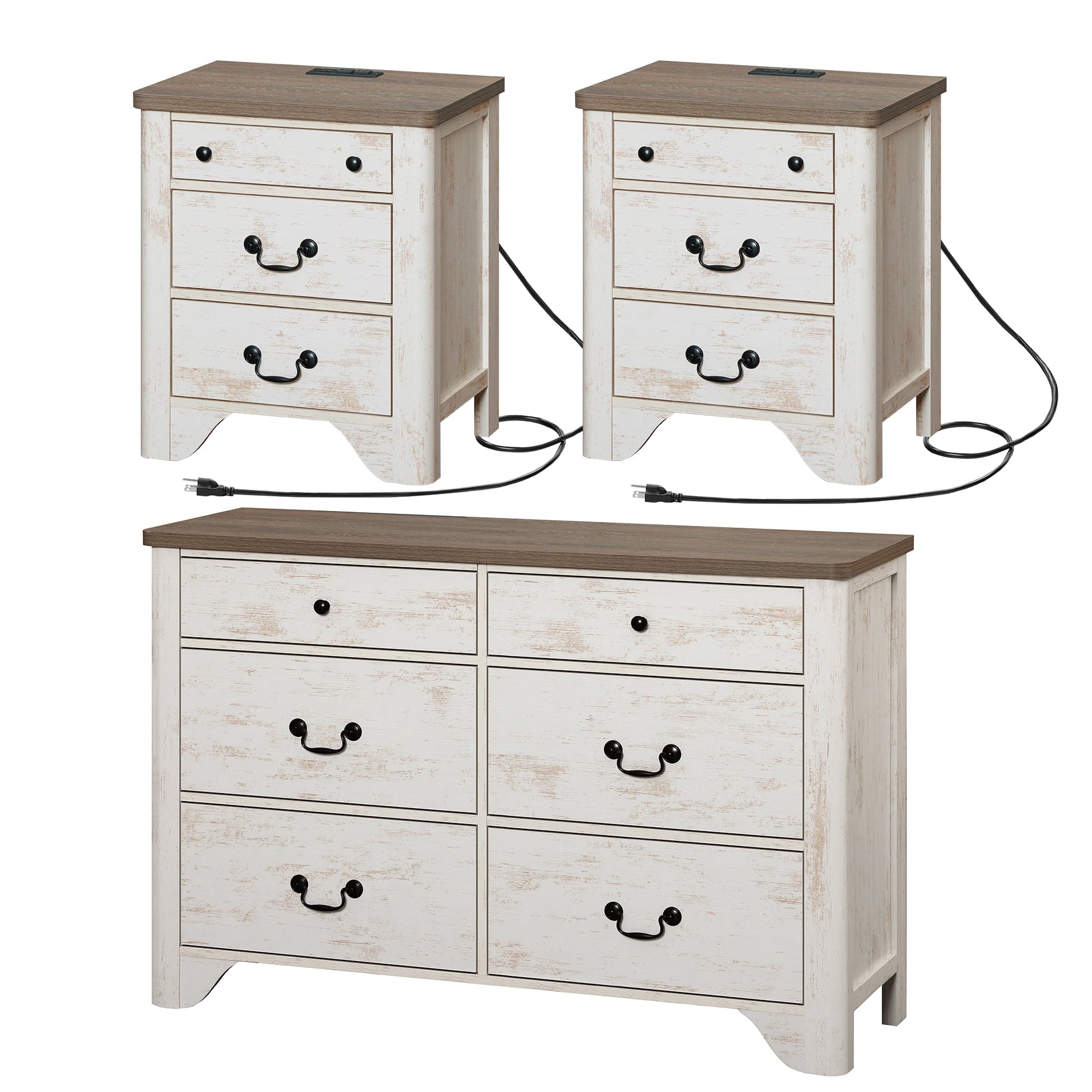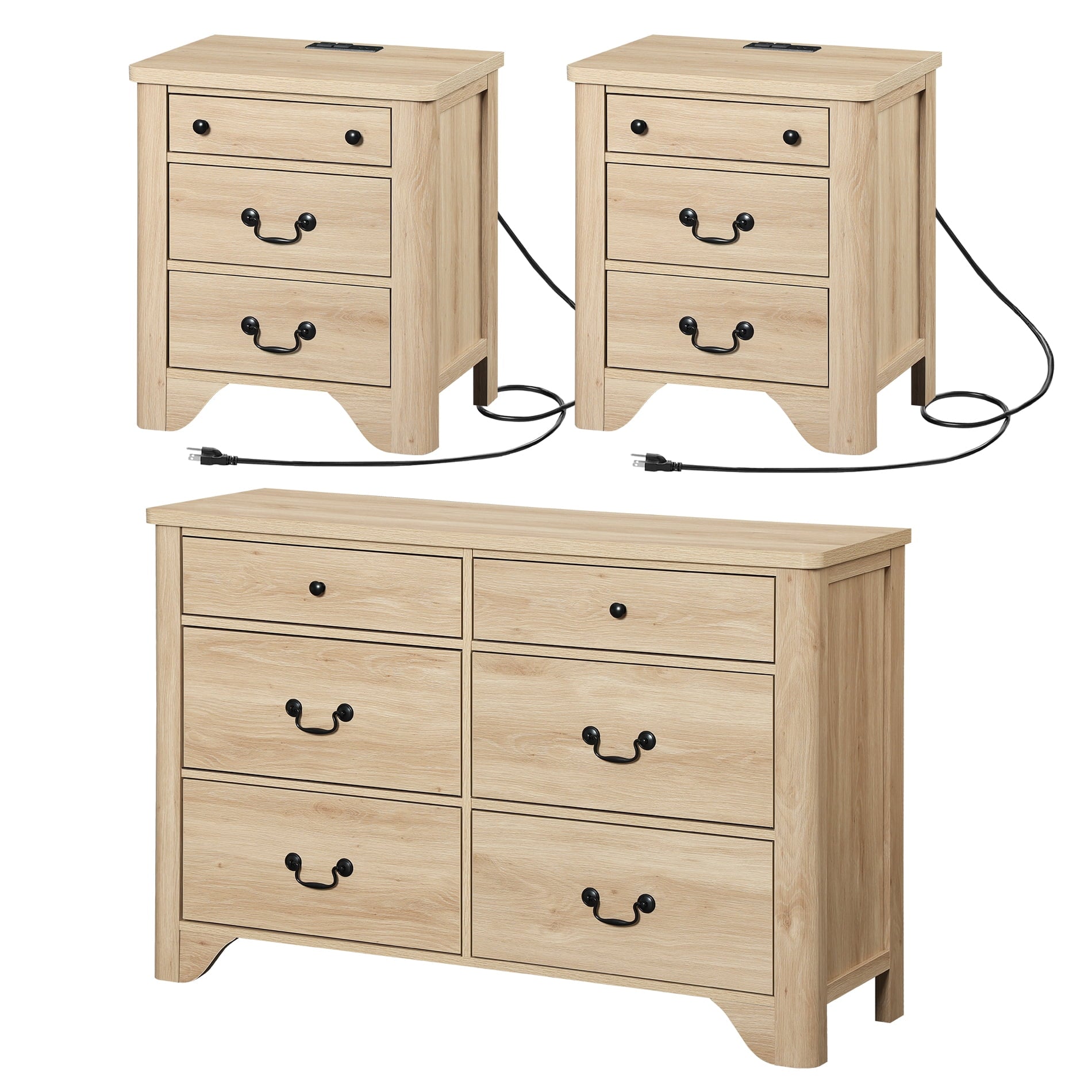 - Ample Storage: The 6-drawer dresser provides spacious storage for clothes, books, and more. The two 3-drawer nightstands not only keep your bedroom tidy but also feature built-in charging stations with 2 AC outlets and 2 USB ports, perfect for charging your phone, tablet, or other devices overnight.