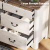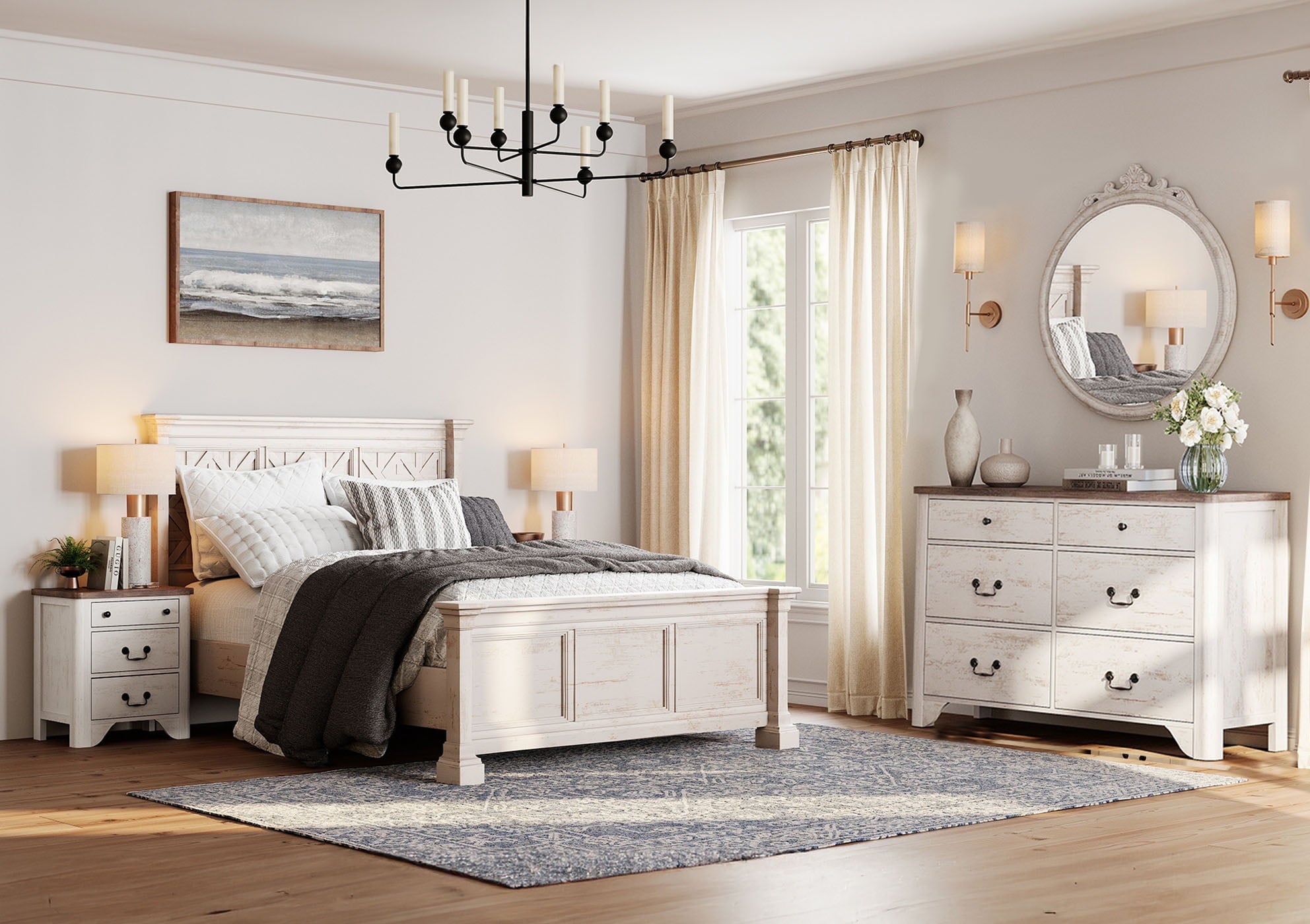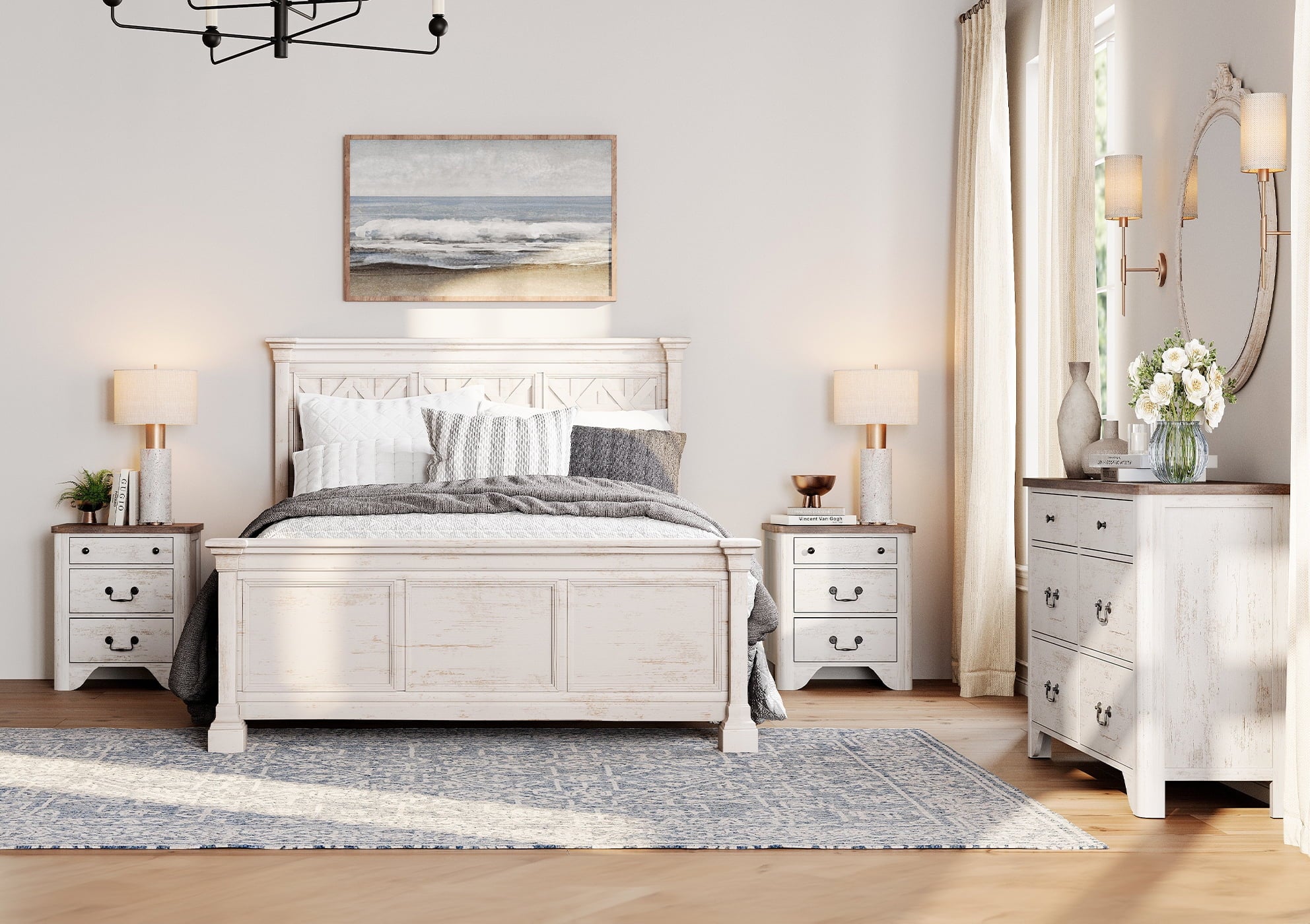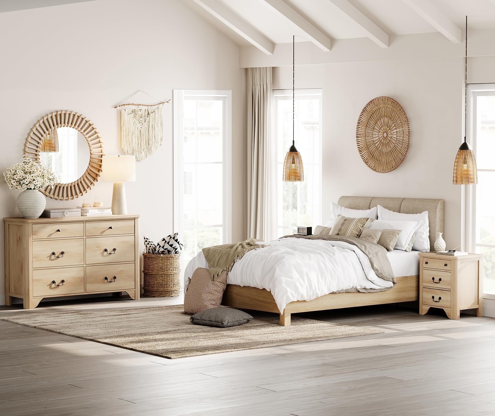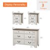 The 6-drawer dresser provides generous space for clothes, linens, and everyday items, while the two nightstands keep your bedside essentials organized and within reach. Smooth under-mounted drawer slides ensure easy use, and the clean, rounded design adds a cozy farmhouse touch to any space.