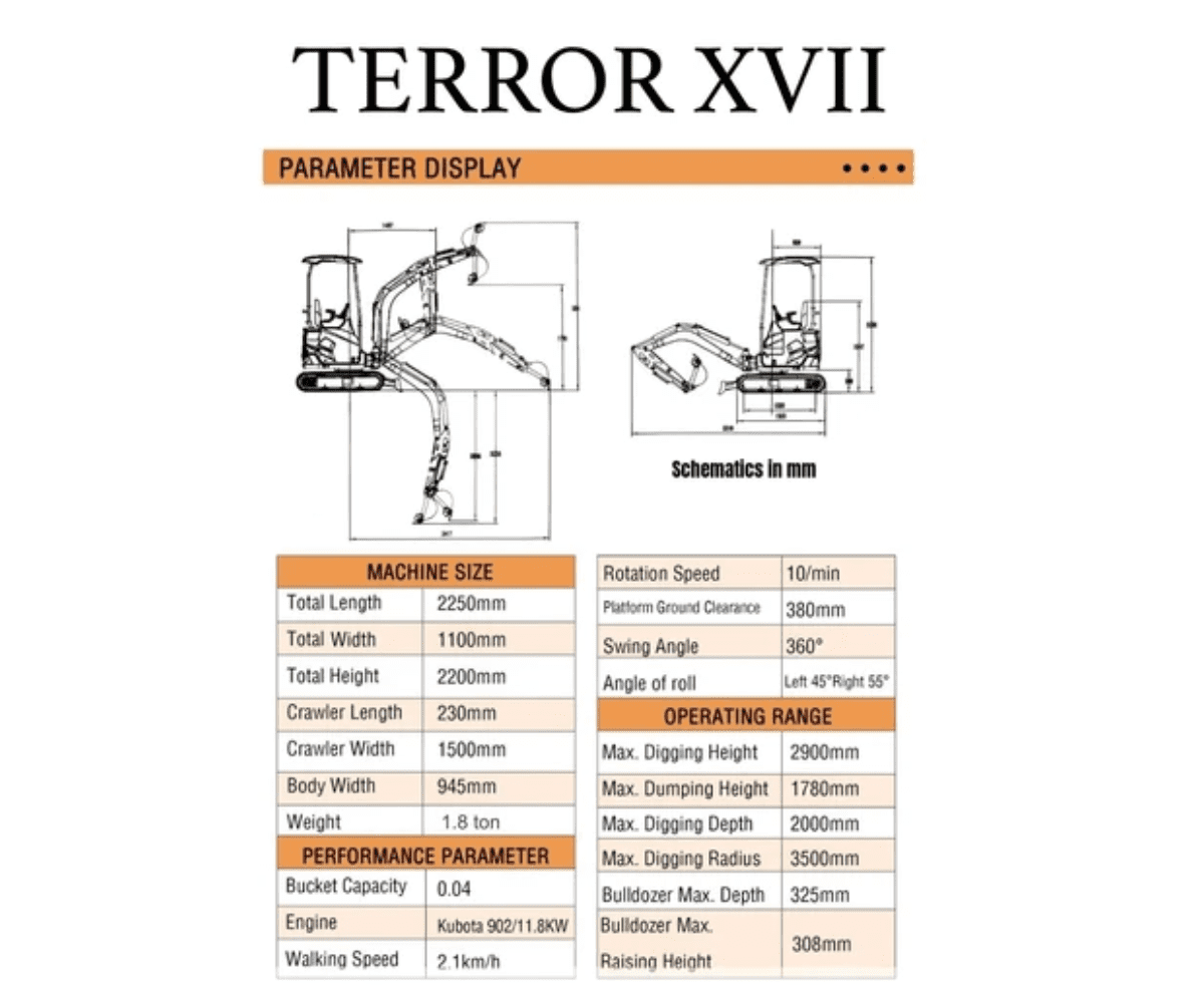 - Designed for Small and Medium Projects: The TERROR XVII Prestige yard excavator was specially engineered for small construction projects, featuring a compact but reliable design that ensures easy maneuverability in small areas, including farms, gardens, public spaces, parks, orchards, and more!