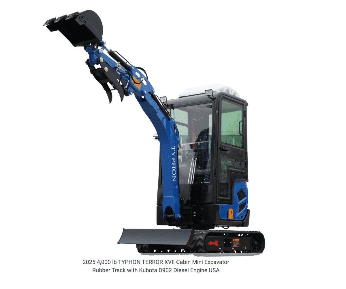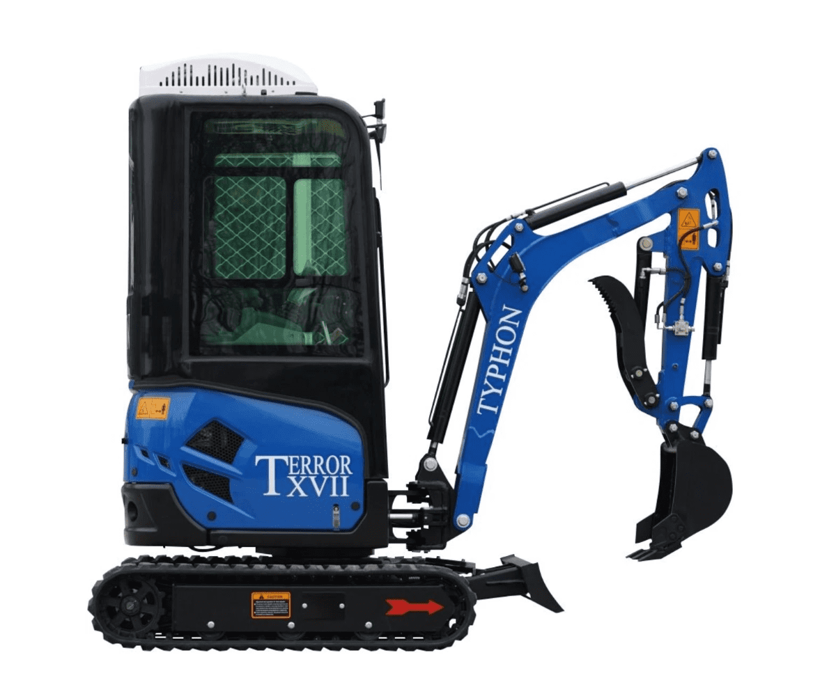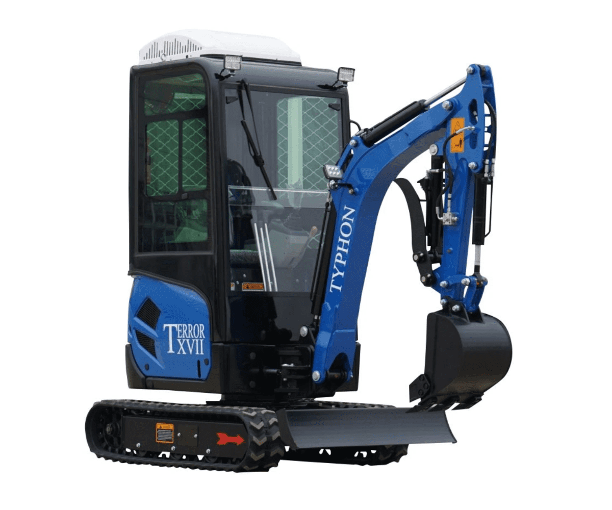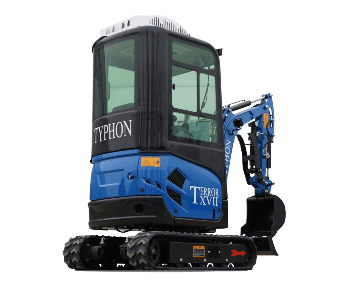 - What’s Included: The TYPHON TERROR XVIII mini excavator machine comes with an air-conditioned/heater cabin, a standard digging excavator bucket, a tool box, and a digital manual with all instructions.