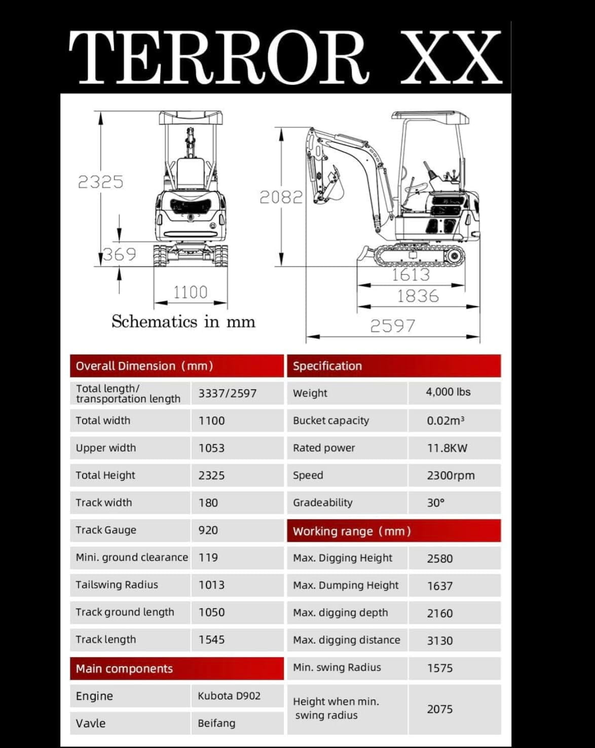 - What’s Included: The TYPHON TERROR XX Lux mini excavator machine comes with 1 x standard digging excavator bucket, as well as 1 x tool box, 1 x canopy, and 1 x digital manual with all the instructions.