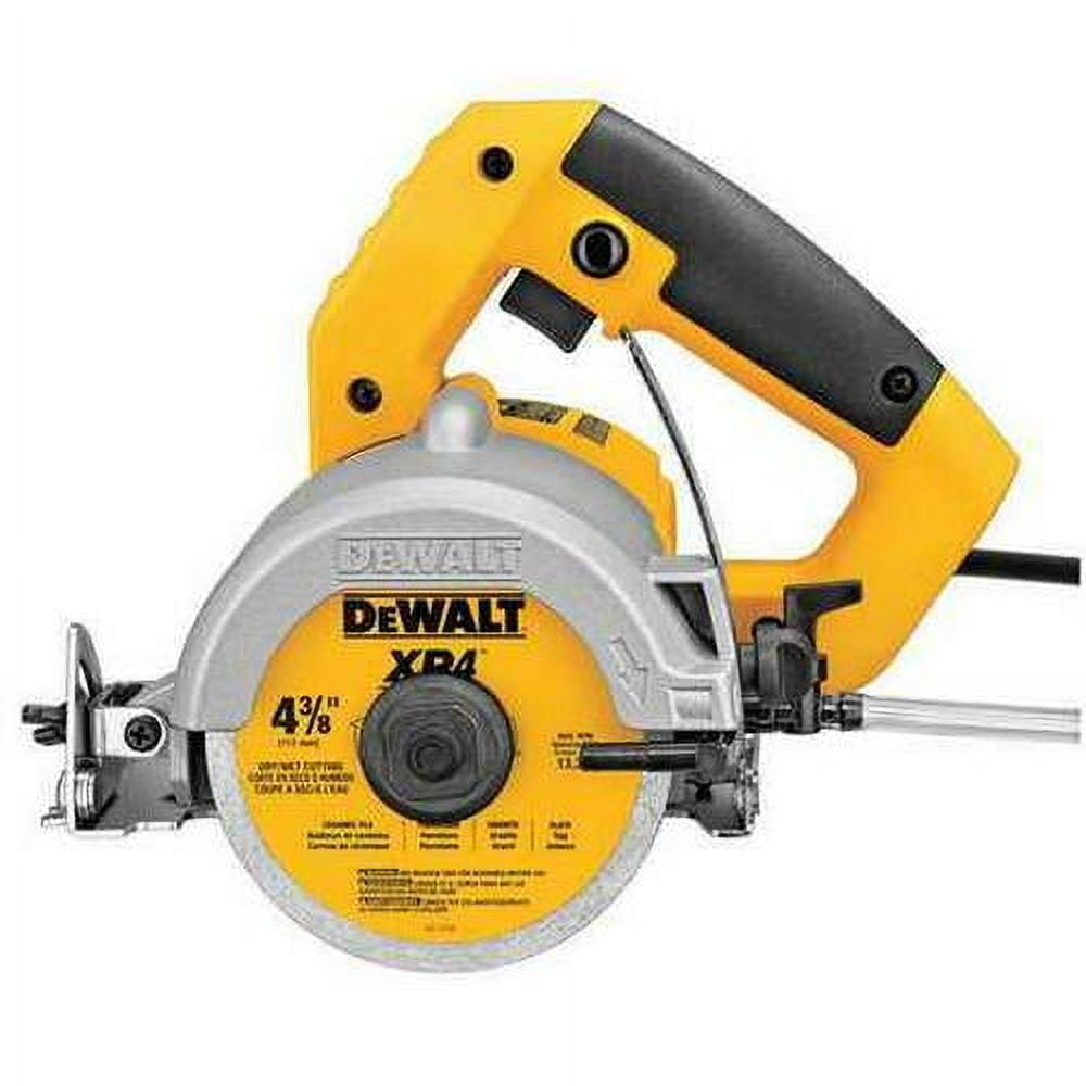 Masonry Saw, Power Source Corded, Series DEWALT(R), Primary Saw Application Concrete, Masonry, Tool Style Handheld, Blade Dia. 4 3/8 in, Max. Blade Speed 13,000 RPM, Current 10.8 A, Arbor Size 20 mm, Arbor Shape Round, Cutting Type Wet/Dry, Max. Cutting Depth 3 1/8 in, Bevel Angle Range 45 Degrees , Stand Included No, Variable Speed Yes, Tool Weight 6.6 lb, Voltage 120V AC, Cord Length 6 ft, Includes 12 ft Water Line and Regulator, Diamond Blade, (2) Wrenches for Blade Change, Instruction Manual4-3/8 Wet/Dry Handheld Tile cutter