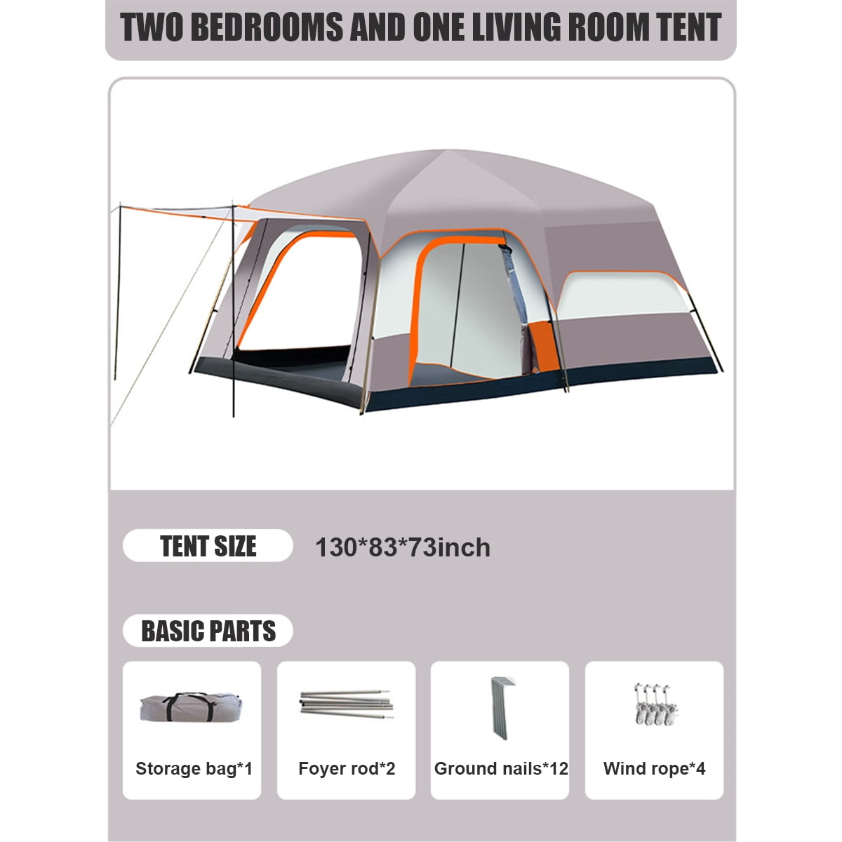- Two-Room Family Camping PalaceSpacious 130″x83″x73″ (330x210x185cm) layout with separate bedrooms + living room, comfortably housing 4-6 adults. 83″ (210cm) ceiling eliminates crouching.