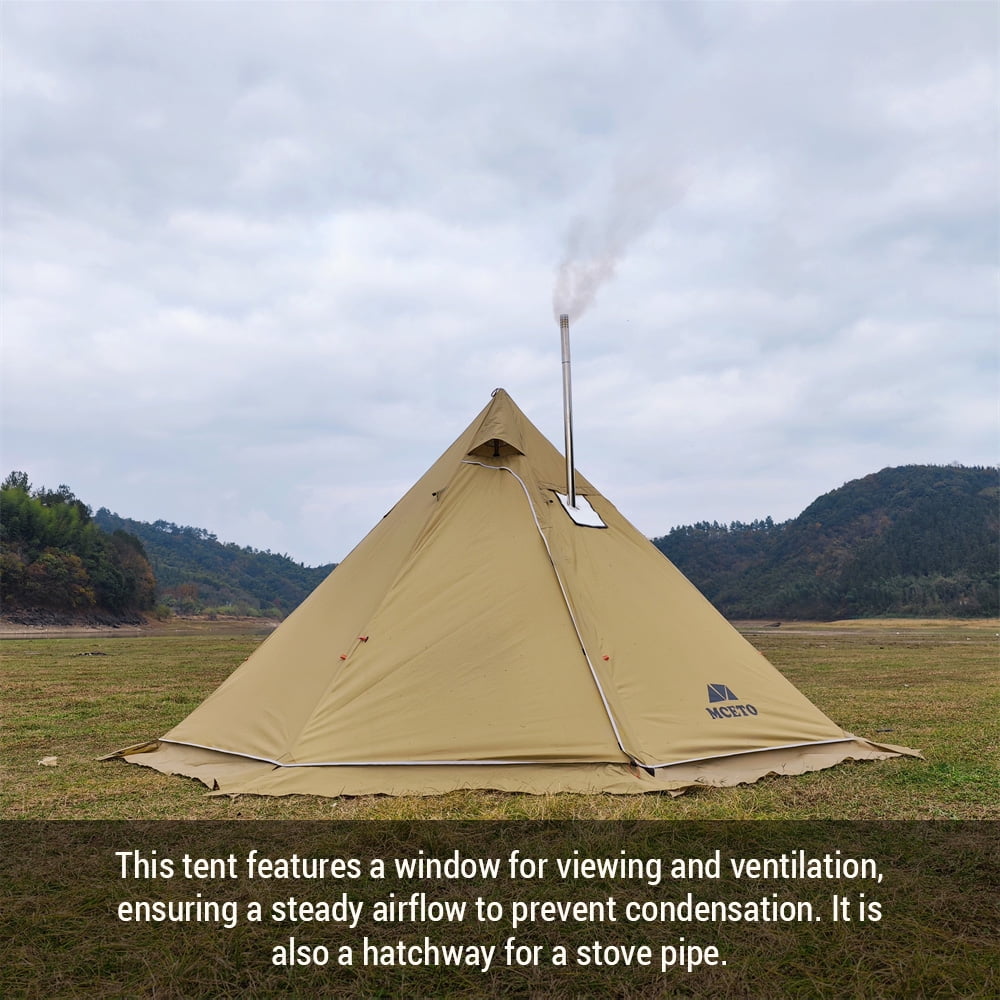 - This tent features a window for viewing and ventilation, ensuring a airflow to condensation. It is also a hatchway for a stove pipe.