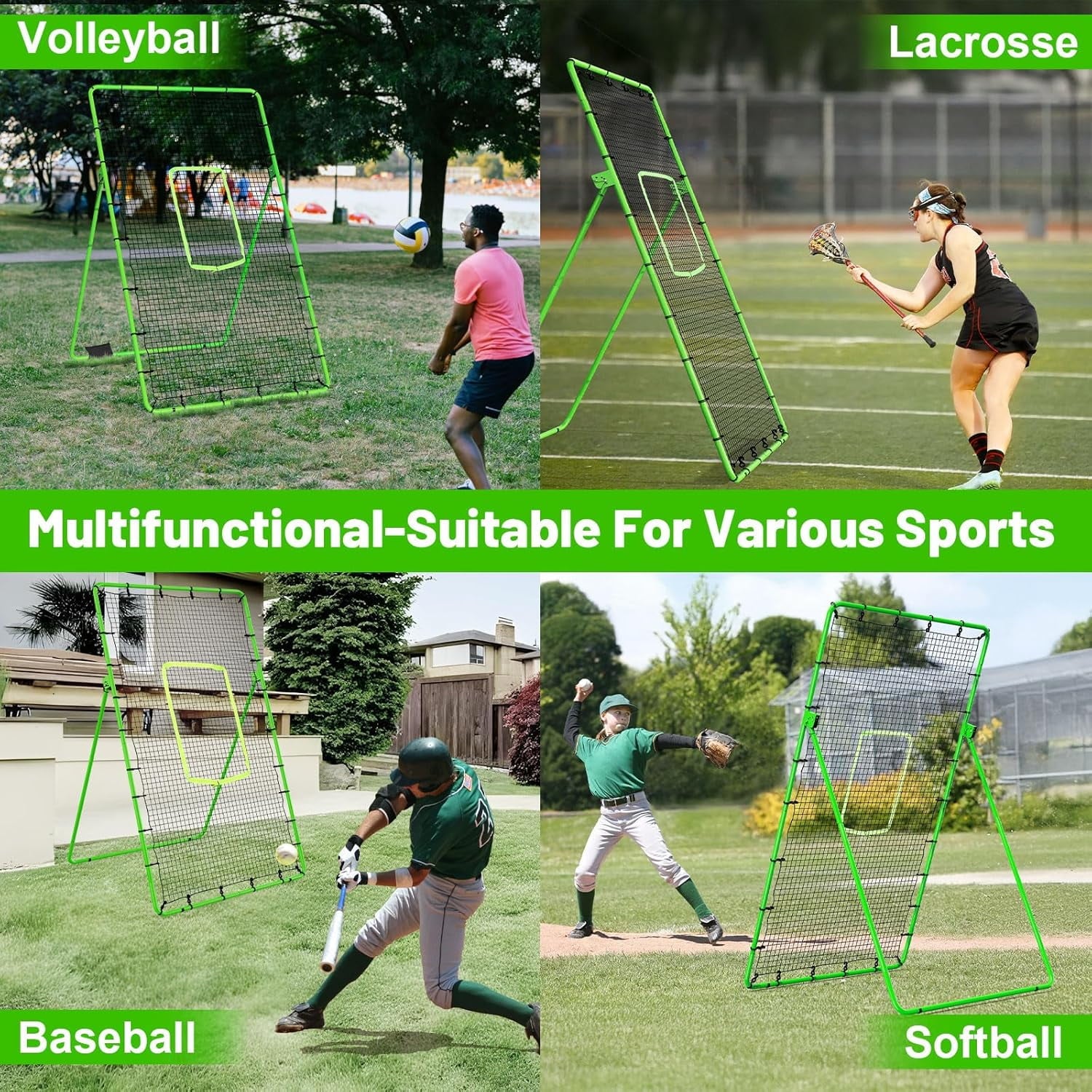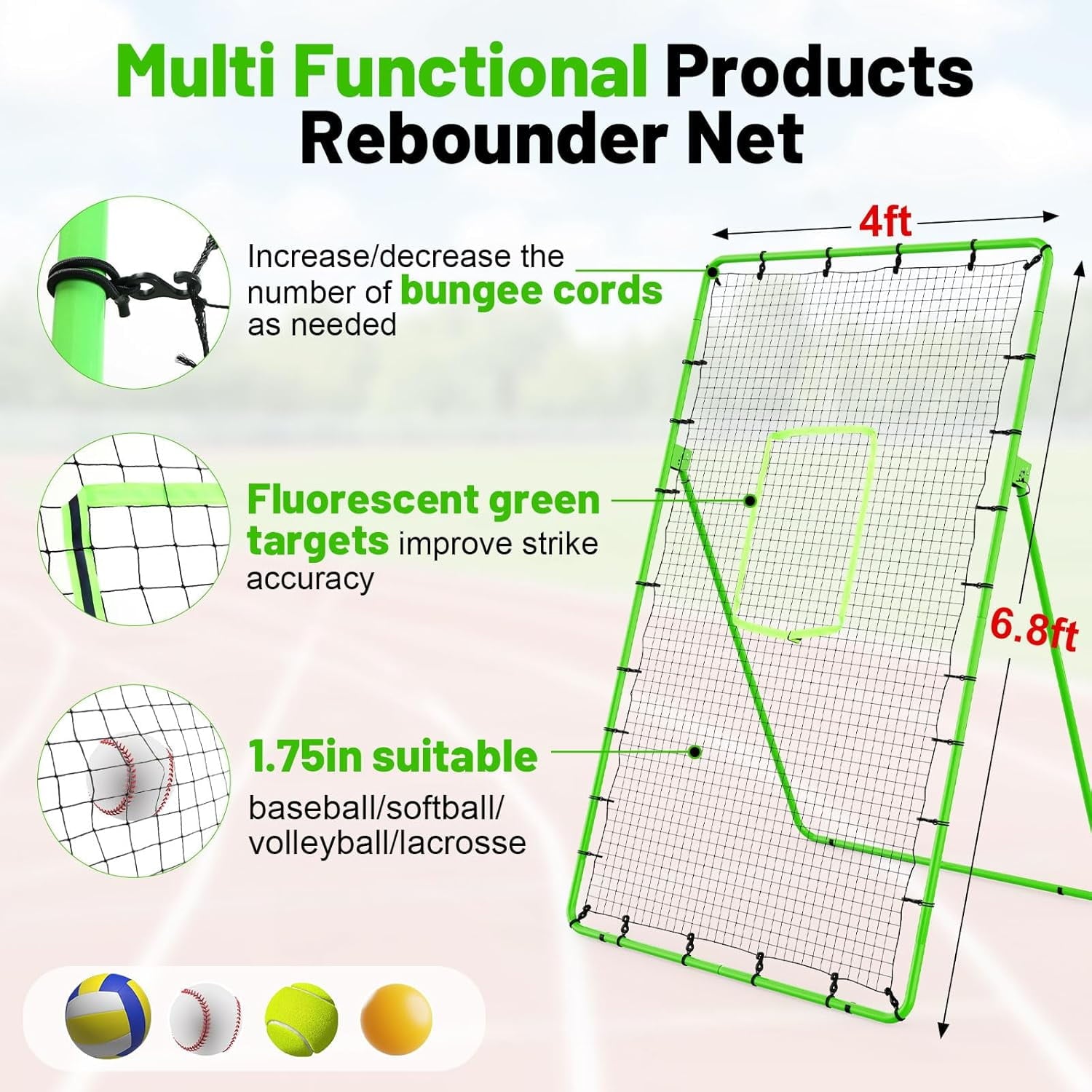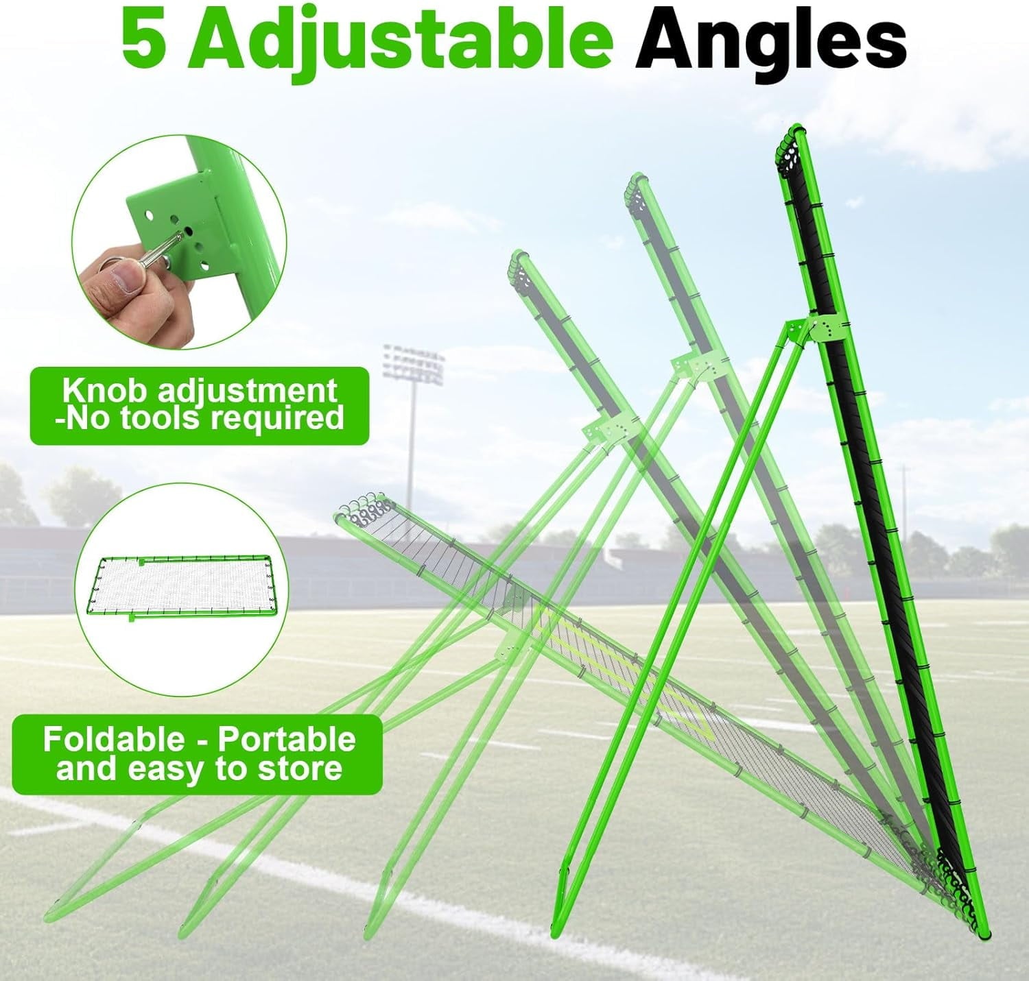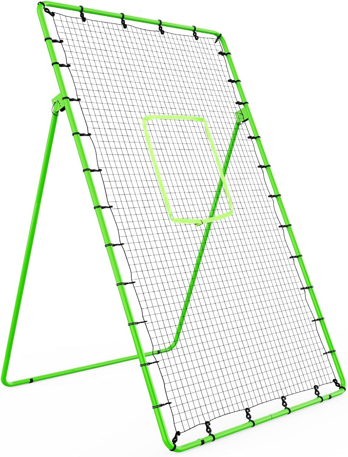 2.[Multifunction]:The soccer rebounder net has 5 adjustable angles, you can adjust the angle of the pitching net according to your level and training needs at any time. Different angles can be used for practicing baseball, softball, volleyball, soccer, and lacrosse. We also provide you with an adjustable fluorescent green pitching target, which makes it easier for you to see the target and improves hitting accuracy.