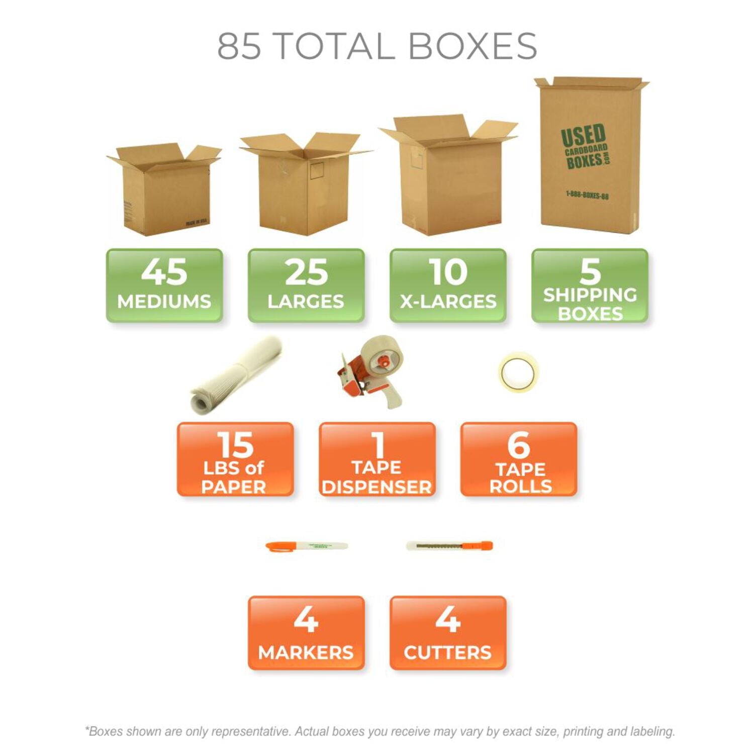This Moving Kit has 80 total USED moving boxes, including: