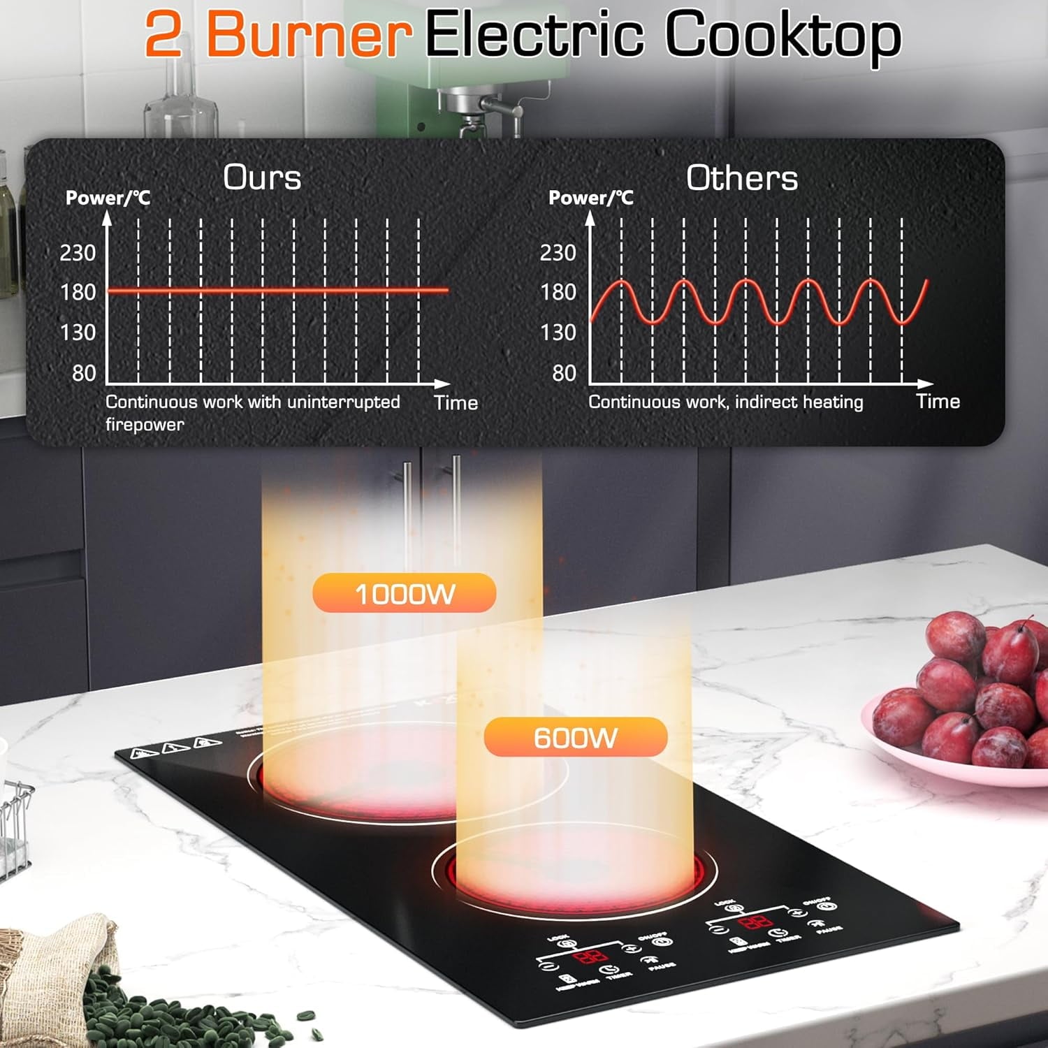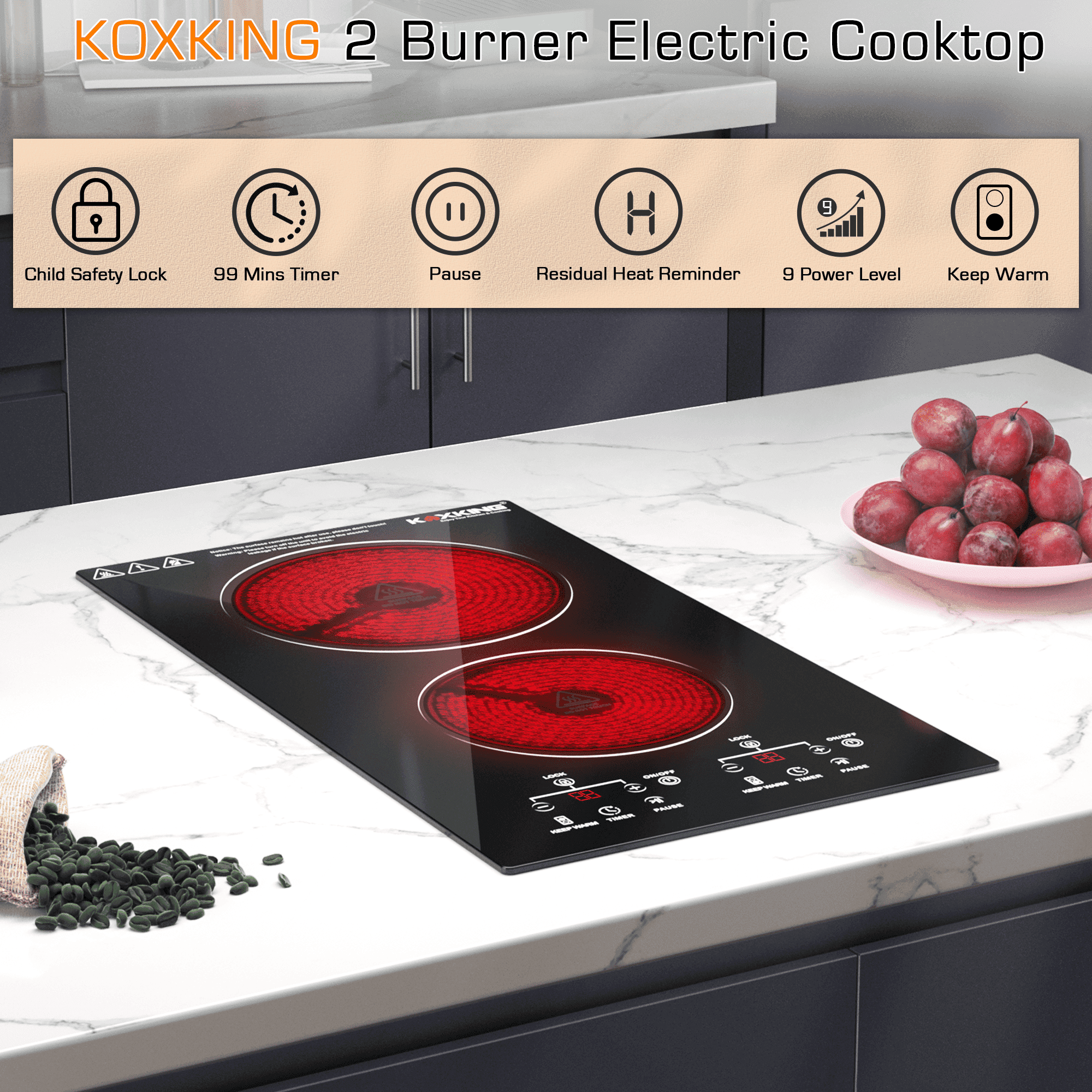 Safety Protection: Each burner of this 220v electric stovetop adopts multiple safety devices, such as overheat protection, hot surface indicator, child lock and automatic shutoff.