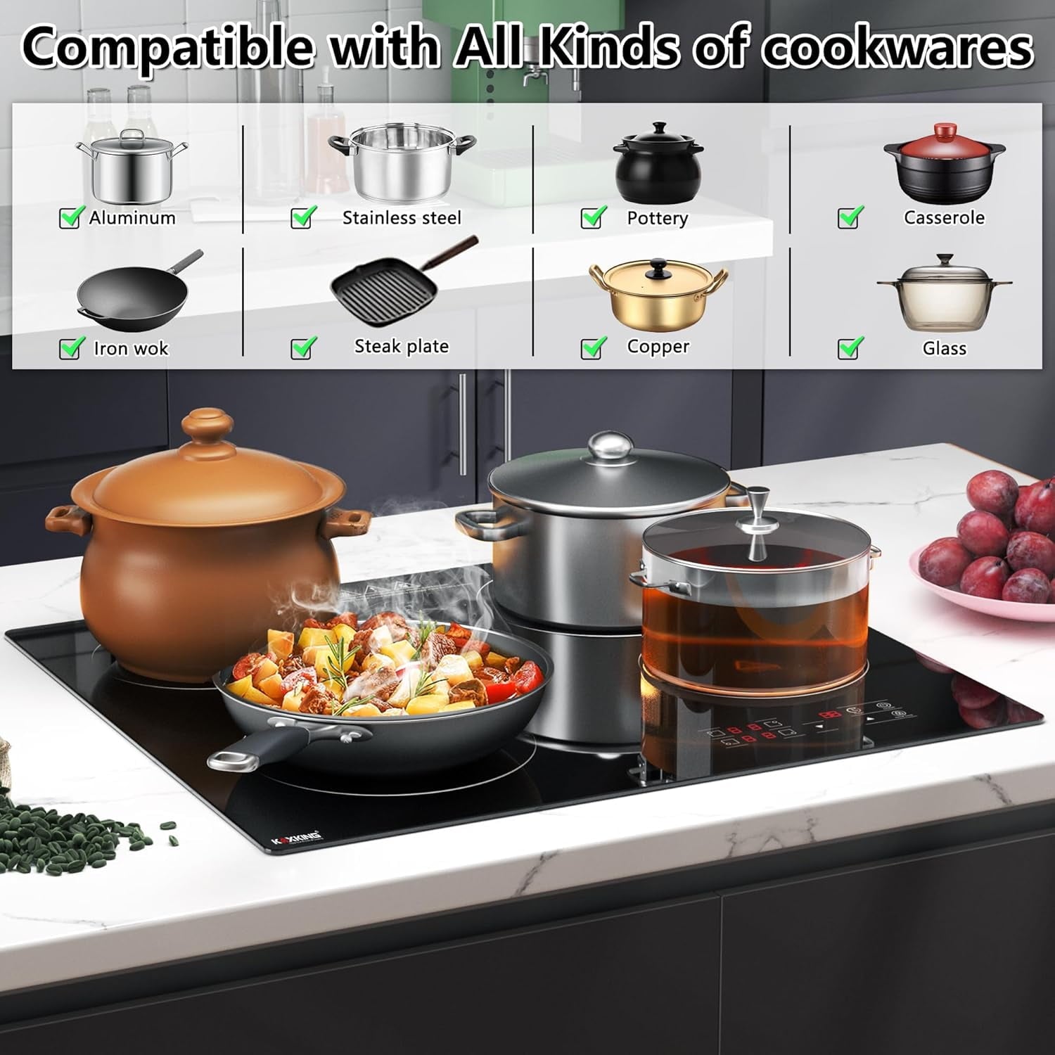 - Applicable to All Cookware: 4 burner electric cooktop, heated by coils, is more versatile compared to an induction hob as it can accommodate a wider range of cookware types, including stainless steel, ceramic, and enameled, provided they are heat-resistant with flat bottoms. The product dimensions of the electric cooktop are 23.22” x 20.47” x 2.04”, with an opening size of 22.04” x 19.29”. Please refer to the instruction manual for installation instructions. If you have any questions, feel free to contact us; we offer lifetime technical advice and customer service.