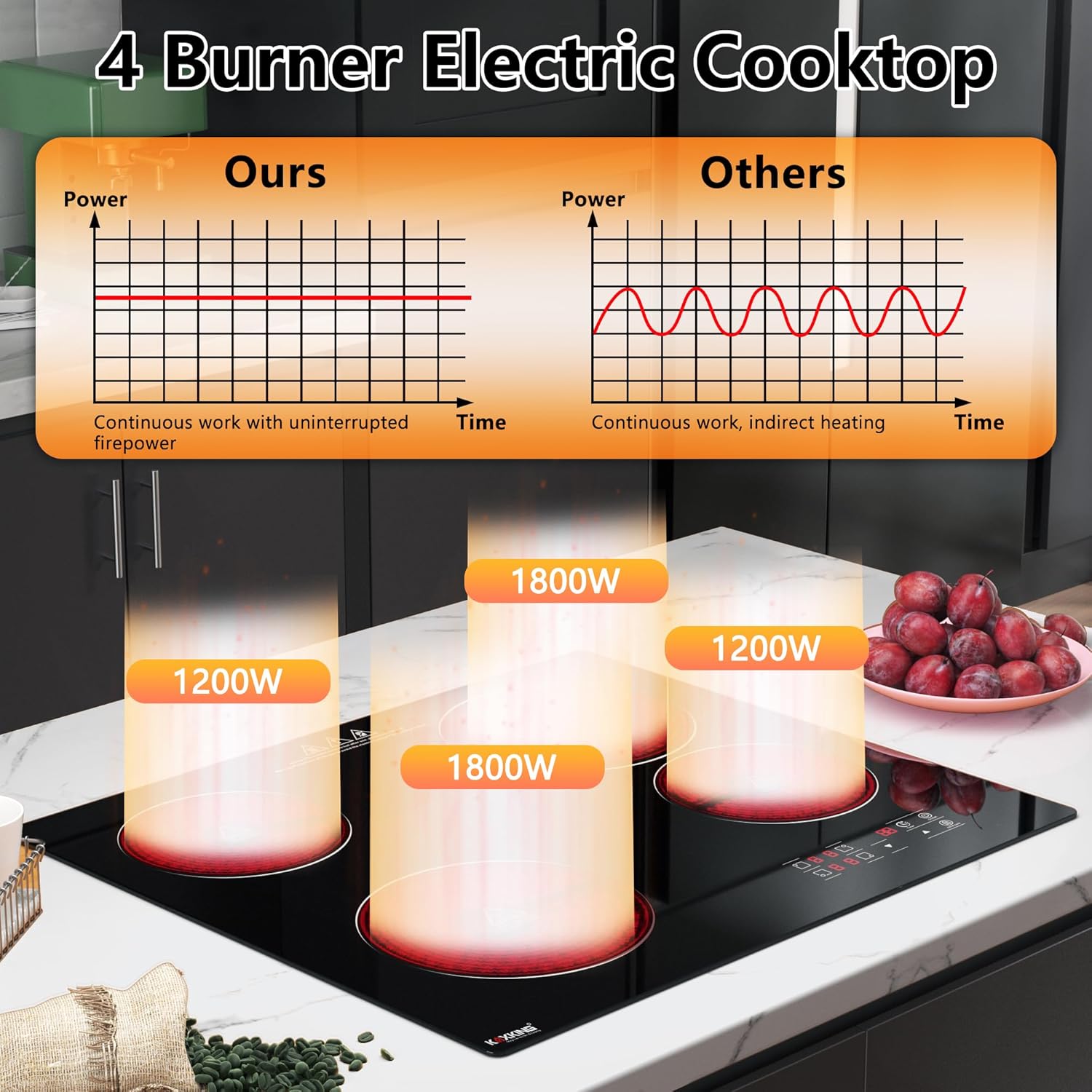 High Power: This electric cooktop features 4 high-power burners – 1800W, 1200W, 1800W and 1200W – each operating independently. Generous zones and efficient heating ensure fast cooking, with a total power output of up to 6000W. The electric cooktop does not come with a plug; hard wiring (220-240V) is required.