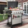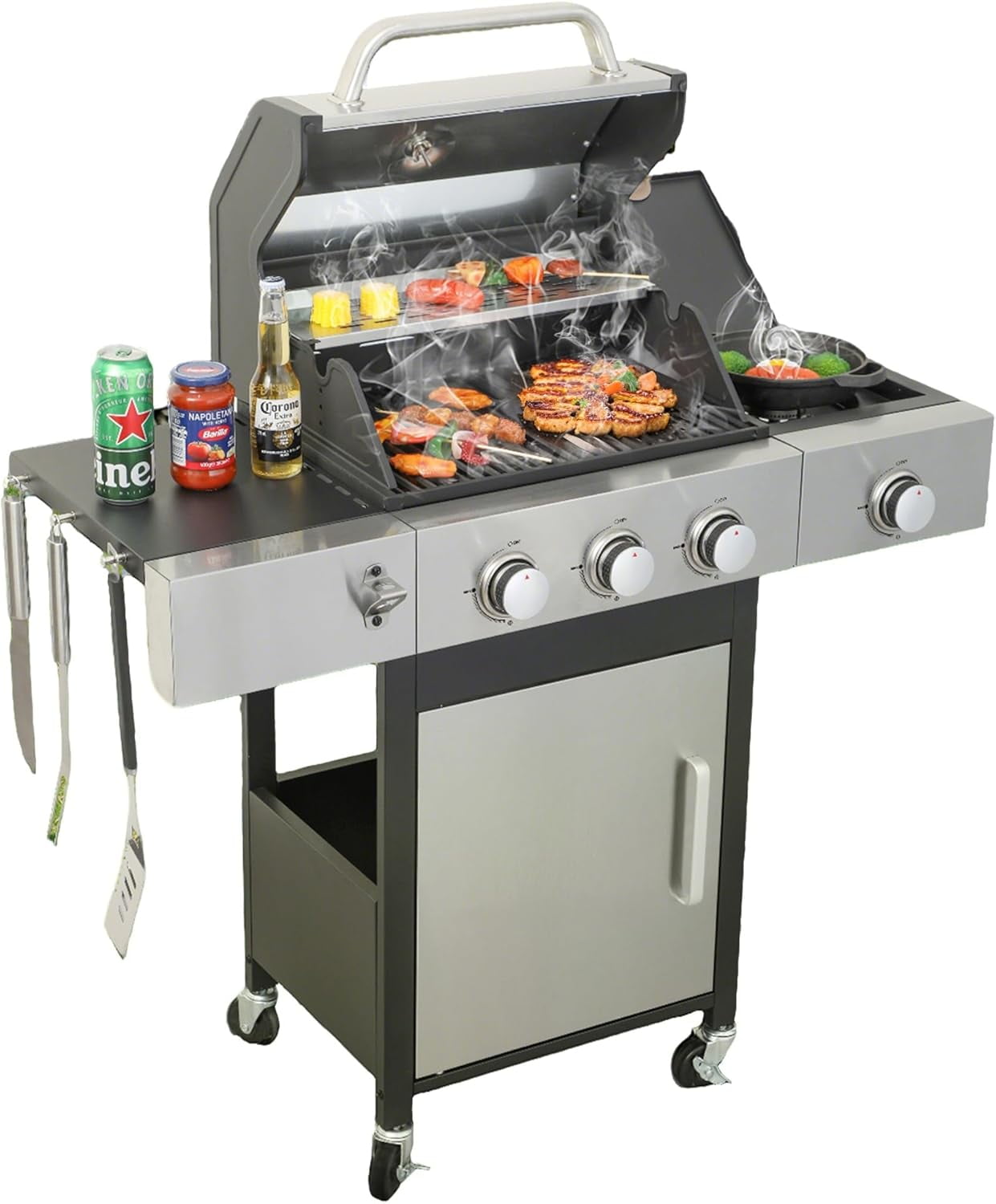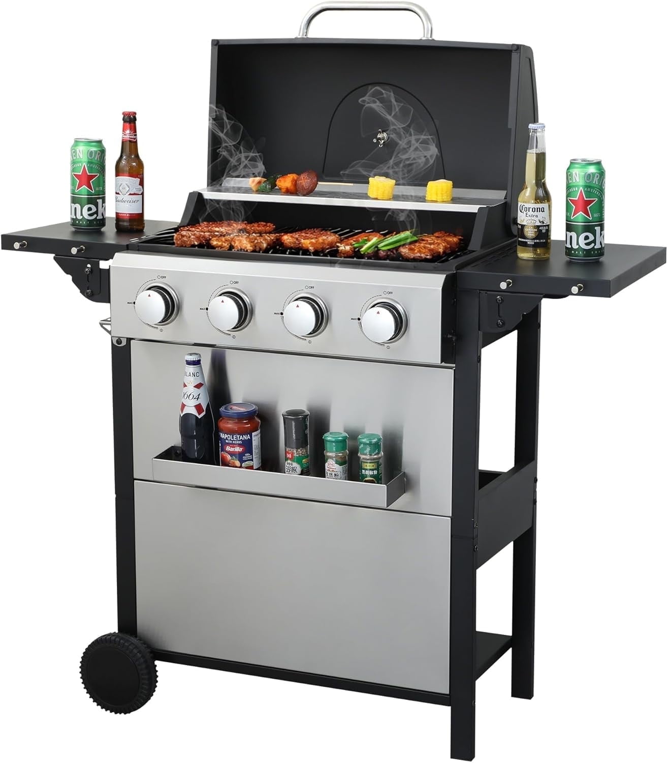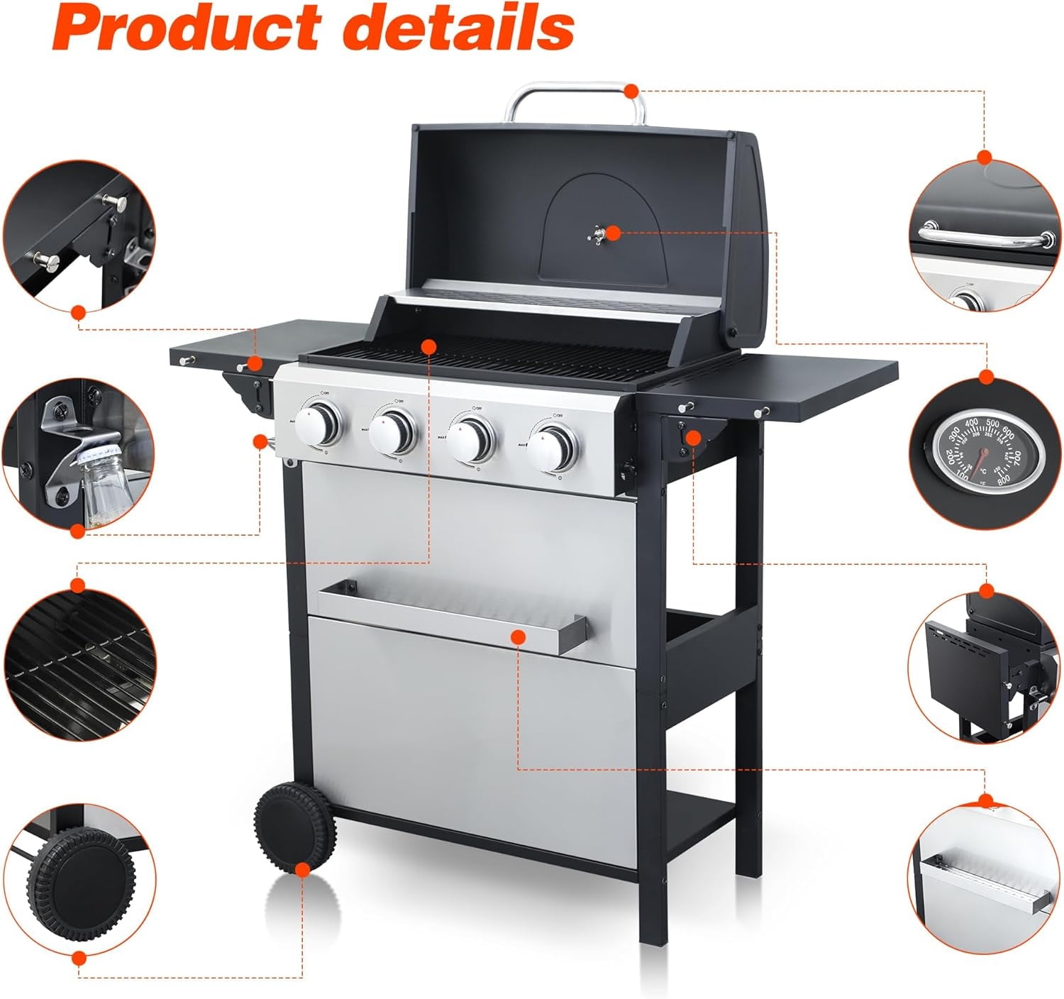 Home Outdoor Gas Grills 4-Burner Propane Gas BBQ Grill, 34200BTU Output With Wire Enamel Cooking Grids For Outdoor Barbecue, Foldable Side Table, Hanging Basket, Stainless Steel
