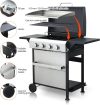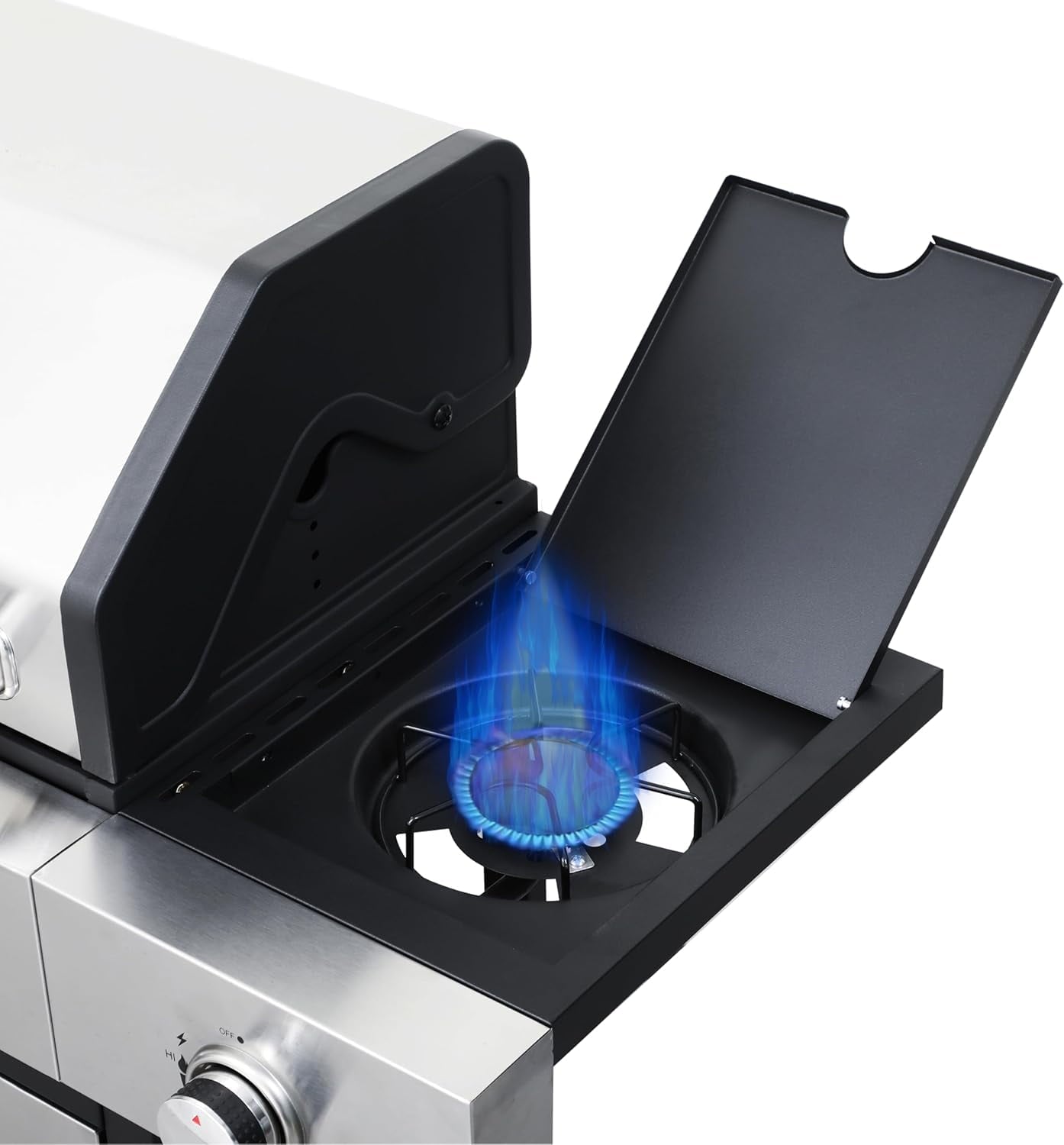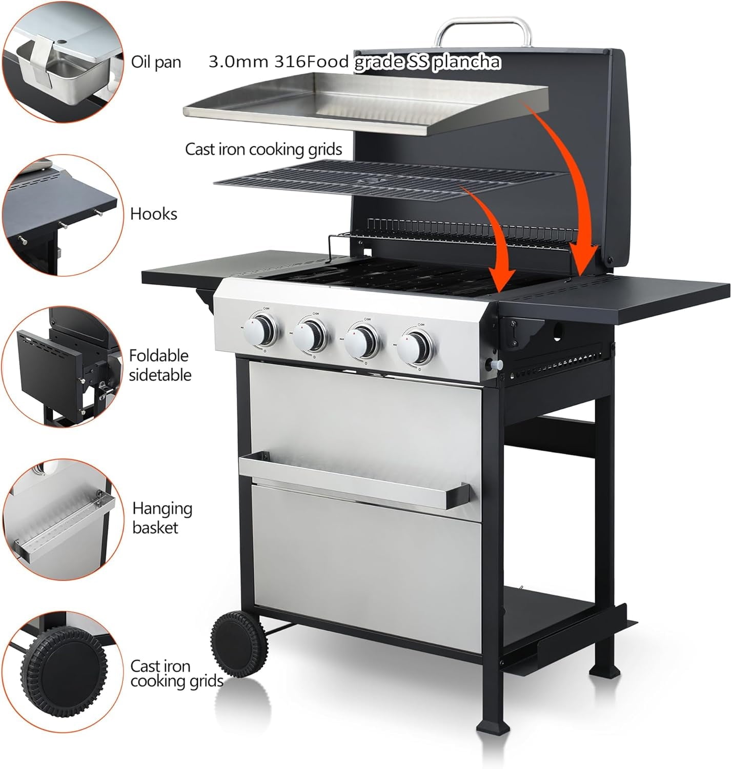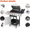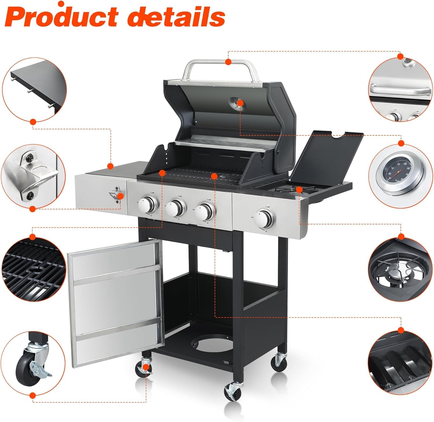 4-Burner Propane Gas BBQ Grill, 34200BTU Output With Wire Enamel Cooking Grids For Outdoor Barbecue, Foldable Side Table, Hanging Basket, Stainless Steel