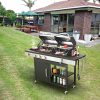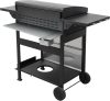 • The barbecue grill is equipped with a foldable side table for convenient preparation of ingredients. The side is equipped with hooks that can hang tools or accessories. In addition, it is equipped with a stainless steel thermometer for easy monitoring of barbecue temperature.