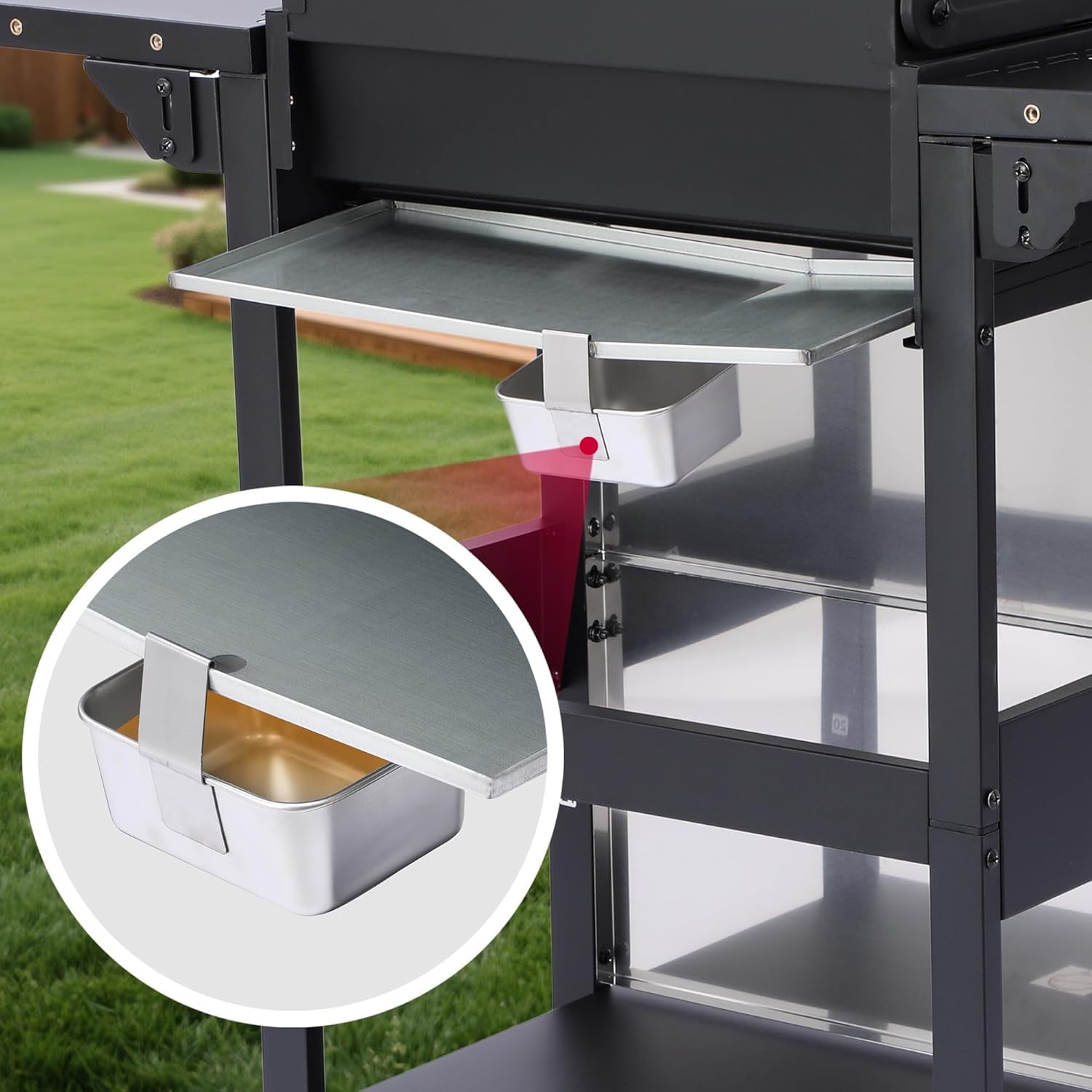 Thermometer, Side table, 1 bottle opener&4 hooks, 2 wheels, Stainless steel waming rack