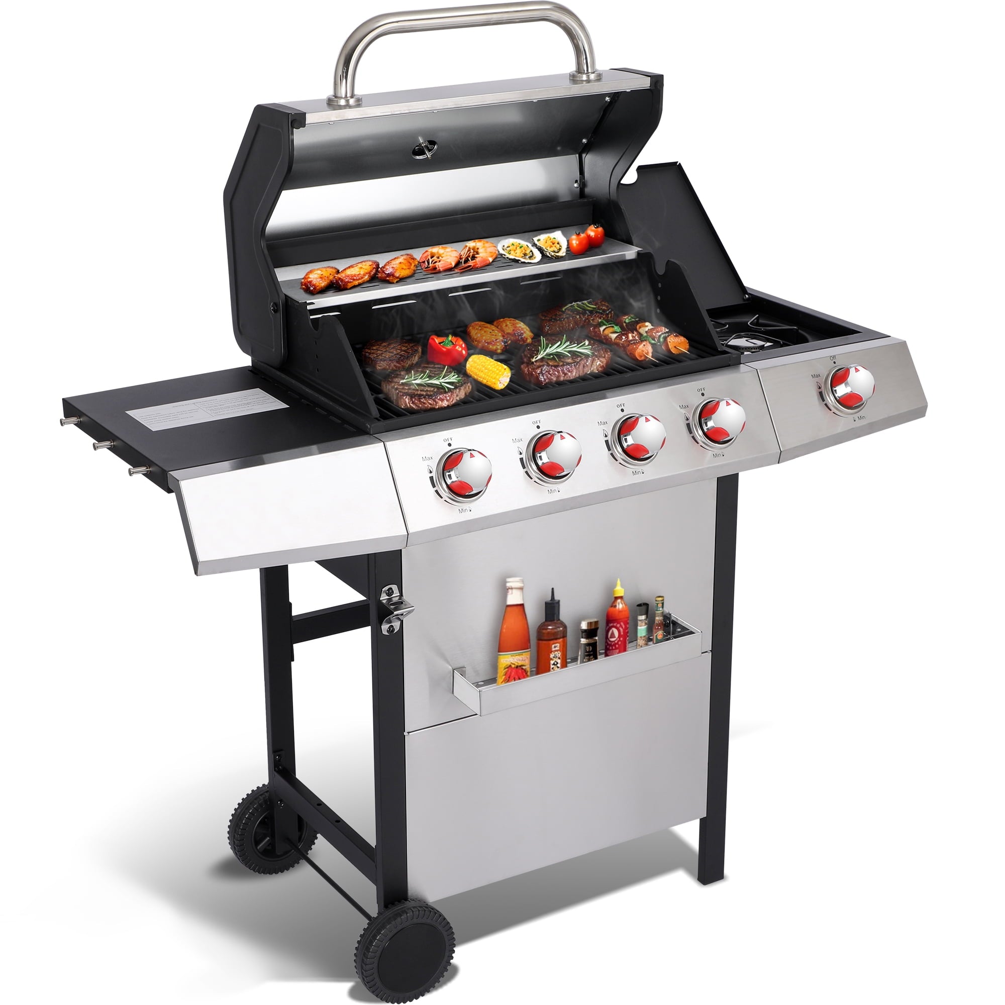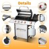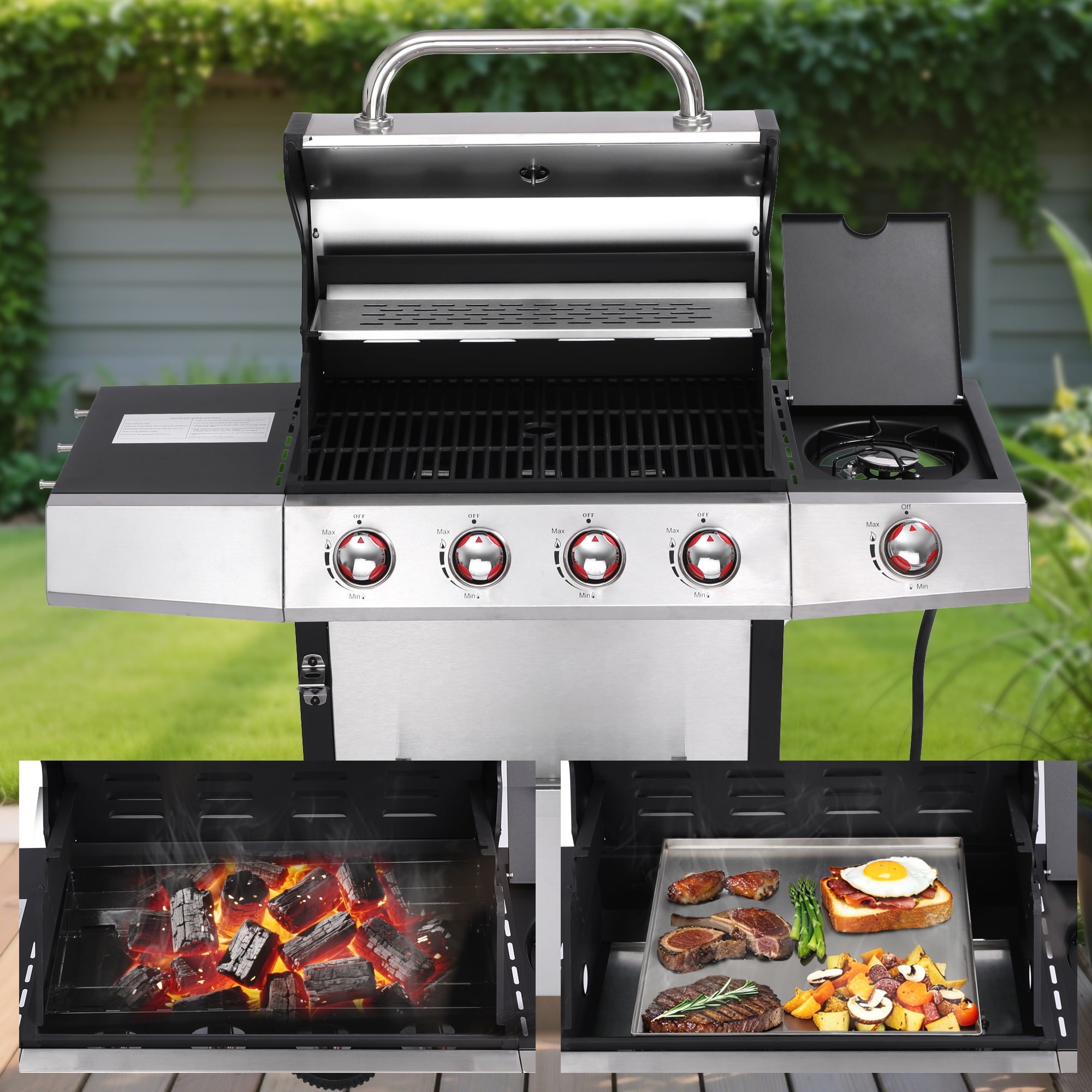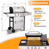This versatile propane gas grill offers three cooking methods in one appliance. Its robust 4+1 burner system provides ample power, while a heavy-duty cast iron griddle plate is perfect for pancakes or stir-fries. For smoky BBQ flavor, use the dual enamel charcoal pans. With a spacious 448 square inch total cooking area, you’ll have plenty of room for all your culinary creations. This grill is designed for propane gas only and provides a convenient way to grill, griddle, and smoke your favorite foods. Enjoy the flexibility and convenience of this all-in-one outdoor cooking solution.