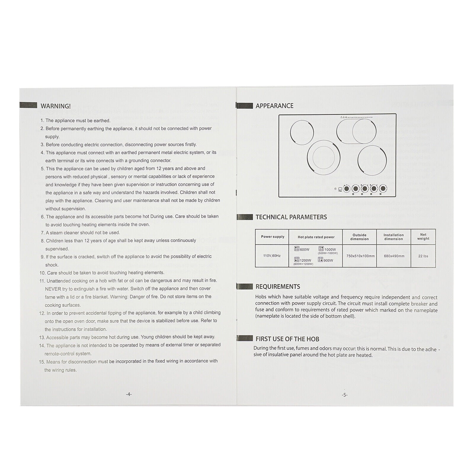 4 Burners Electric Cooktop, Knob Control Built-in Ceramic Cooktop, 23″ Radiant Electric Cooktop Stovetop with Timer, 5 Heating Level, 3400W, 110V, Hard Wire