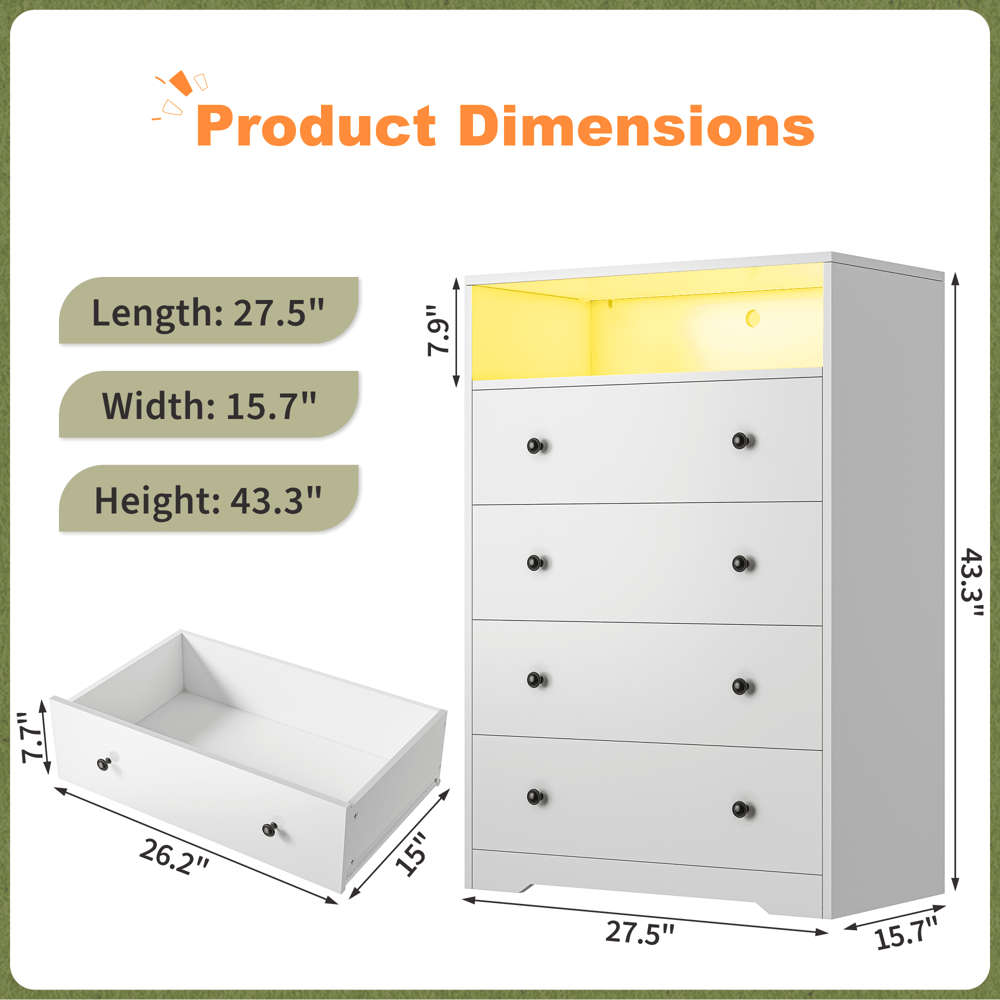 • ‌【Sufficient of Storage Space】This ​​tall wood dresser (27.5″W x 15.7″D x 43.3″H),features ​​4 spacious wooden drawers designed to organize clothes, scarves, socks, T-shirts, pants, and sunglasses effortlessly. The ​​open-top shelf​​ provides quick-access storage for daily essentials like keys or jewelry.