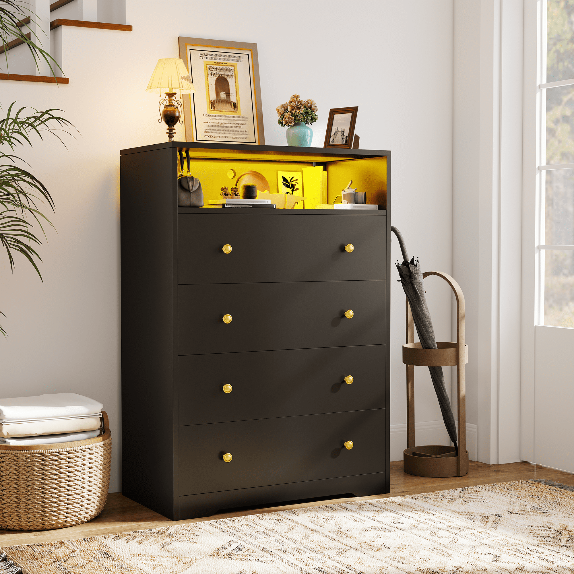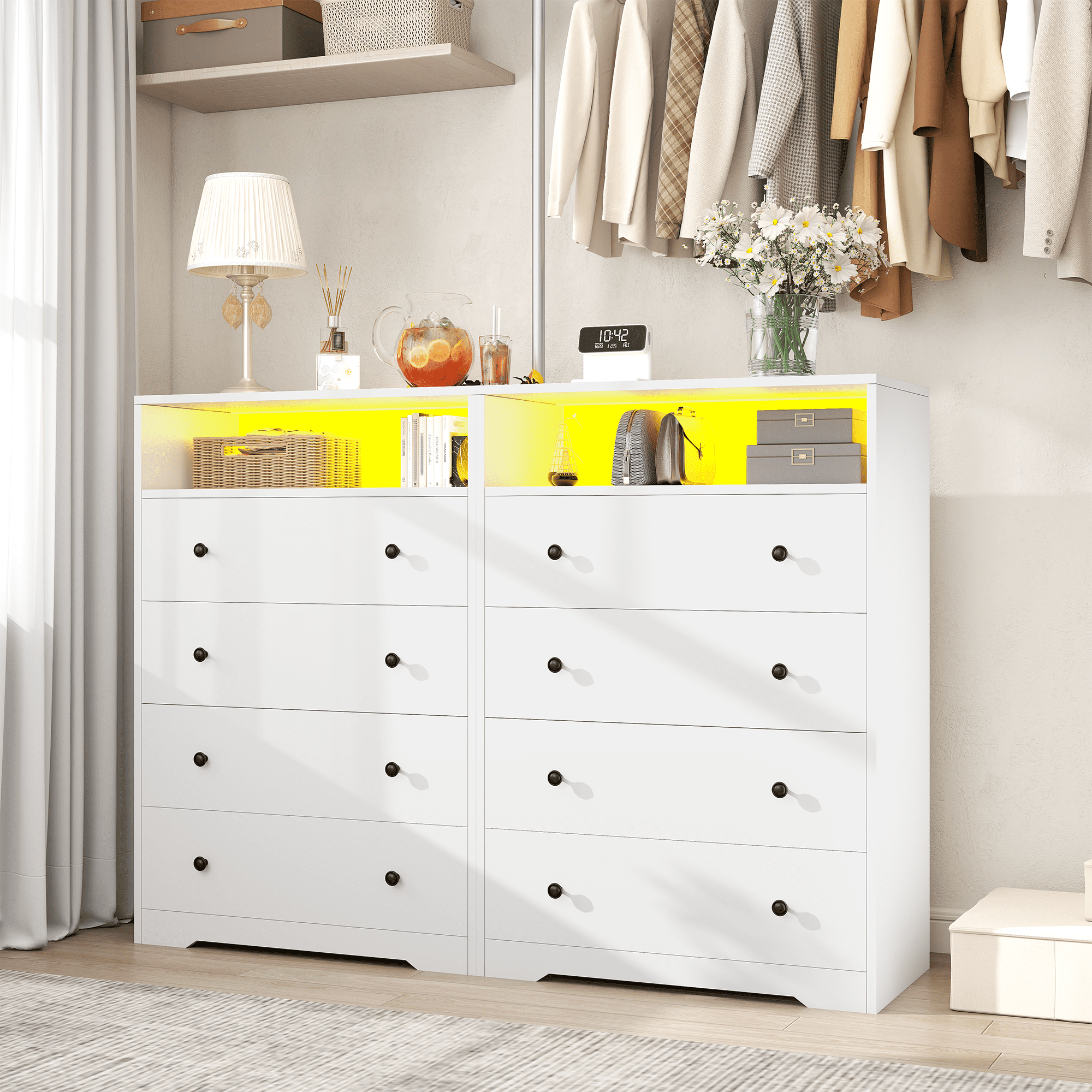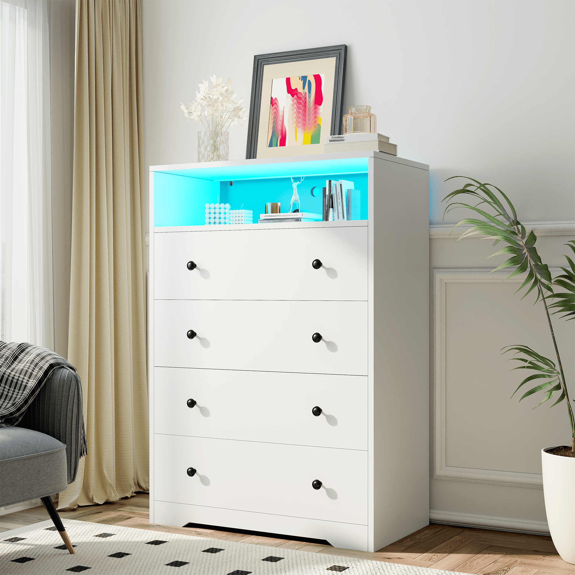 This modern dresser combines ​​four large-capacity drawers​​ and an open display shelf​​ to organize clothes, blankets, scarves, and toys while showcasing decor like artwork or diffusers. The ​​7-color LED lighting​​ creates a stunning ambiance with customizable modes—no app needed for quick adjustments. Designed for multi-room flexibility, its ​​space-saving design​​ fits seamlessly in bedrooms, living rooms, or hallways.