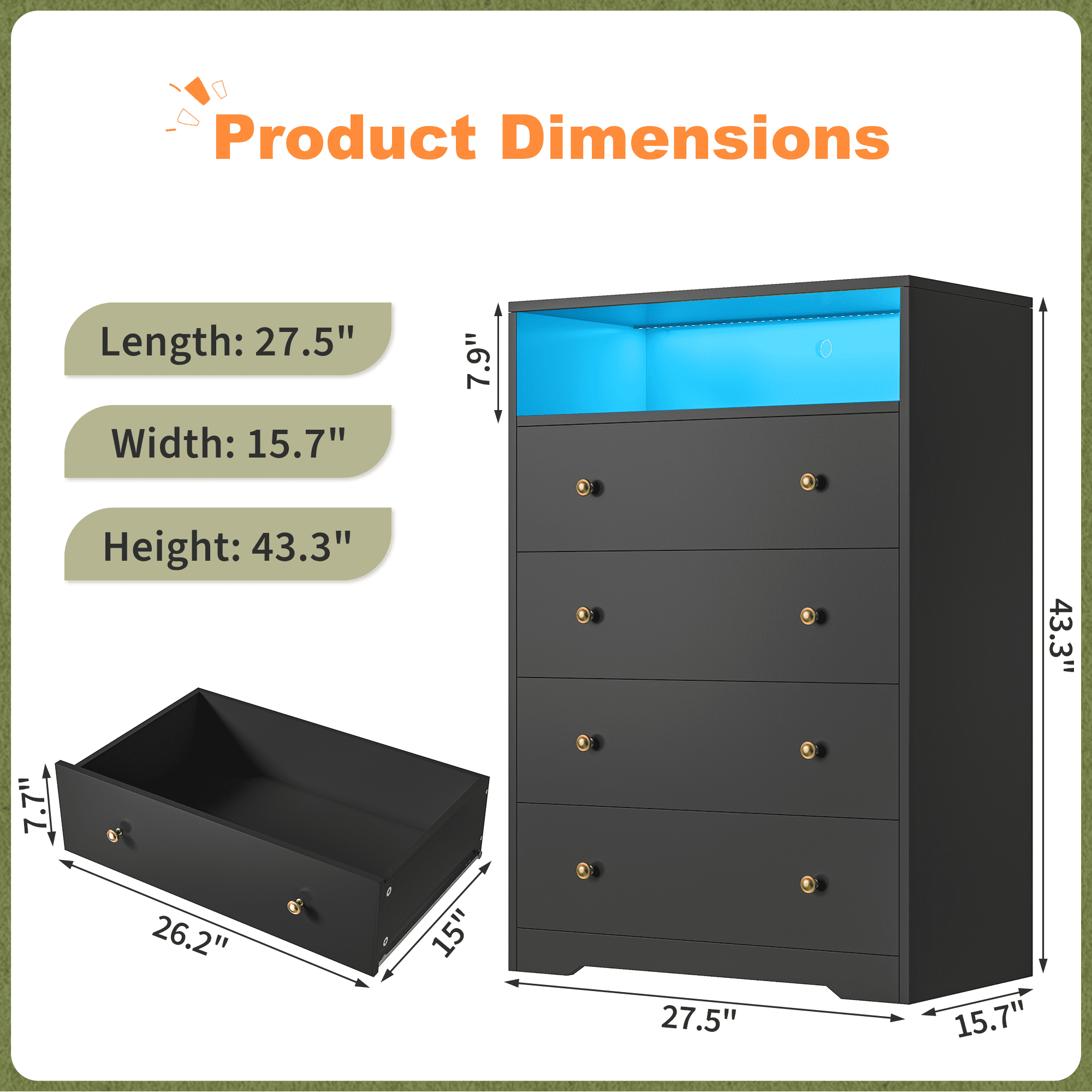 • 【Black Dresser with Multiple Modes LED Lights】The dresser with a built-in LED strip that allows you to remotely control the color and brightness of the LED lights, adding a fun and playful touch while providing gentle illumination for bedtime or nighttime routines.
