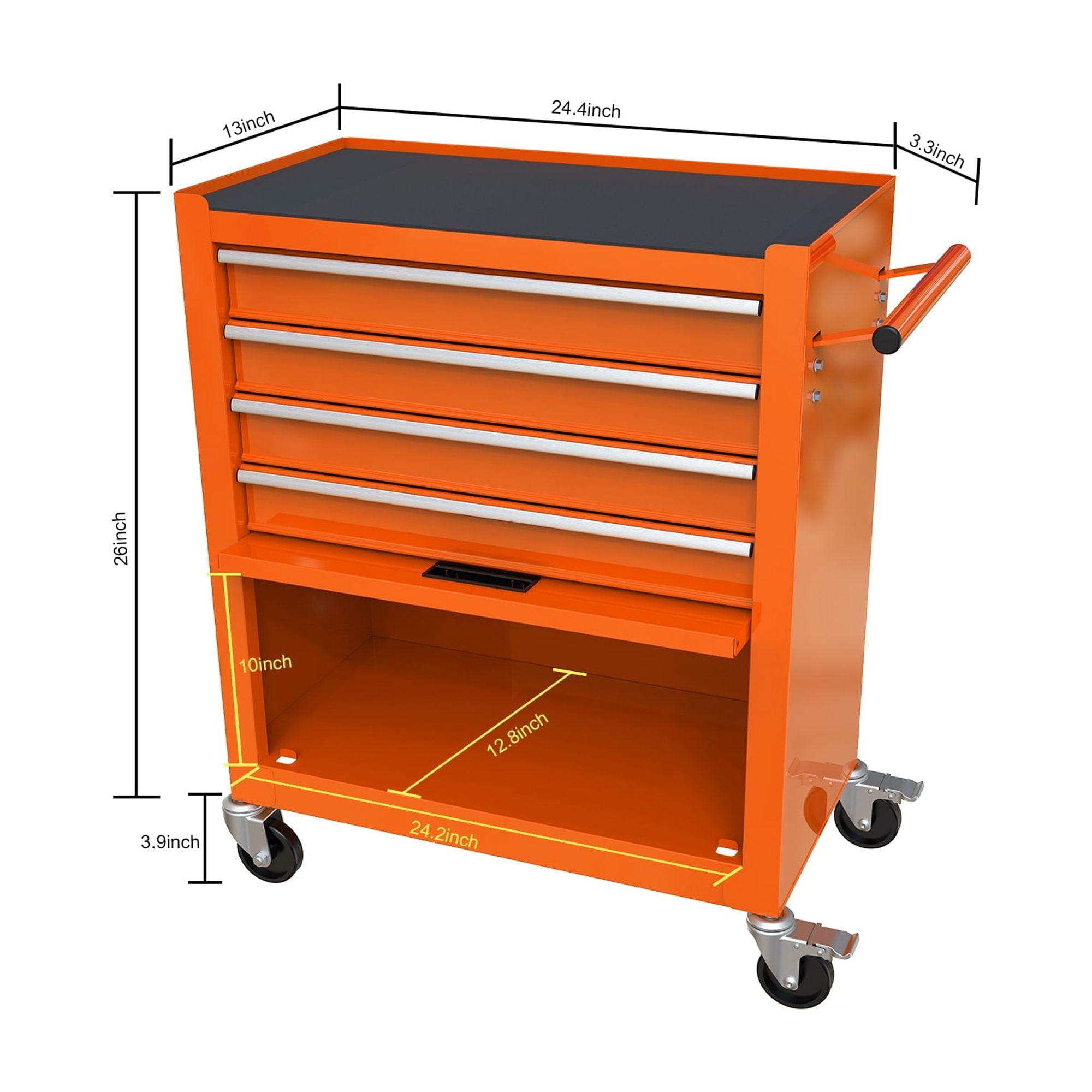 - 4 Drawers with Wheels Drawers can easily accommodate needed items such as folders, notebooks, tools, etc.