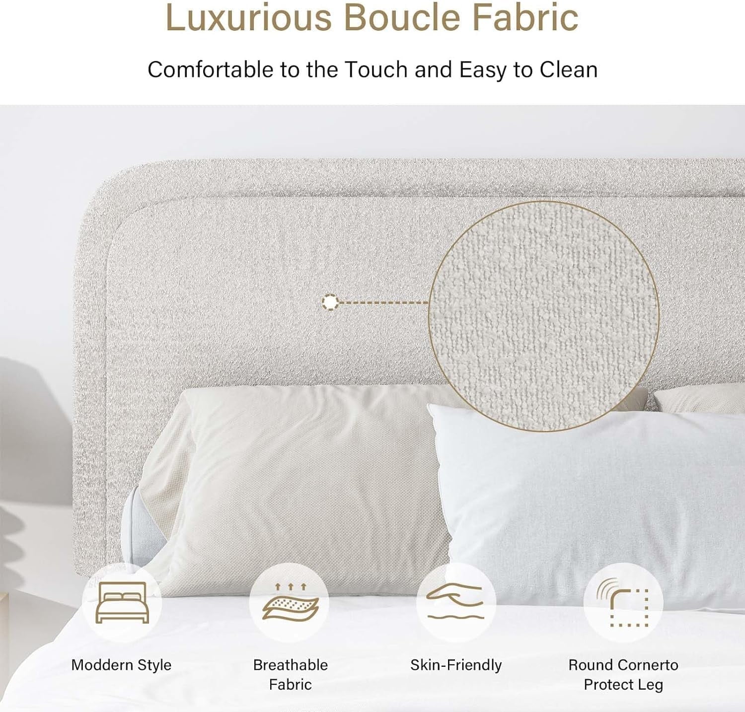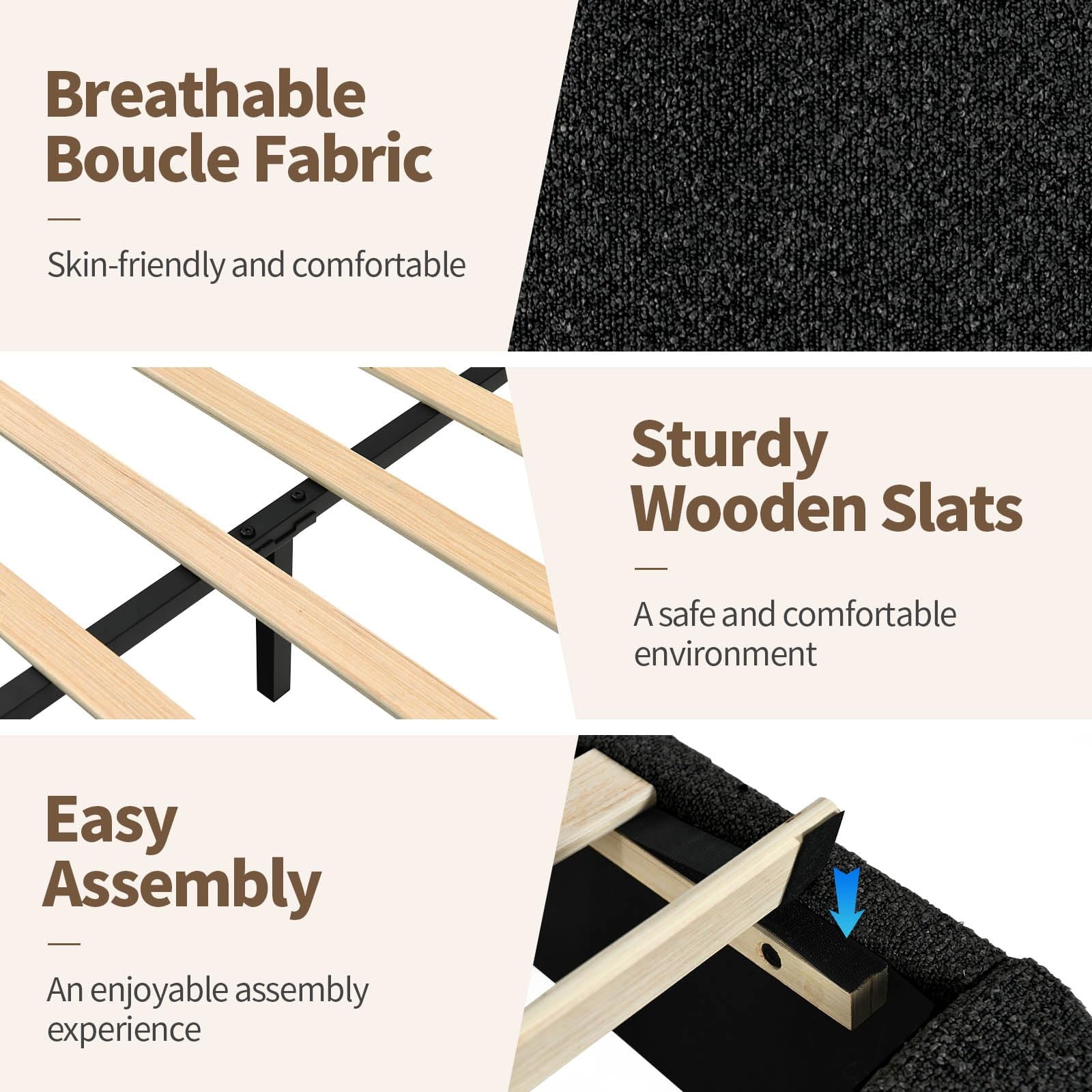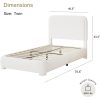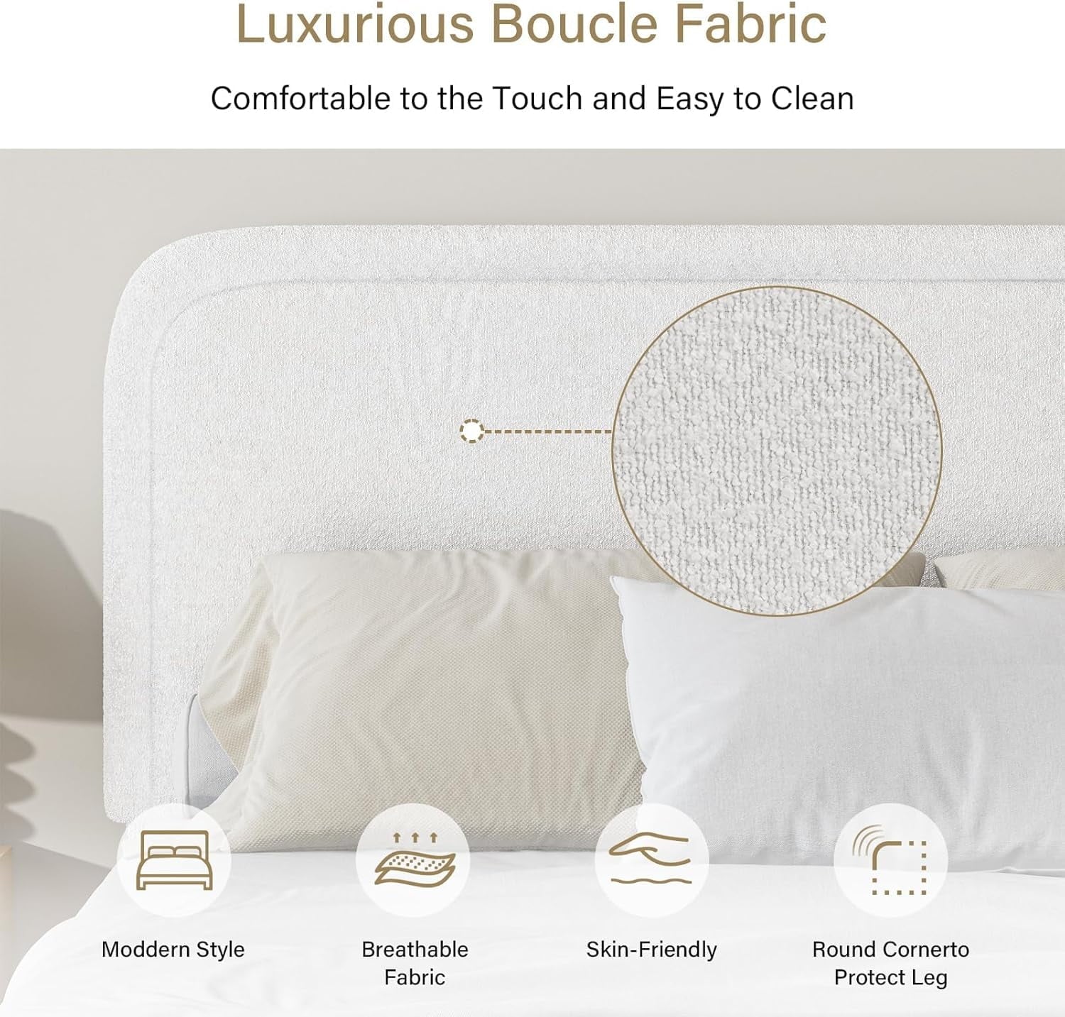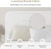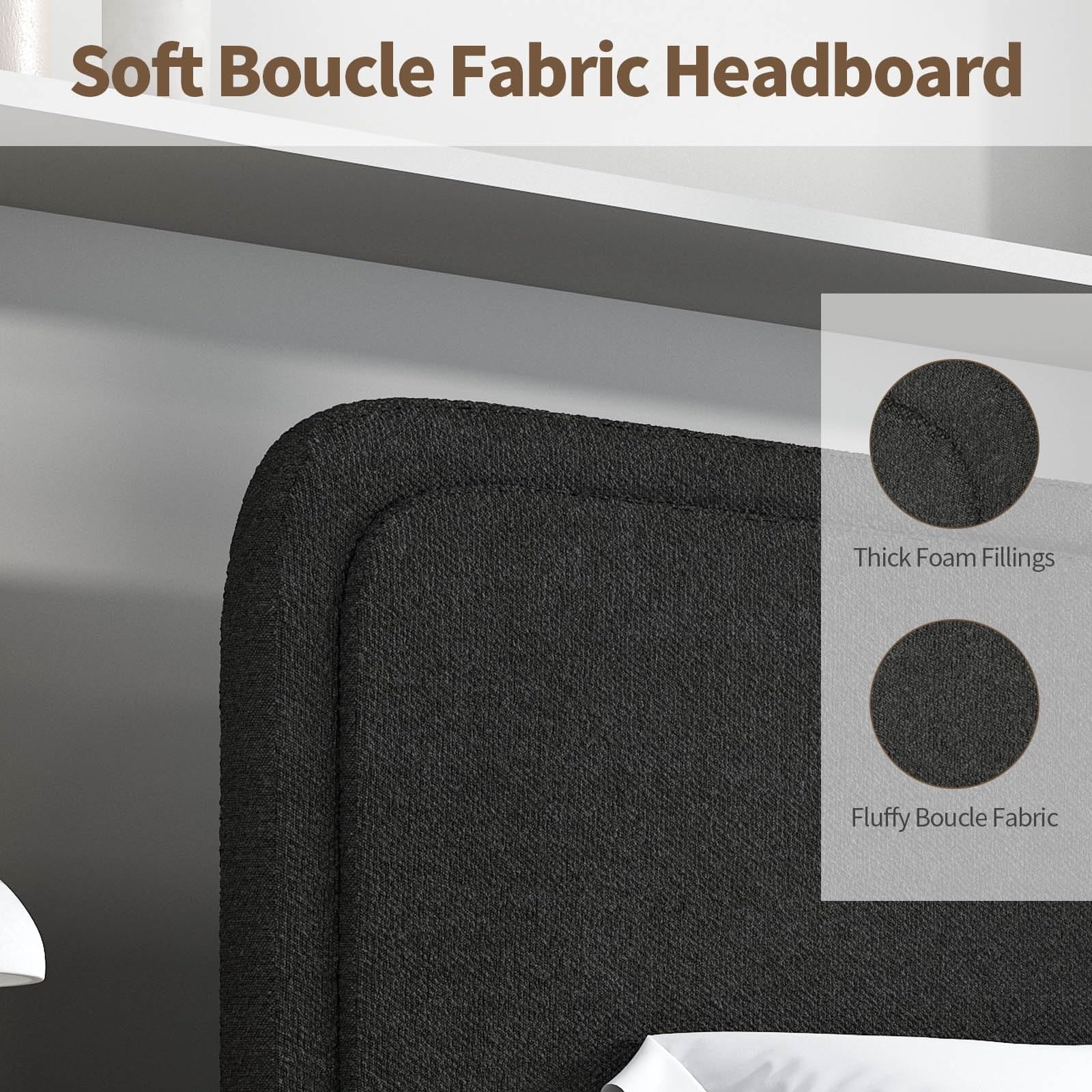 - Rounded Curved Headboard Design —– The twin bed frame with soft round curved headboard design, This upholstered platform bed is made of boucle fabric, with contemporary and warm feel, making it a perfect addition to any bedroom.