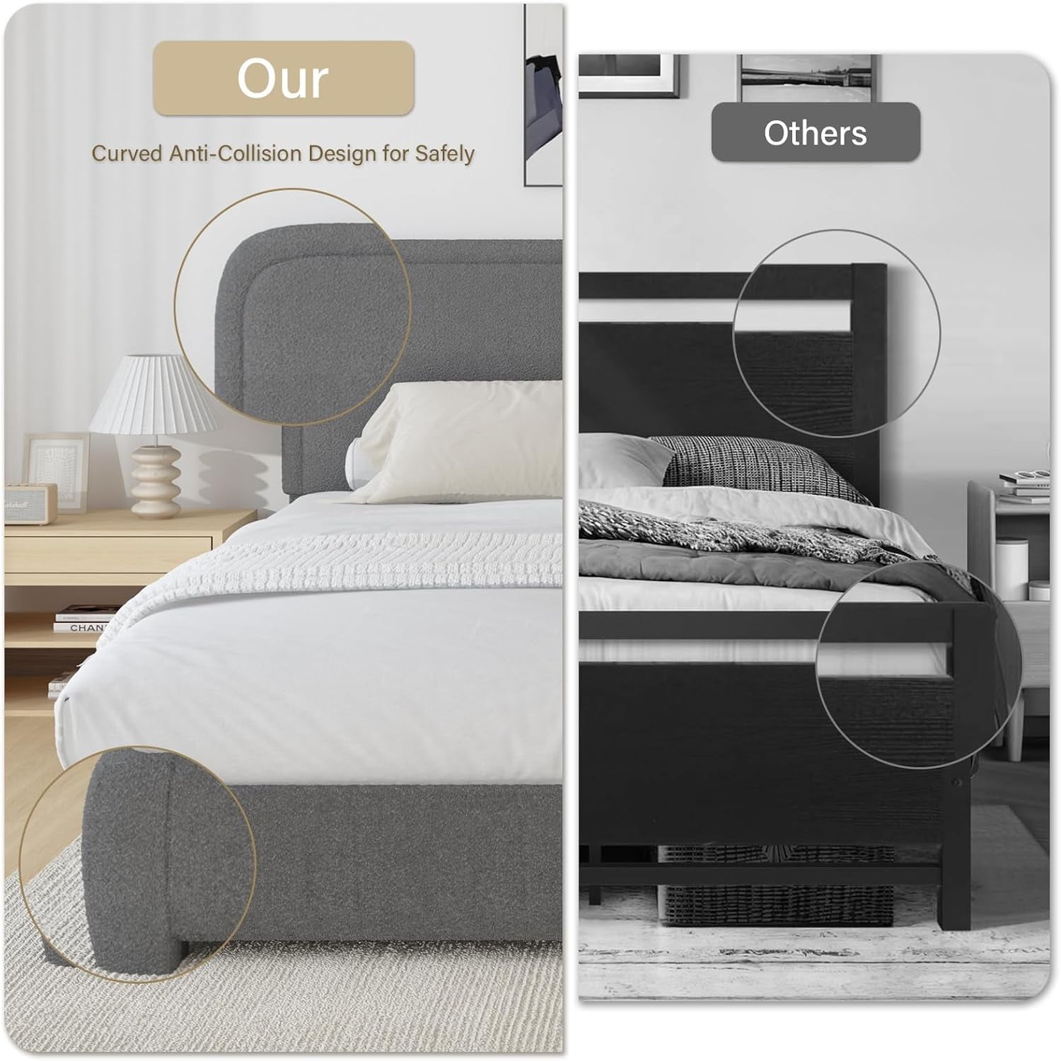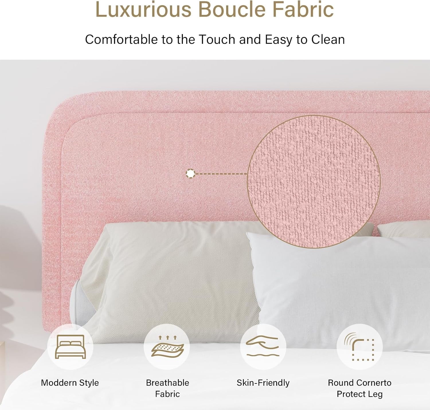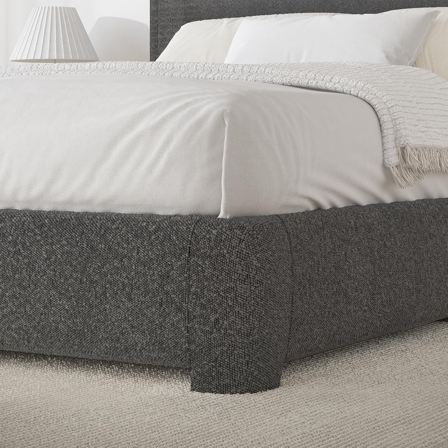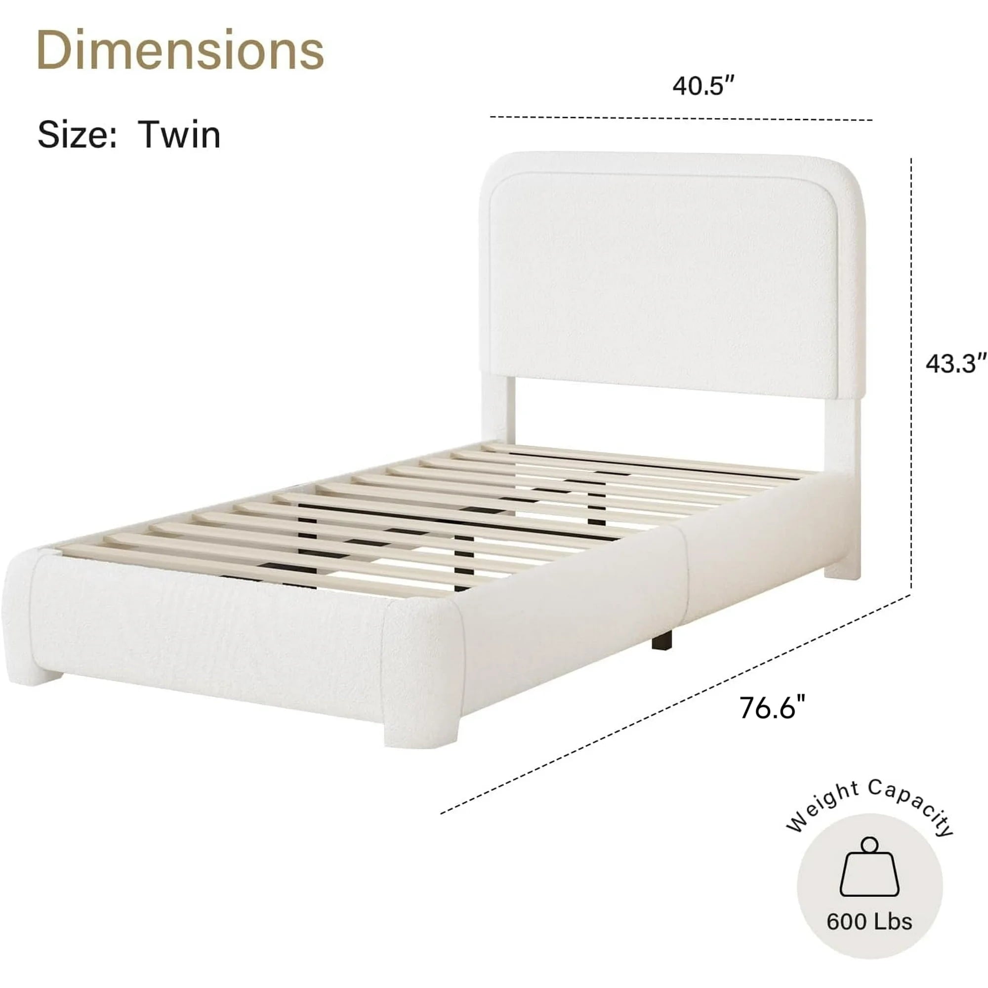 - Rounded Curved Headboard Design —– The twin bed frame with soft round curved headboard design, This upholstered platform bed is made of boucle fabric, with contemporary and warm feel, making it a perfect addition to any bedroom.