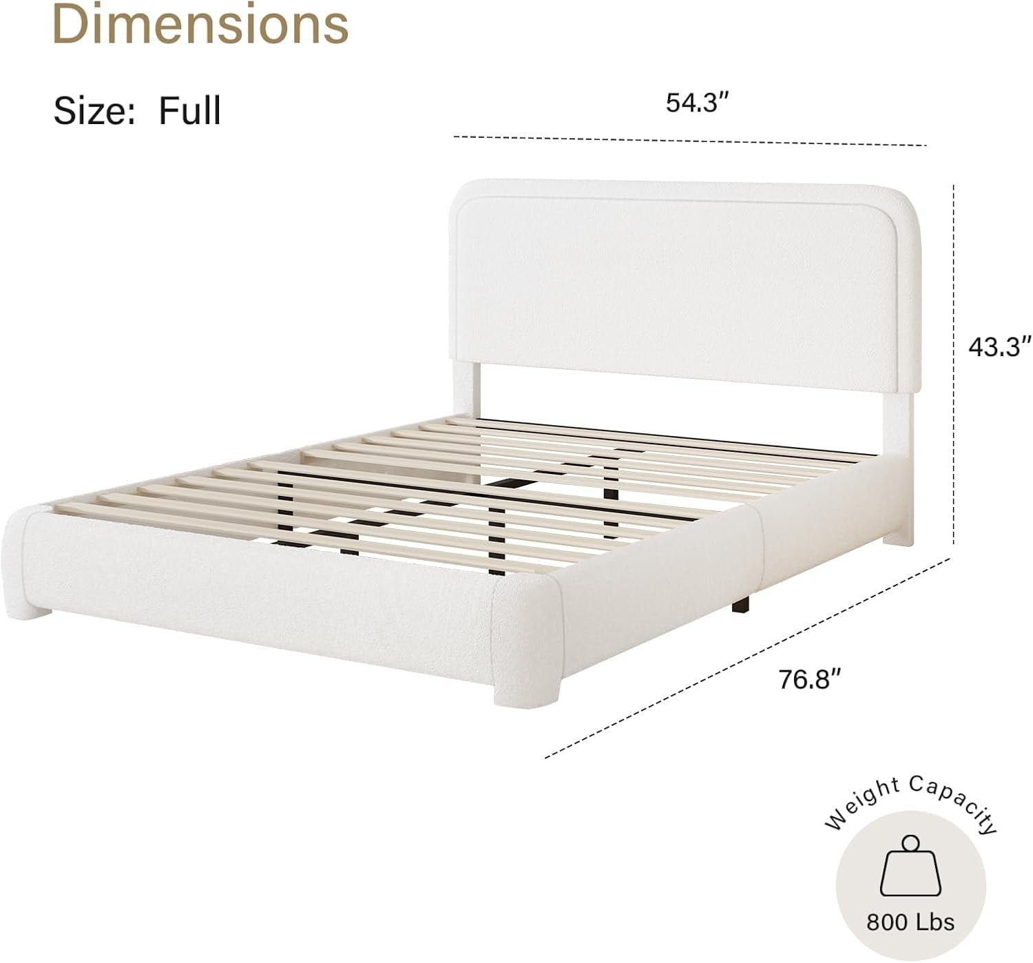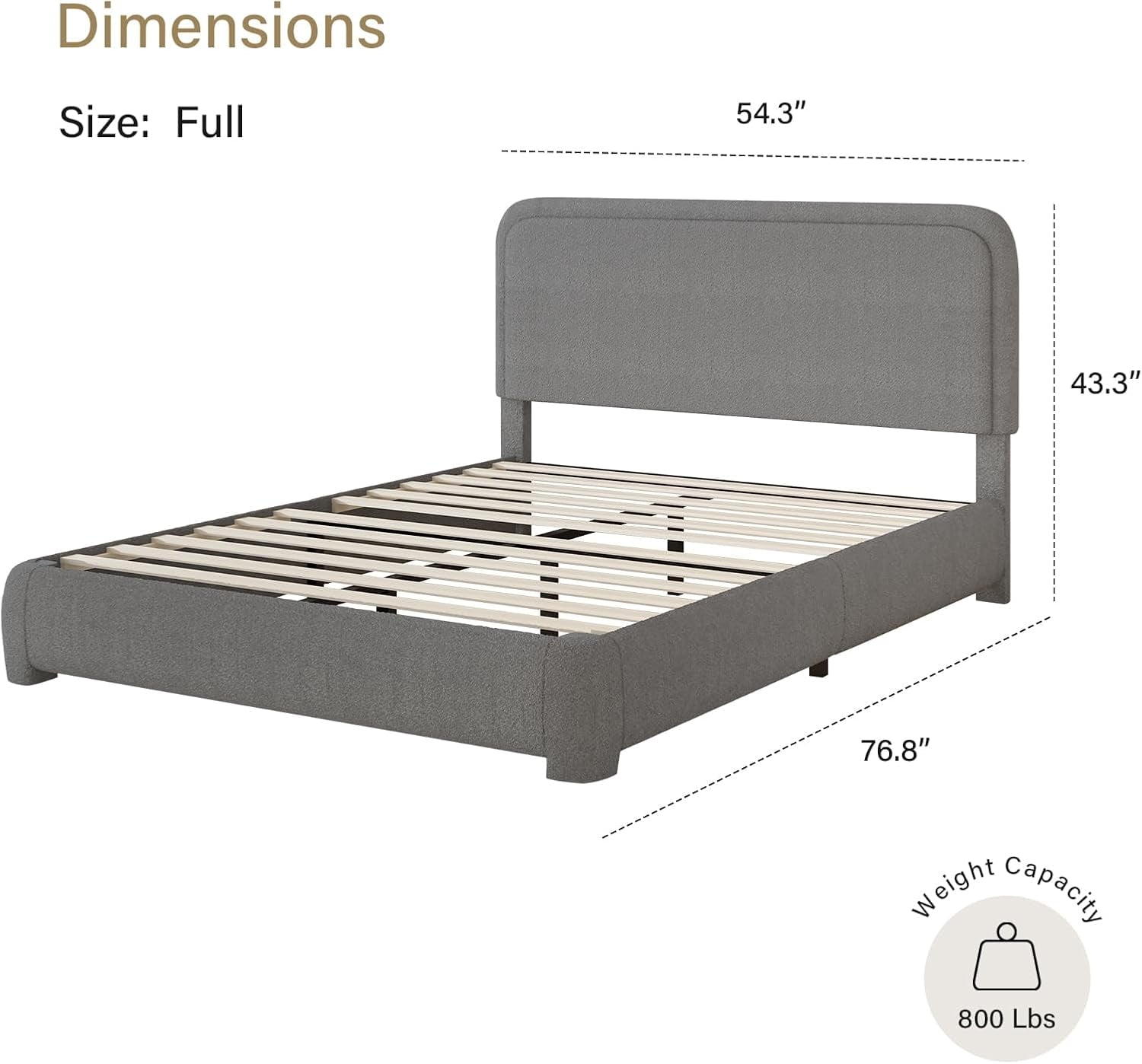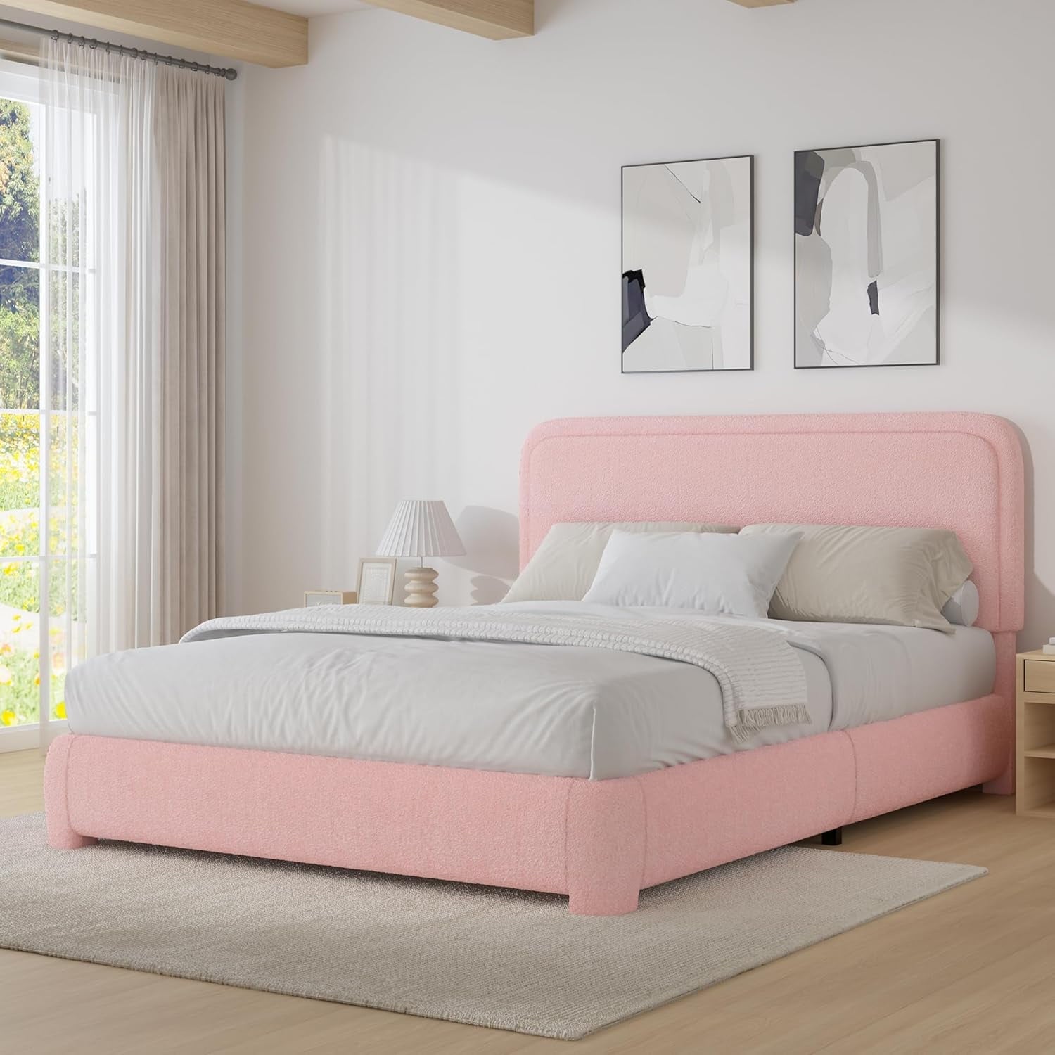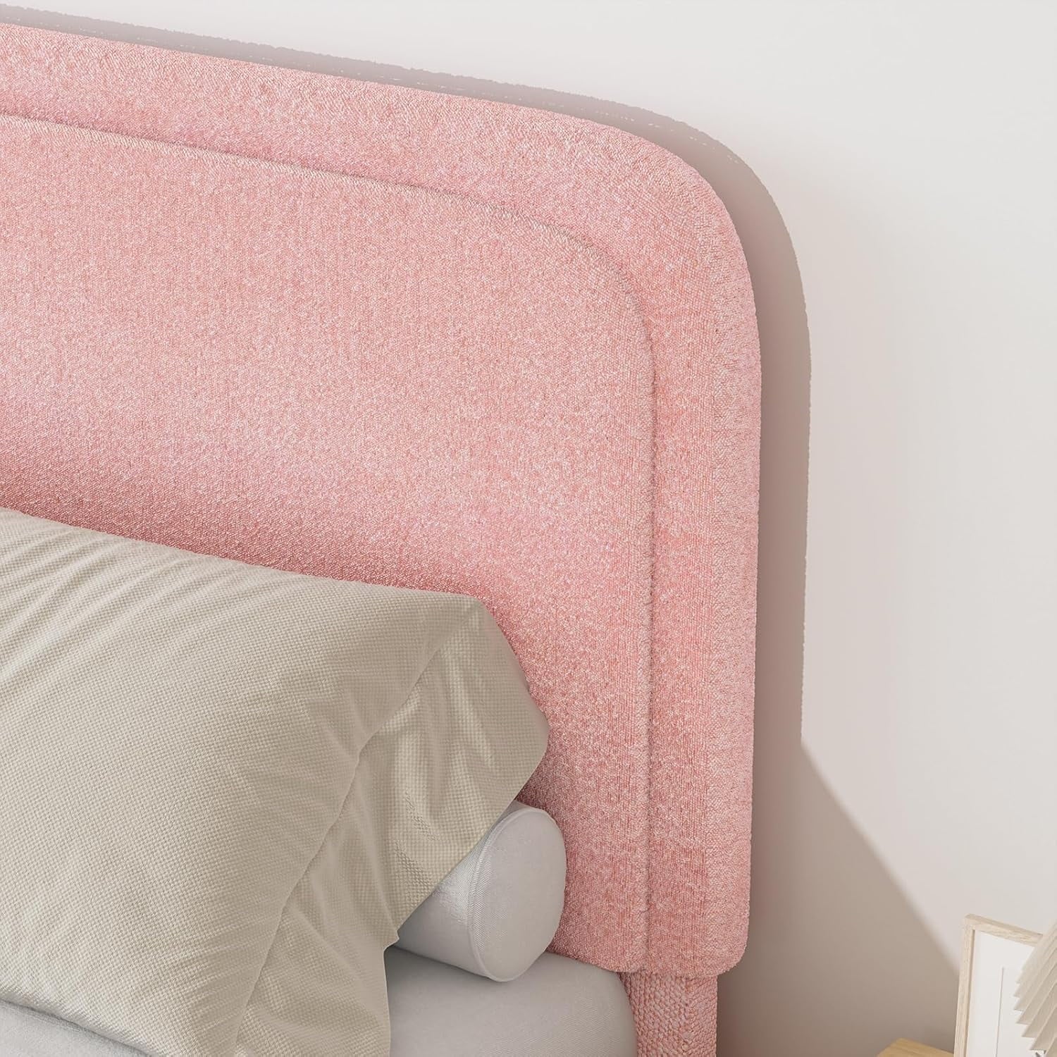 - Rounded Curved Headboard Design —– The twin bed frame with soft round curved headboard design, This upholstered platform bed is made of boucle fabric, with contemporary and warm feel, making it a perfect addition to any bedroom.