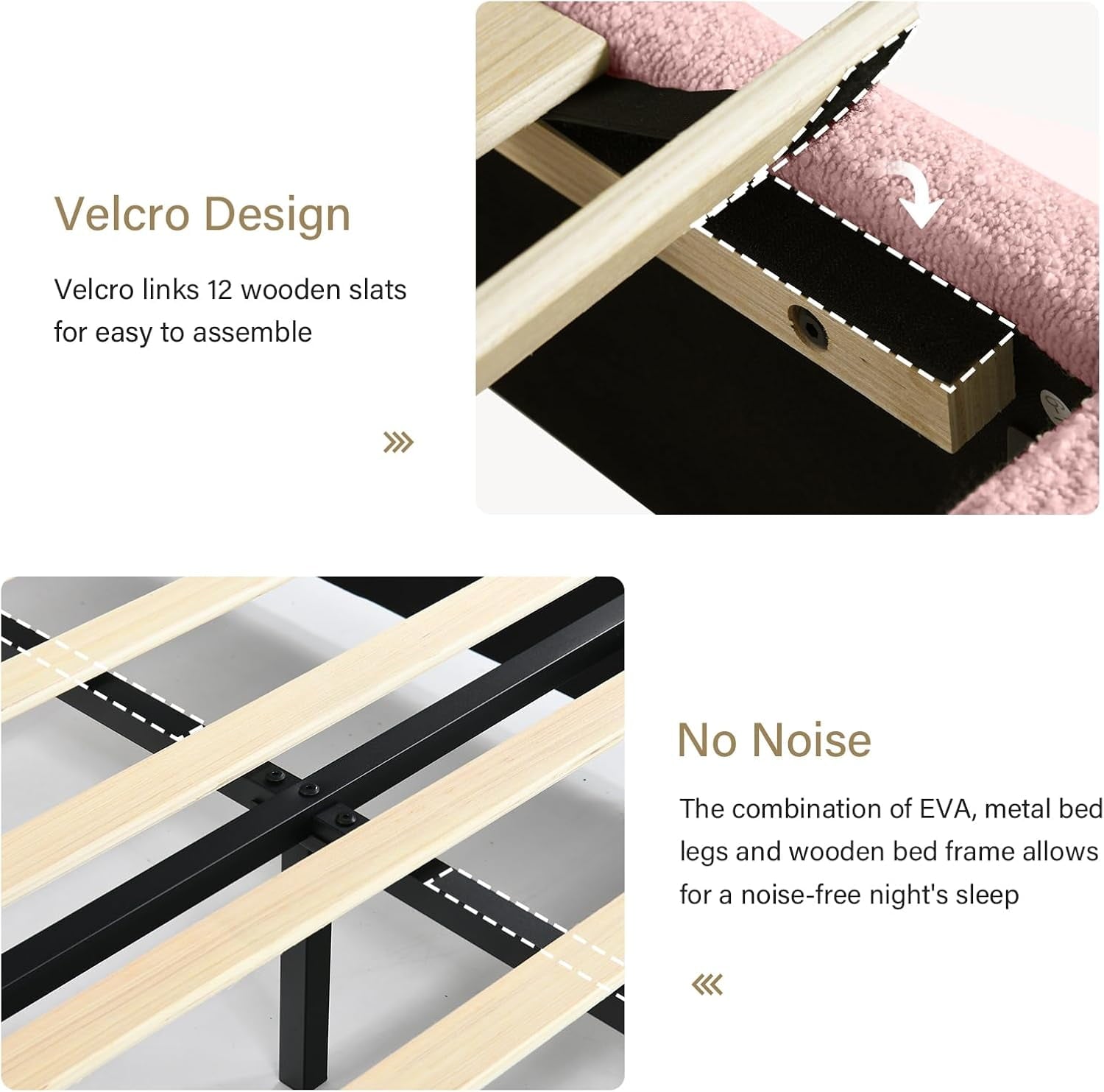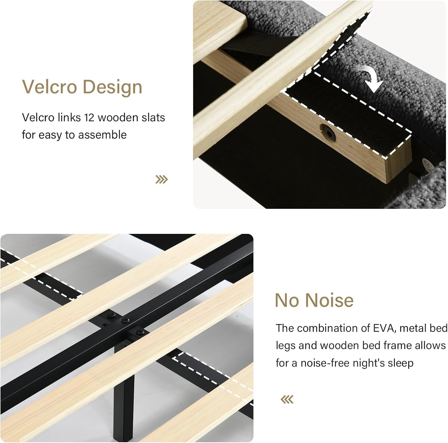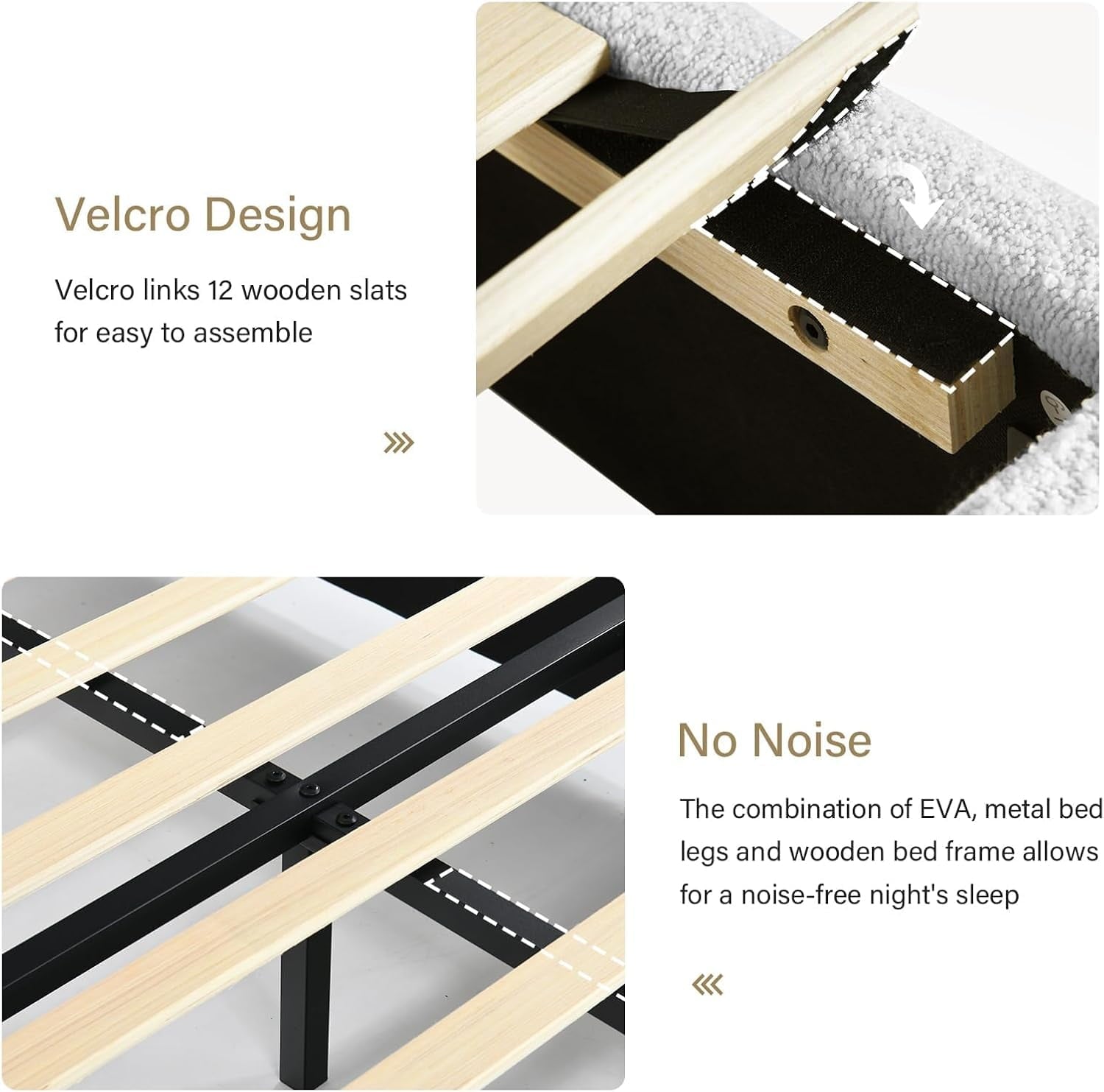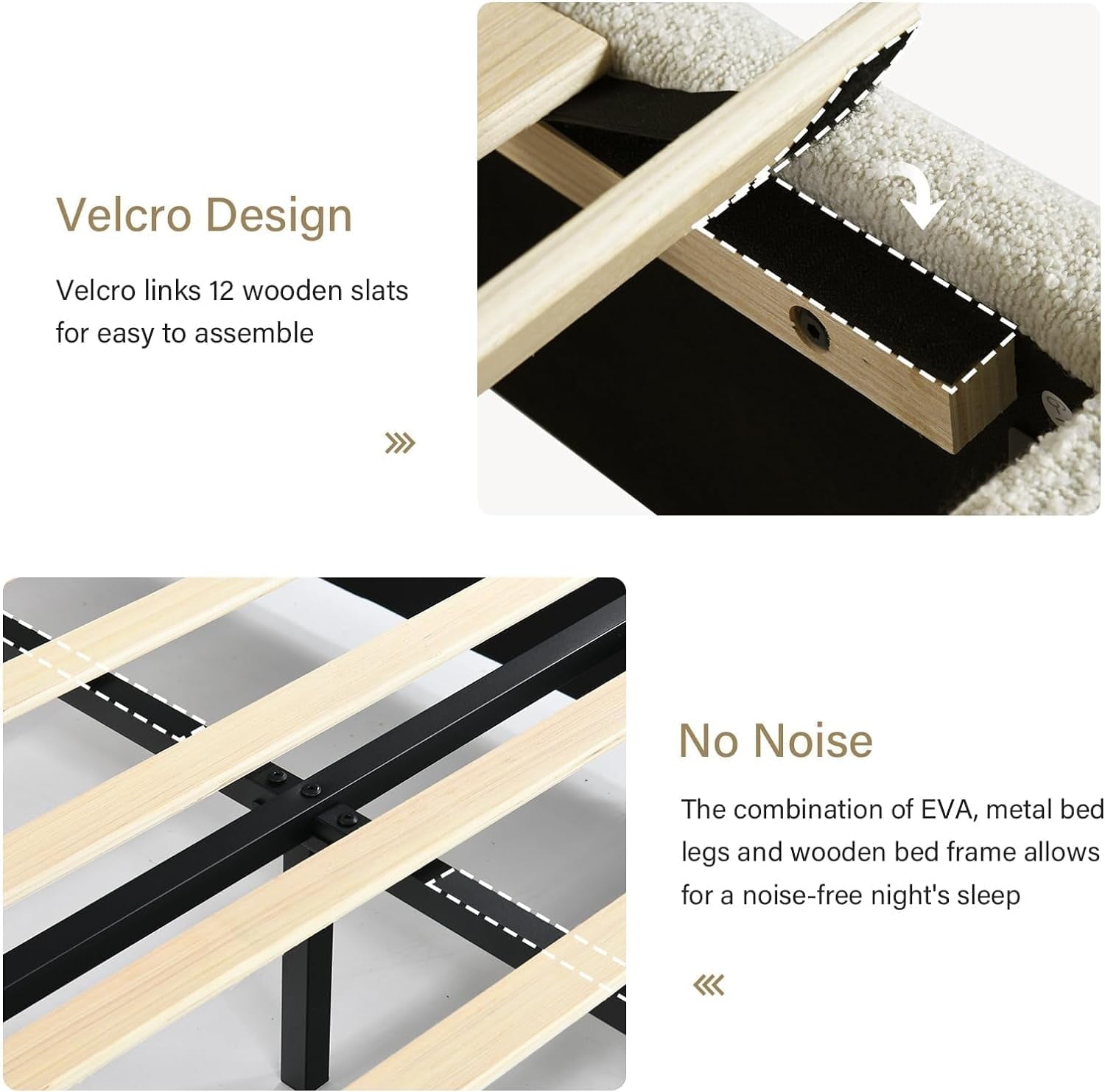 - Rounded Curved Headboard Design —– The twin bed frame with soft round curved headboard design, This upholstered platform bed is made of boucle fabric, with contemporary and warm feel, making it a perfect addition to any bedroom.