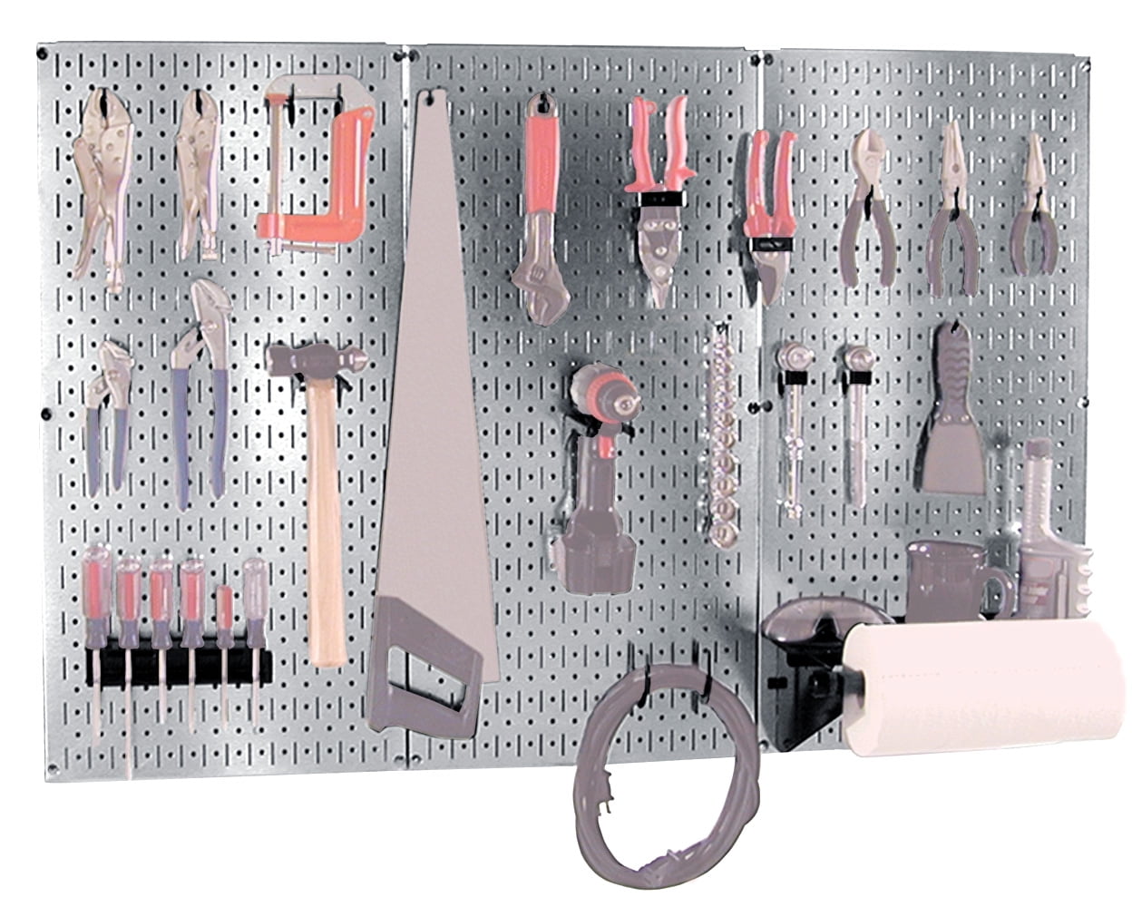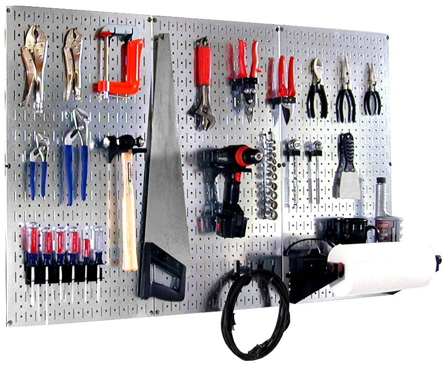 The Metal Pegboard Basic Workbench Tool Storage Organizer Kit offers maximum tool board storage versatility and strength. The three 16in x 32in Galvanized steel pegboard panels combine for a total tool storage area of 48in x 32in, or over 10 Square Feet of pegboard storage space. These attractive Metal Pegboard Panels are great for heavy duty toolboard storage needs due to their 20 gauge steel construction which makes them over 10 times stronger than conventional pegboard creating an industrial grade tool storage solution that will last a lifetime. The Wall Control metal pegboard panels offer both slots and holes to accept slotted tool board accessories as well as conventional 1/4in peg board hooks making this pegboard extremely versatile by offering the user multiple options with toolboard and pegboard accessory selection. The patented engagement of the slotted tool board hooks included improves hook security for more hassle free tool storage. These versatile, durable, and high strength metal pegboard panels are an easy-to-use tool storage solution for any garage, shop, or tool crib. The galvanized steel pegboard panels are easy to install into studs or flat surfaces with pre-drilled mounting holes on 16? centers. A built-in frame return flange provides ample hook clearance and full access to all holes without requiring additional framework or using up pegboard holes for mounting. Mounting hardware is also included. The Metal Pegboard Basic Tool Storage Organizer Kit Includes: (3) Galvanized Metal Pegboard Panels 32 in. x 16 in. (Covers 48 in. x 32 in. when Installed), (1) Dowel Rod and 4 in. Shelf Assembly, (1) Screwdriver Holder, (2) Hammer Holders, (2) U-Hooks with 3 in. Reach, Assortment of (18) Additional Hooks and Brackets Slotted Toolboard Accessories are in. Black Tools and tool sets not includedSteel Pegboard Kit Includes Assortment of Wall Control Slotted Hooks, Pegboard Accepts 1/4in Pegboard Pegs, Pegboard Accepts Magnets, 10 Times Stronger Than Conventional Pegboard,