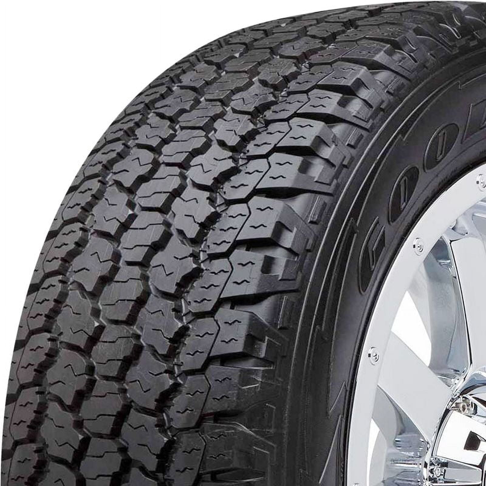 The Goodyear Wrangler All-Terrain Adventure with Kevlar is a premium all-terrain tire specially designed for drivers who are looking for off-road versatility, durability, and comfort. It features a specialized, strong rubber tread compound molded into a multi-faceted symmetric tread pattern. The combination of both the compound and the pattern gives the tire a rugged and aggressive look. To help clear mud and snow are the open shoulder blocks and outboard circumferential grooves. The sidewall rubber compound is made with Goodyear’s Durawall Technology which makes the polyester cord resistant to punctures, scuffing, and cuts. It is branded with the mountain/snowflake symbol which means it has passed the auto industry’s severe snow service standards. Comes with a 60,000 Miles Warranty.Set of 4 Goodyear Wrangler All Terrain Adventure With Kevlar LT245/70R17 119R A/T Tires 748469572 / 245/70/17 / 2457017