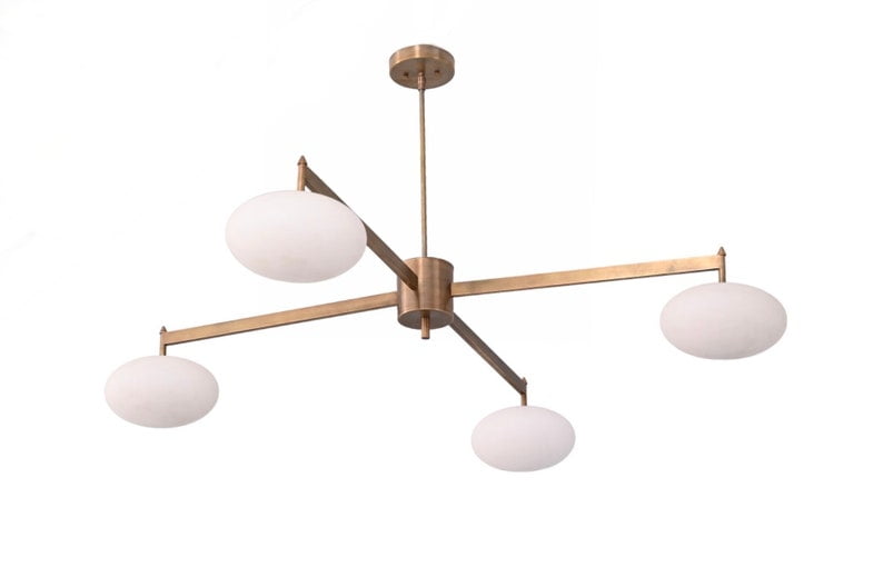 - Handcrafted Raw Brass with Elegant Matte White Globes Made from pure raw brass, this chandelier boasts a 52” diameter and 25” height. It features 8” matte white globes that add a sophisticated touch to any interior.