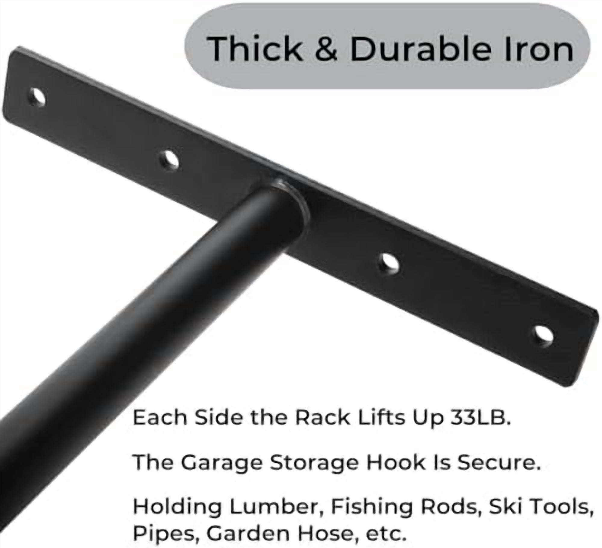 High Quality: Made of thick sturdy and durable iron, each side of our double ladder ceiling racks can lift up 33lb. The weld between the hook and bracket is strong, ensuring that the garage storage hook is secure and can last for a long time.