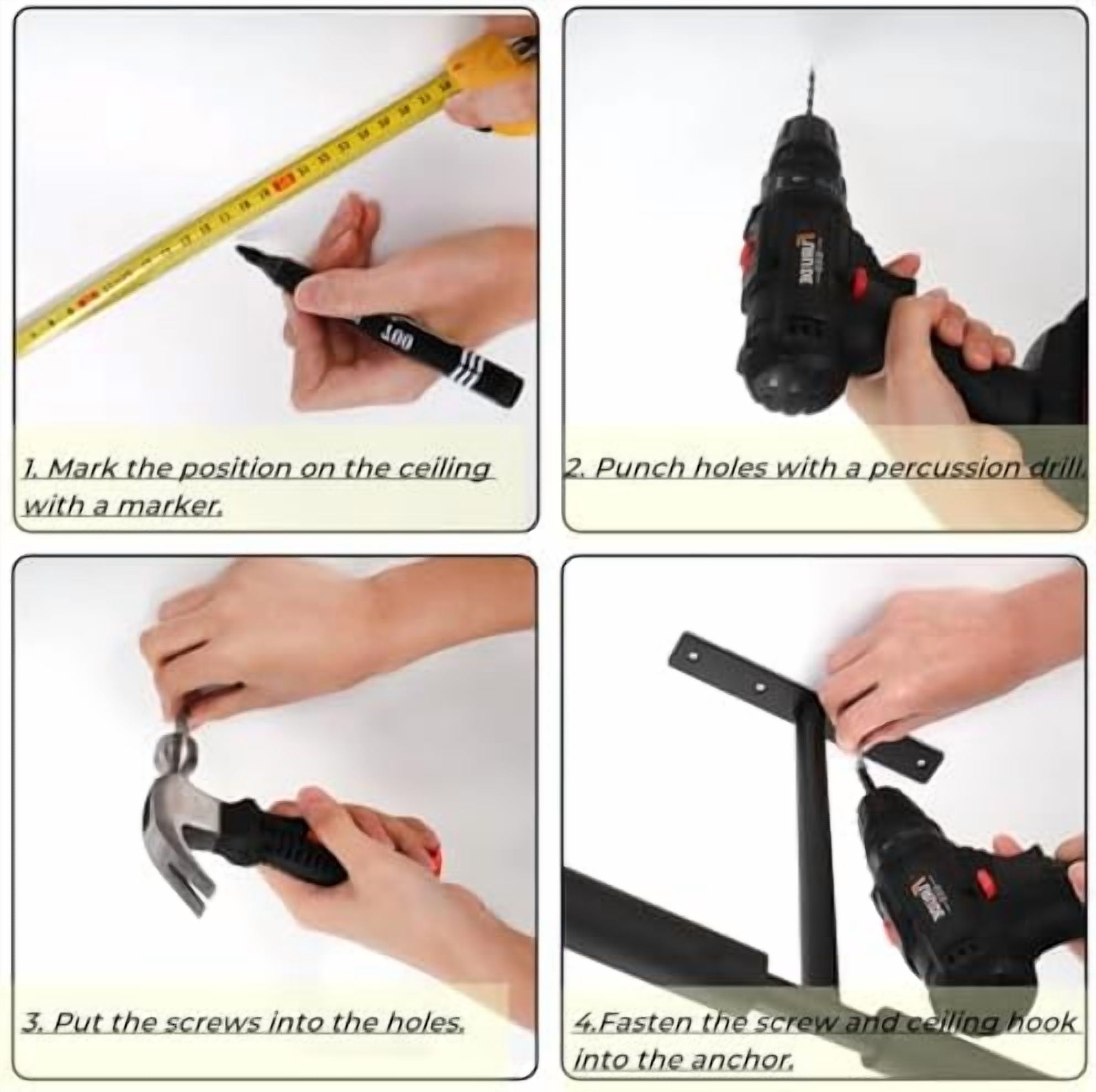 Easy to Install: Mark the holes on the ceiling, punch the holes, place the expansion anchors in the holes, tighten the screws with a screwdriver and then you will get a completed and fixed ceiling hanger (expansion anchors and screws are included).