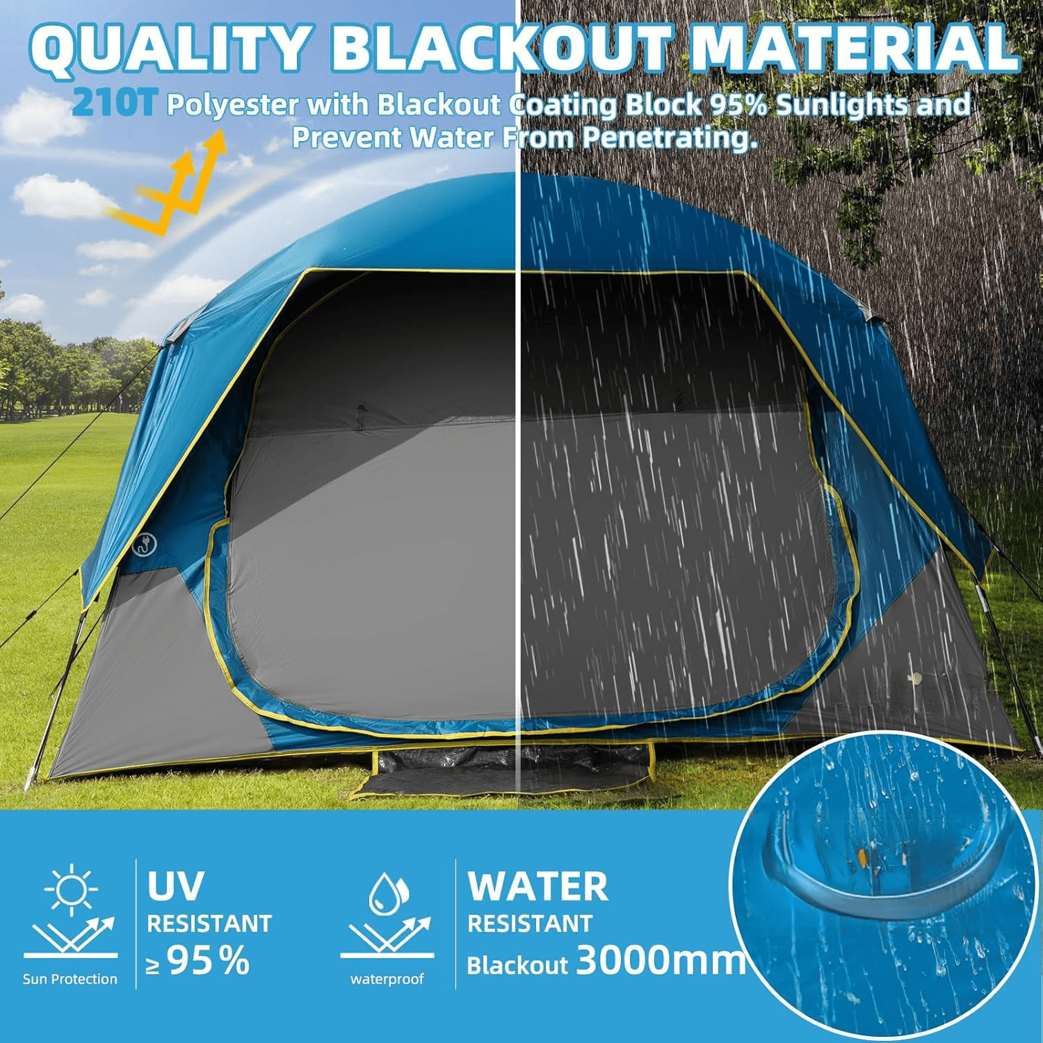 - Waterproof Fabric: 4 person dome family tents for camping are made of high-quality and durable polyester with coating blackout 3000mm waterproof, which keep the tent interior dry and comfortable. Door and window are used high standard zipper to ensure close & open smoothly. 9.5mm strong fiberglass poles it is not only wear-resistant anti-tear, smooth feel not easy to wrinkle keep whole tent stable to make your family camping happy and comfortable.