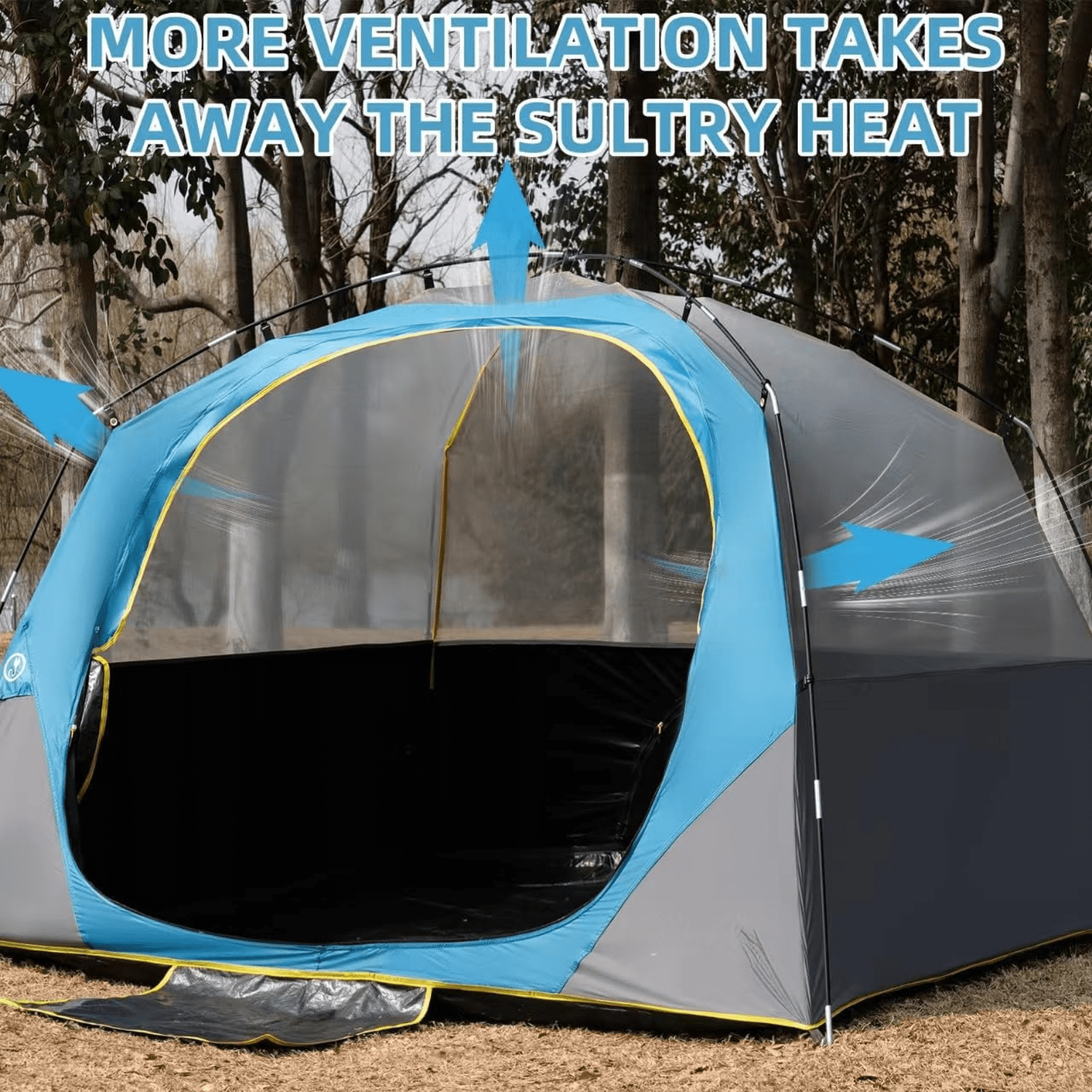 - VISIBILITY AND VENTILATION : This large camping tent designed with quality mesh for top roof, door and windows. 3 roof vents plus low side vent create “chimney effect” ventilation, zippered access allows campers to adjust the vents from inside the tent, and overhead net window for plenty of air flow and heat dissipation for the instant cabin tent. You will enjoy the panoramic view from tent window and take pleasure in watching starry sky when you lying in tent with your families.