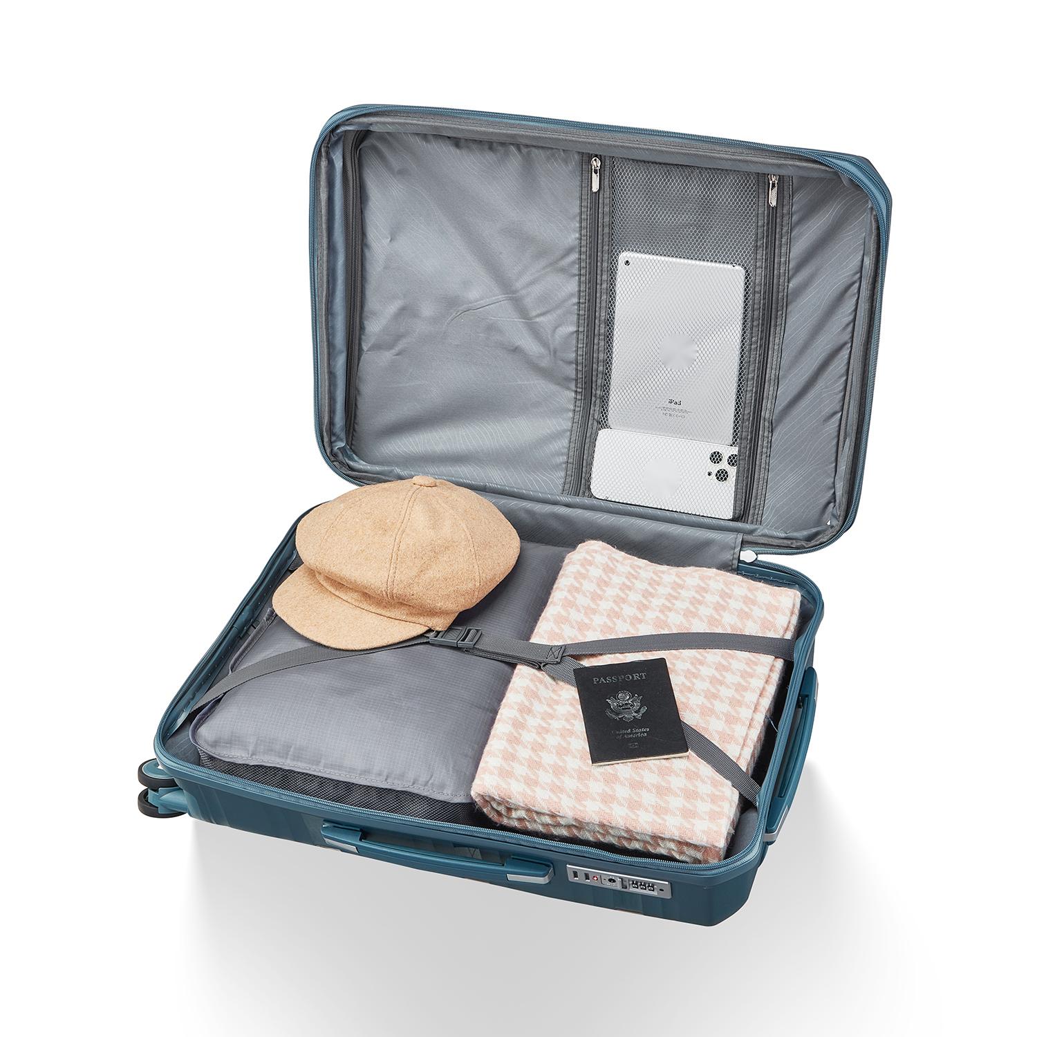 • 【Full interior space】Travel luggage with fully lined interior has adjustable tie-down straps for securing garments in place.This roller suitcase has reinforced padded top and side handles to make it easier to lift and carry your luggage.