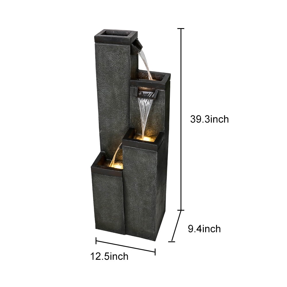 - IDEAL SIZE: Dimensions:12.5″L x 9.4″W x 39.3″H. the perfect size for any indoor/outdoor setting.PACKAGE INCLUDED – 1 x Outdoor Fountain, 1 x Plug for Light, 1 x Plug for Pump, 1 x Instruction.