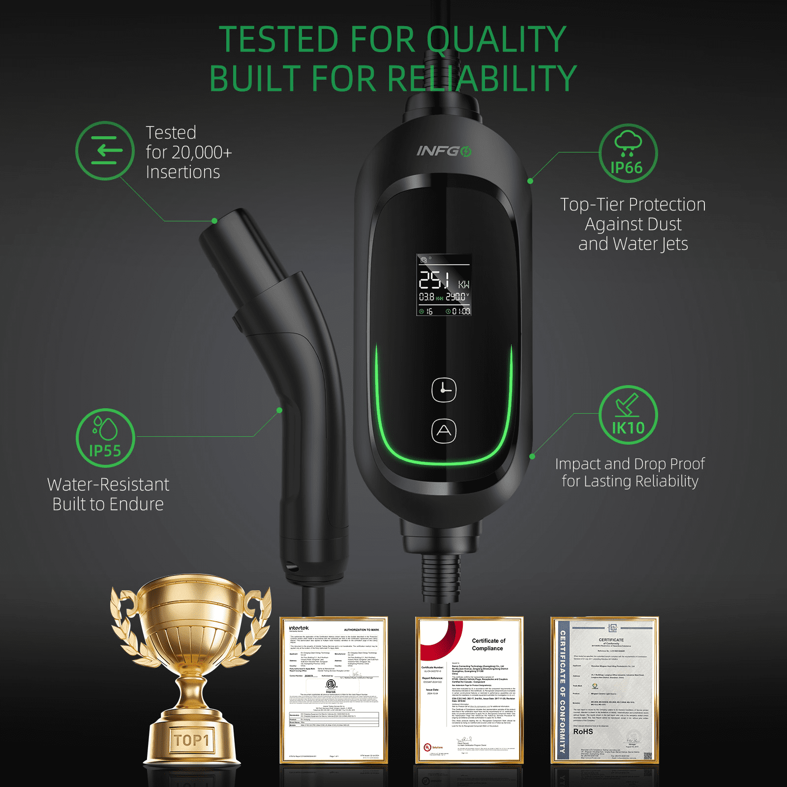 - Durable, Safe, and Reliable Performance: Built to last, INFGO Tesla charger features high-conductivity copper wiring, a flame-retardant TPE jacket, and is IP66 waterproof. With a 3-year warranty, it’s engineered to endure extreme temperatures and provide reliable, long-lasting performance.