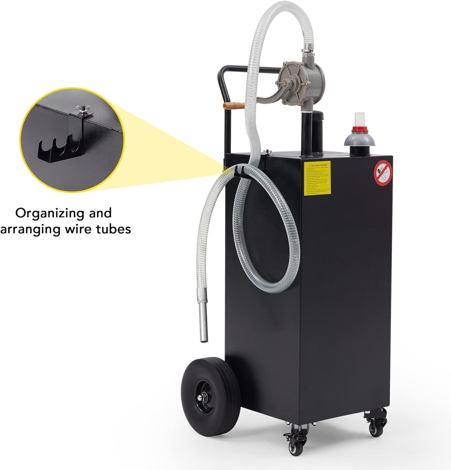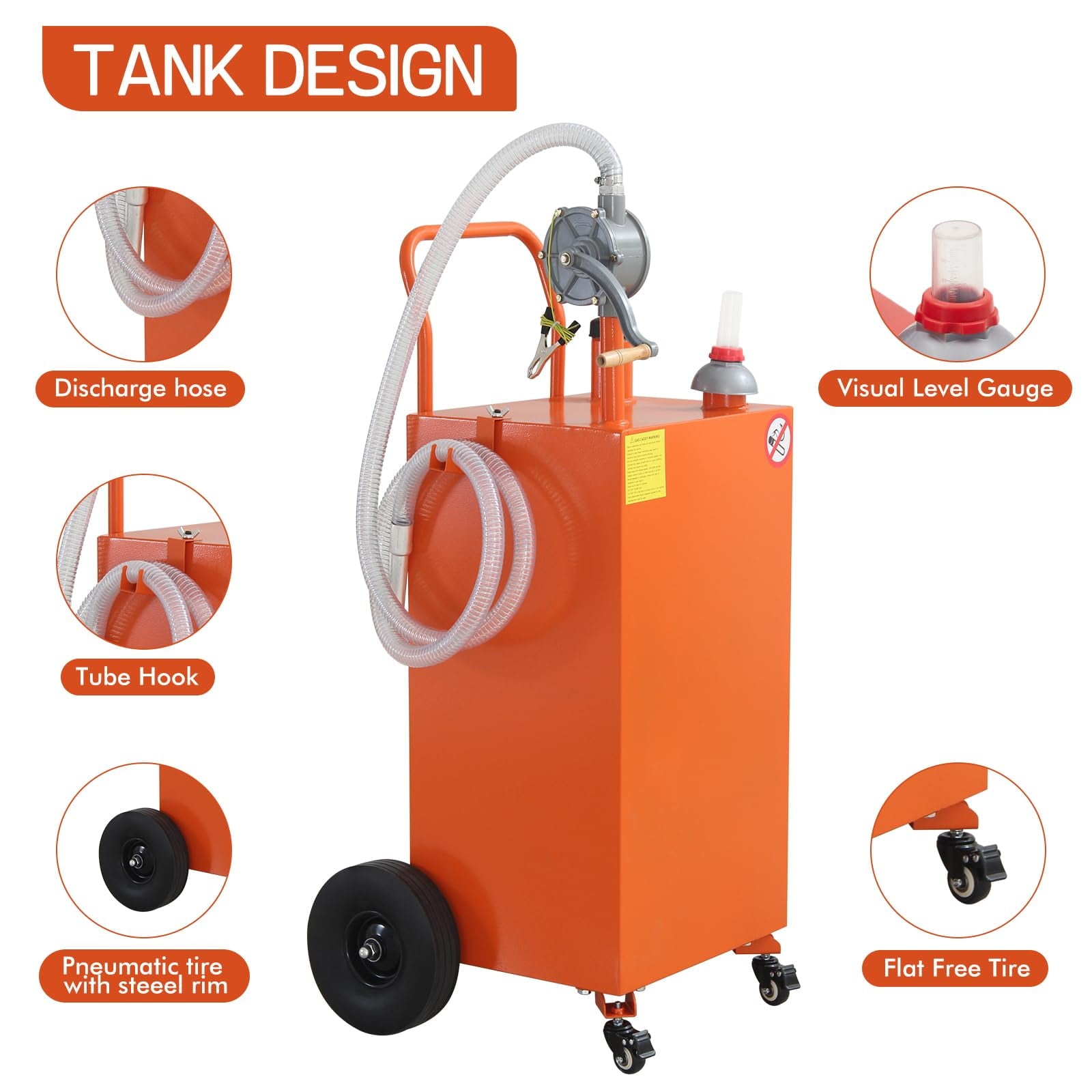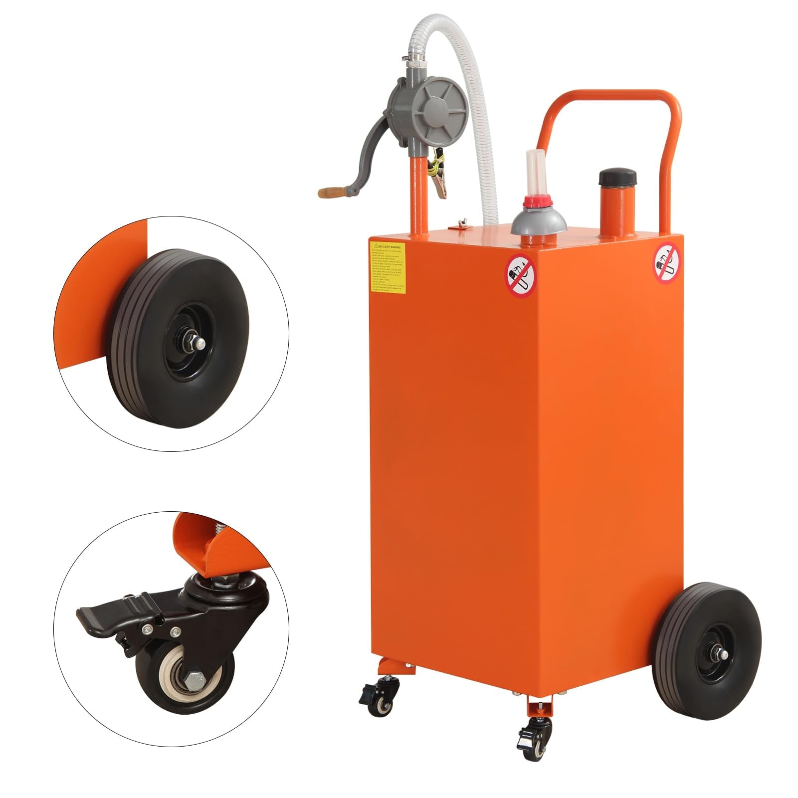 • with Wheels: Designed with heavy-duty, flat-free tires for effortless transport, along with brake casters for added anti-skid support, this gas caddy ensures excellent portability and stability, preventing unwanted movement or slippage during refueling.