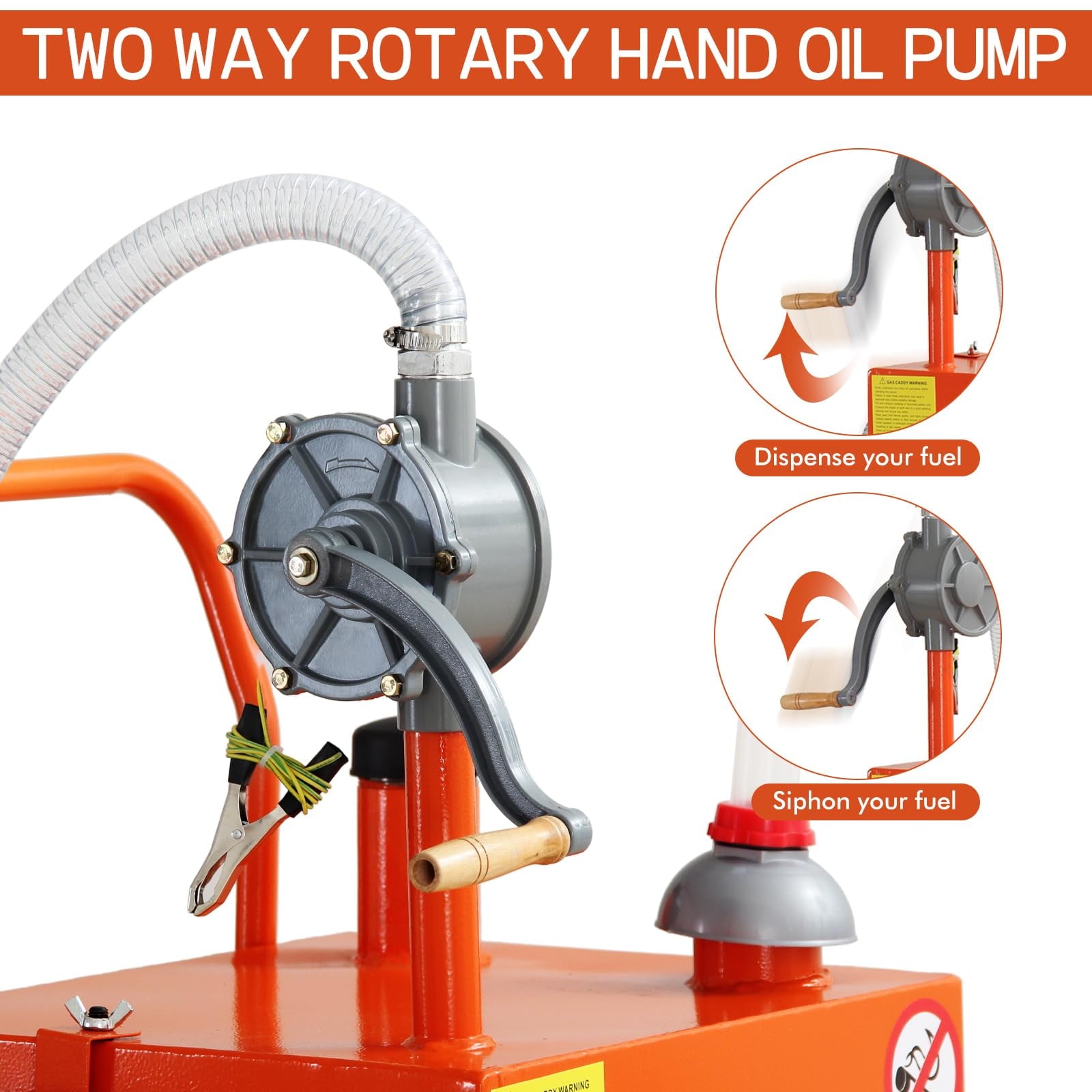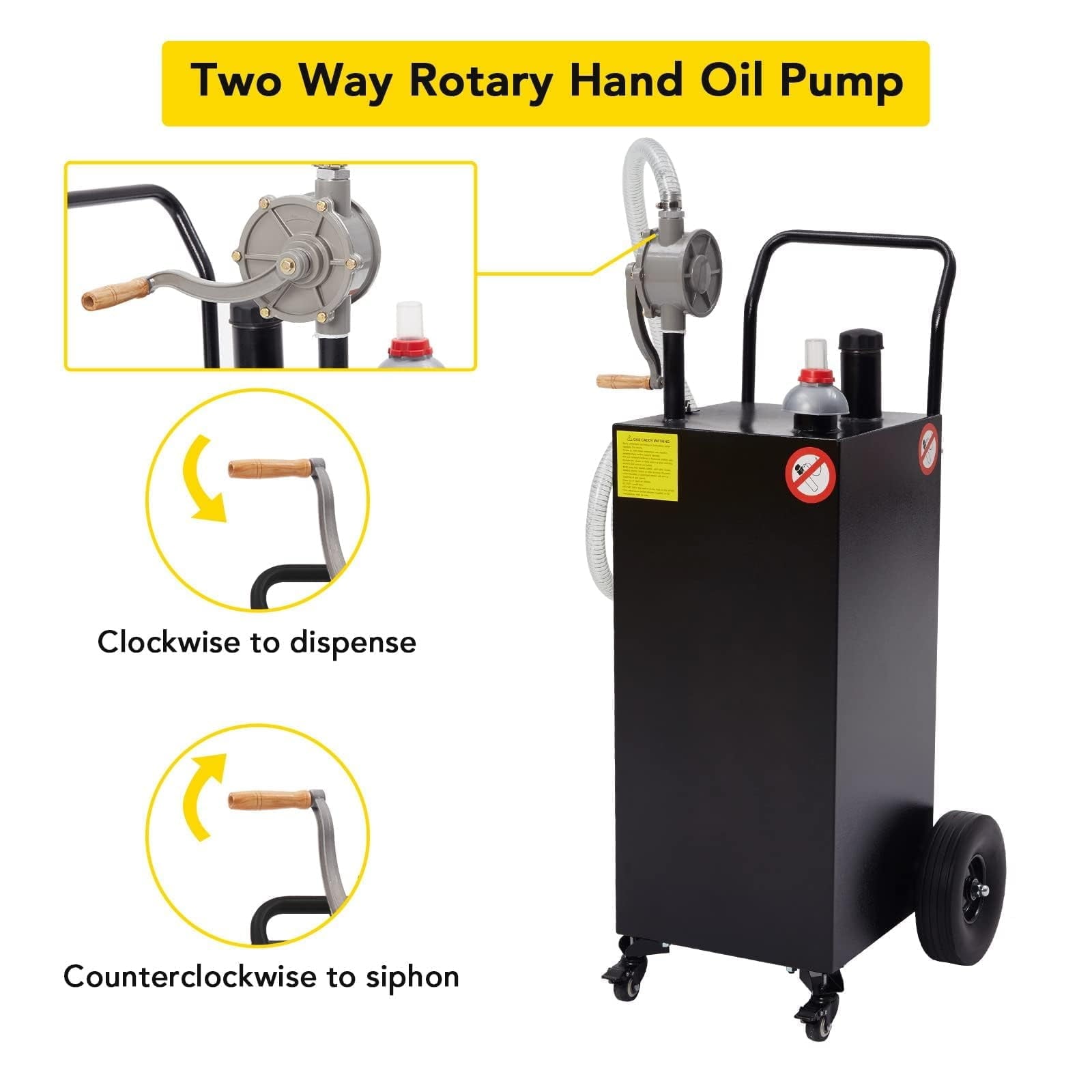 • Effective Pumping Mechanism: Equipped with a dual-function rotary pump, this caddy facilitates easy dispensing and siphoning of fuel, ensuring efficient refills. The wide fill neck minimizes spillage during refueling, enhancing fuel efficiency and reducing waste.